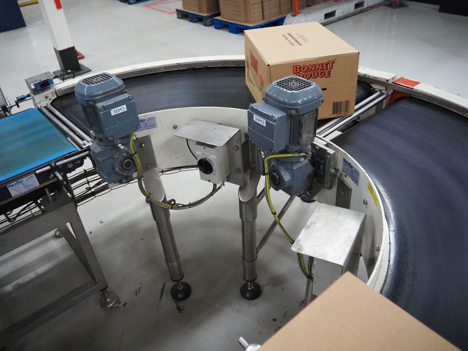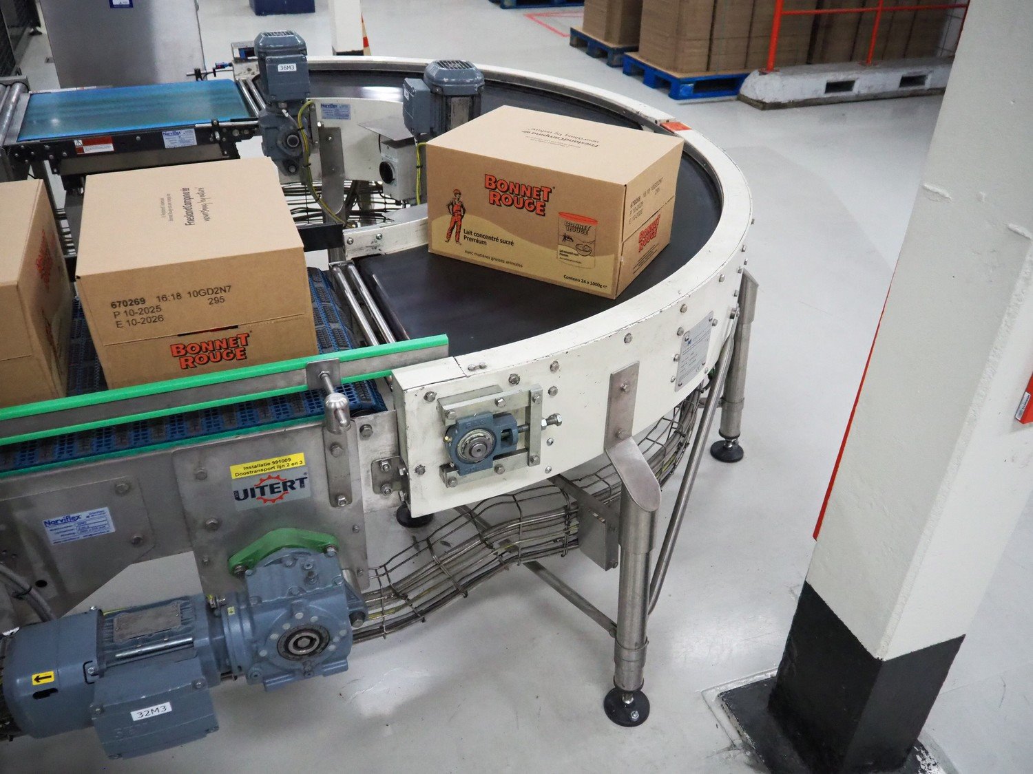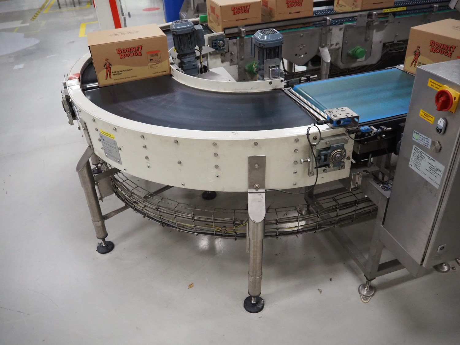 Kramer&Duyvis 180° curve conveyor, type+angle: (2x) R100 90°, plastic belt, belt width: 480 mm, total dimensions: 1200 mm x 2400 mm x 1200 mm. Kavel locatie: P. Stuyvesantweg 1, 8937 AC Leeuwarden, Nederland