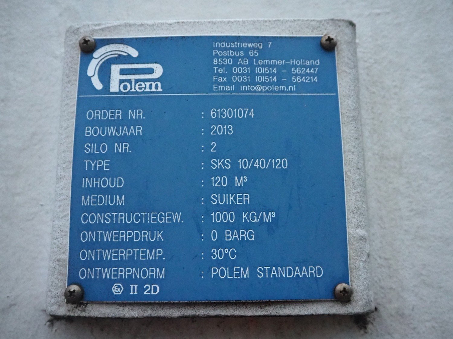 Polem plastic sugar silo, type: SKS 10/40/120, year of construction: 2013, volume: 120 m³, construction weight: 1000 kg/m³, dimensions: ø 3900 mm x Kavel locatie: P. Stuyvesantweg 1, 8937 AC Leeuwarden, Nederland