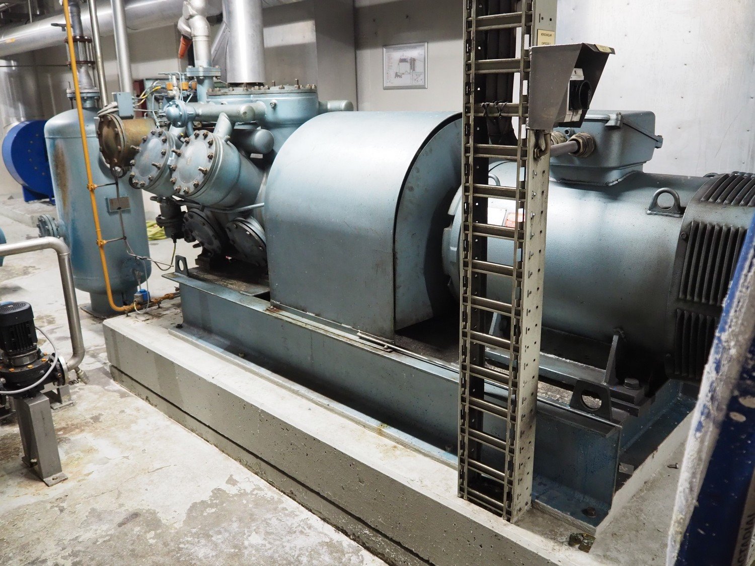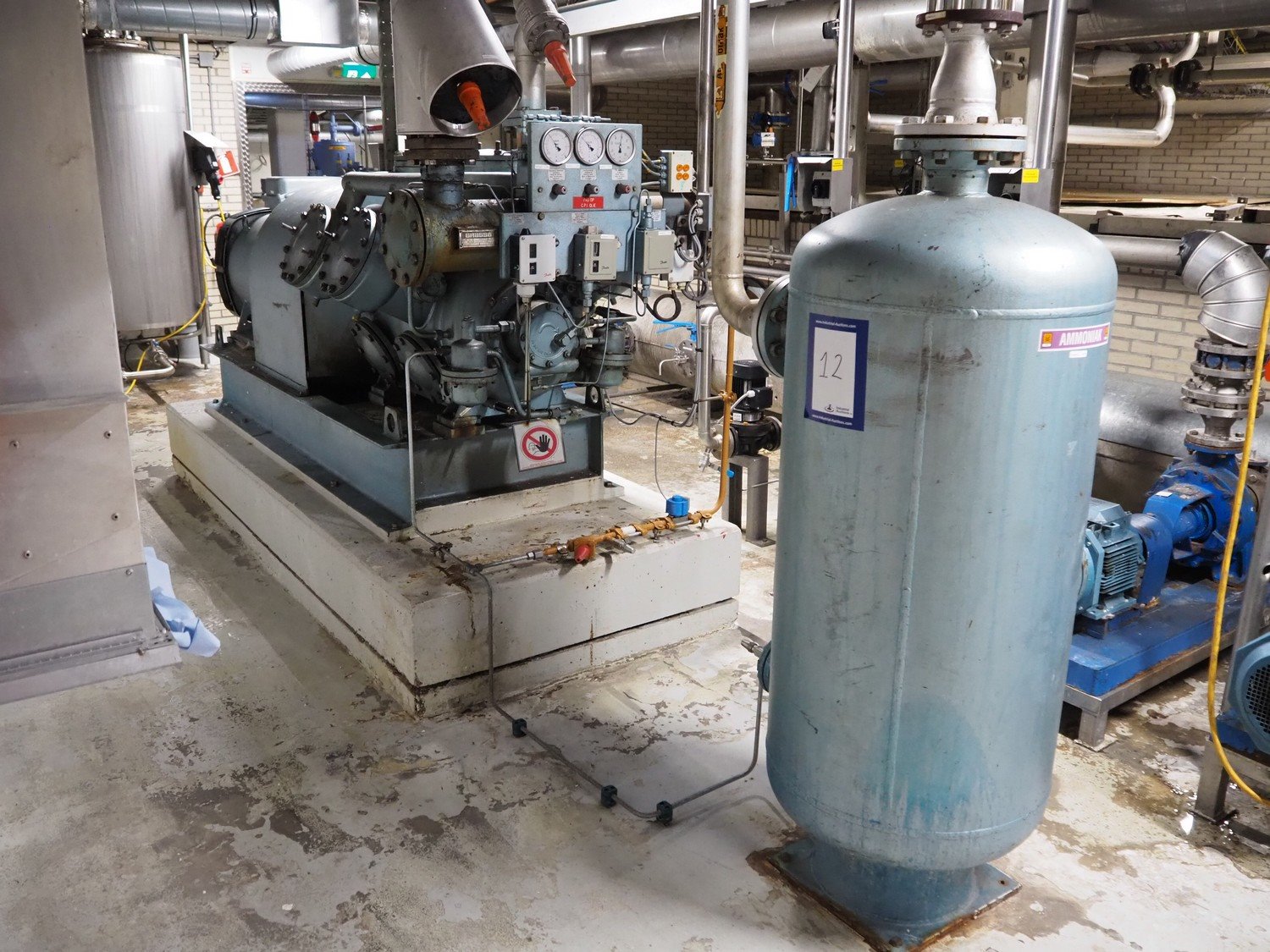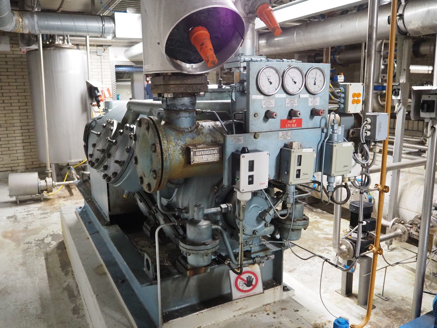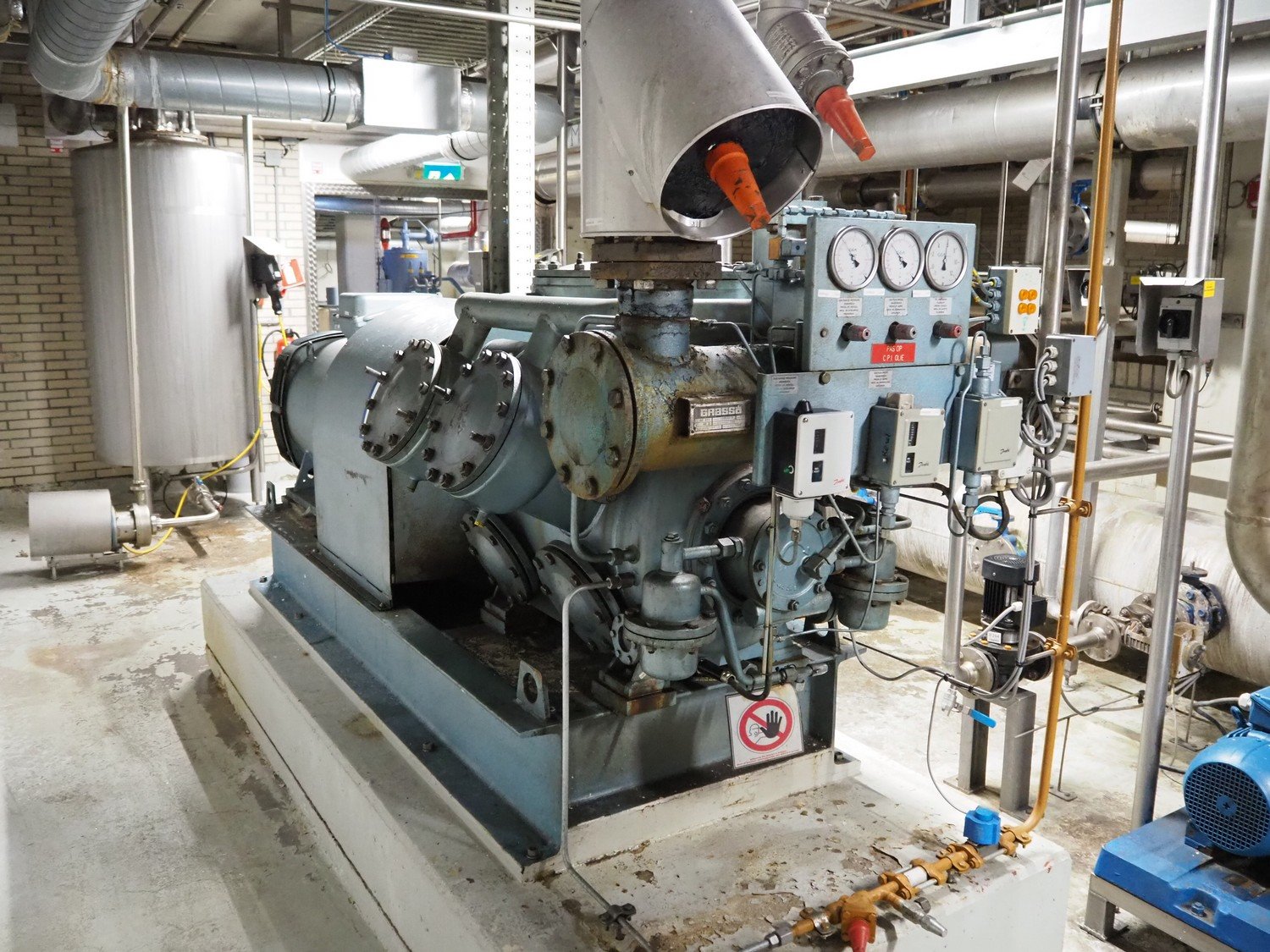 Grasso reciprocating cooling compressor, type: RC 611, serial number: 92061513, year of construction: 1992, max volume flow rate: 798 m³/h, max design pressure: 21 bar, max speed: 1000 rpm, refrigerant: NH3, with Leroy Somer motor, power: 160 kW, dimensions cooling compressor: 3100 mm x 1100 mm x 1800 mm, dimensions pressure vessel: 700 mm x 700 mm x 1600 mm, dimensions switch cabinet: (2x) 800 mm x 600 mm x 2200 mm. If desired, the concrete base is included, but this is not mandatory, dimensions concrete base: 3050 mm x 1200 mm x 350 mm. Kavel locatie: Kanaalstraat 4-6, 7241 DA Lochem, Nederland