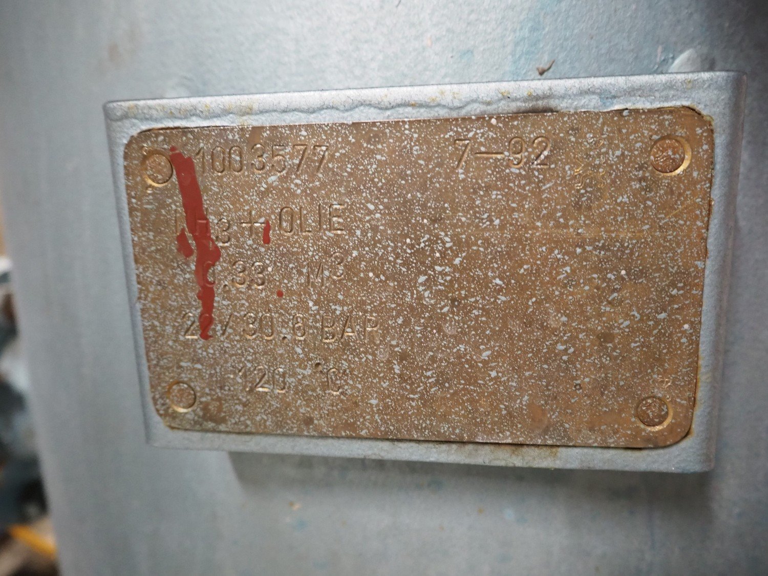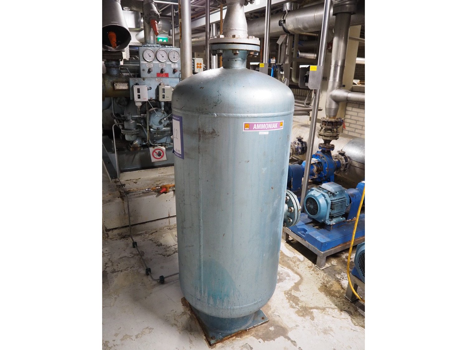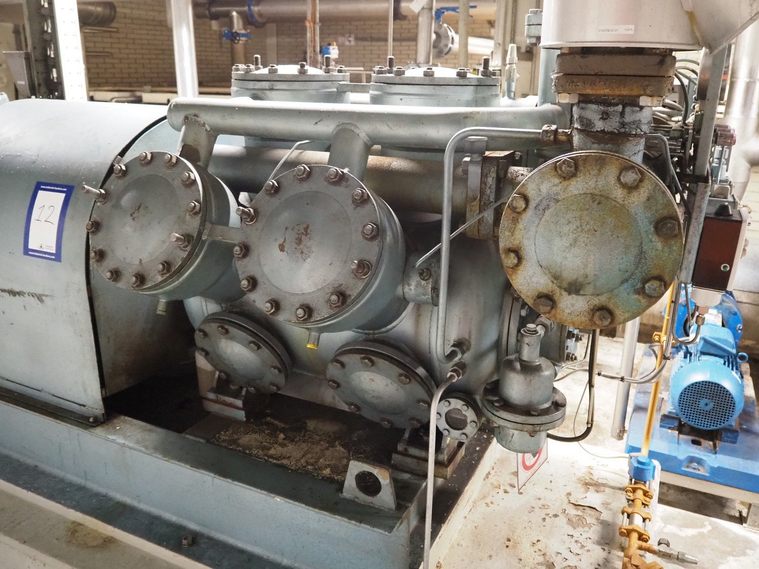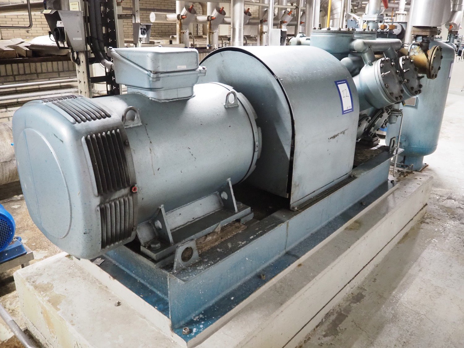 Grasso reciprocating cooling compressor, type: RC 611, serial number: 92061513, year of construction: 1992, max volume flow rate: 798 m³/h, max design pressure: 21 bar, max speed: 1000 rpm, refrigerant: NH3, with Leroy Somer motor, power: 160 kW, dimensions cooling compressor: 3100 mm x 1100 mm x 1800 mm, dimensions pressure vessel: 700 mm x 700 mm x 1600 mm, dimensions switch cabinet: (2x) 800 mm x 600 mm x 2200 mm. If desired, the concrete base is included, but this is not mandatory, dimensions concrete base: 3050 mm x 1200 mm x 350 mm. Kavel locatie: Kanaalstraat 4-6, 7241 DA Lochem, Nederland