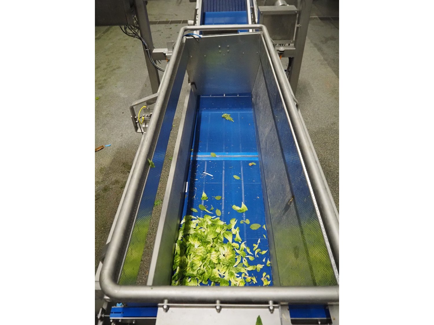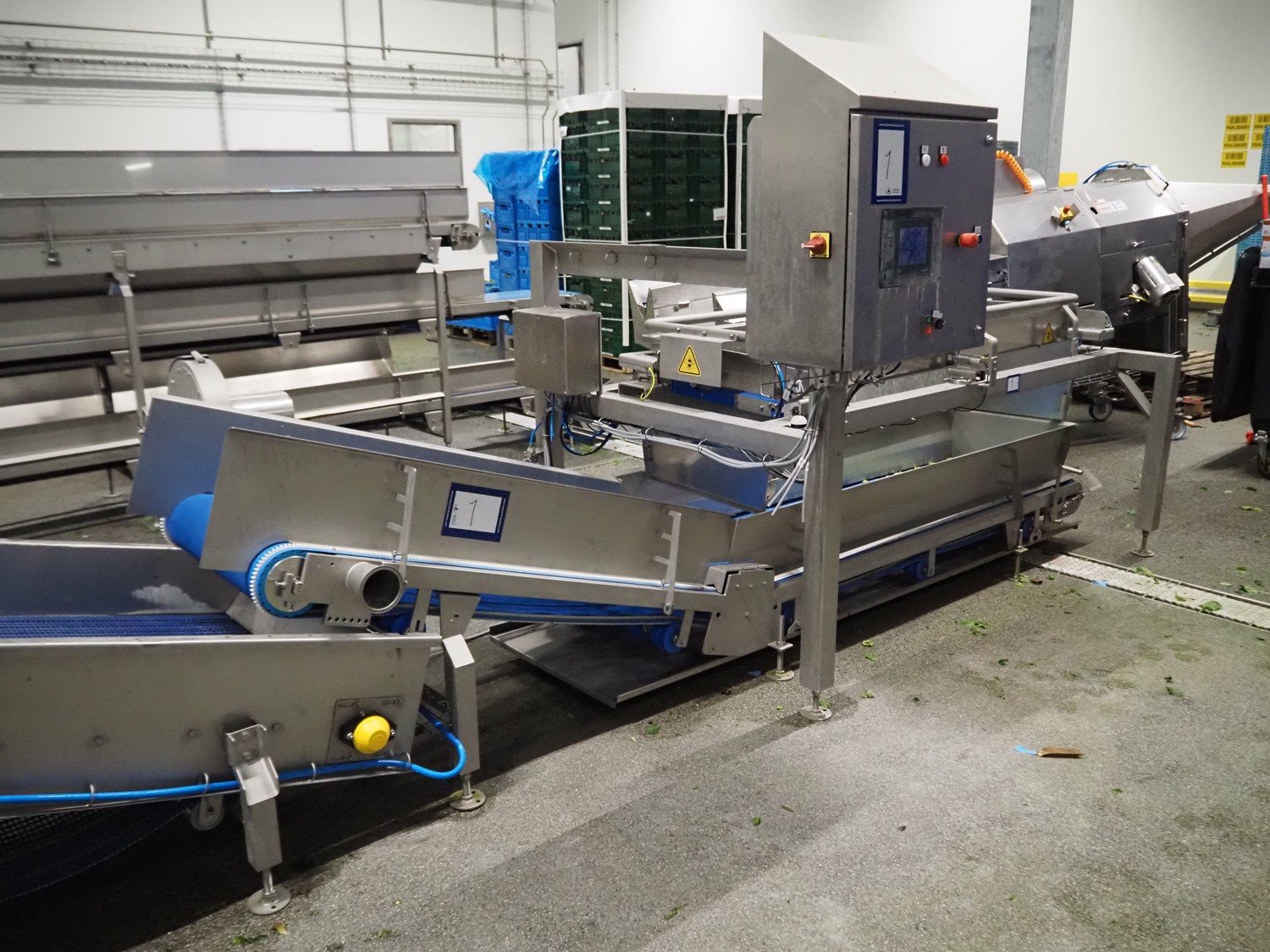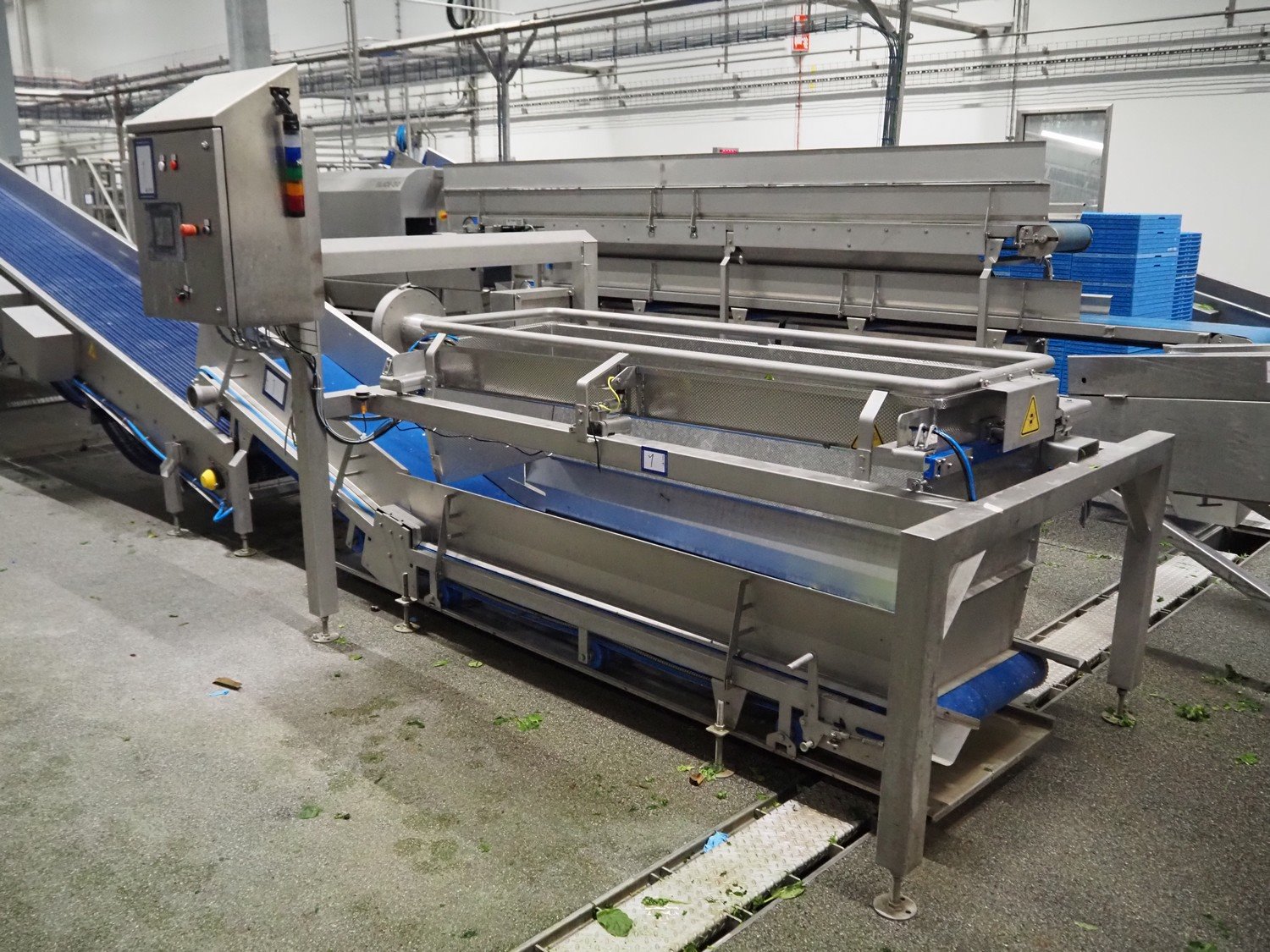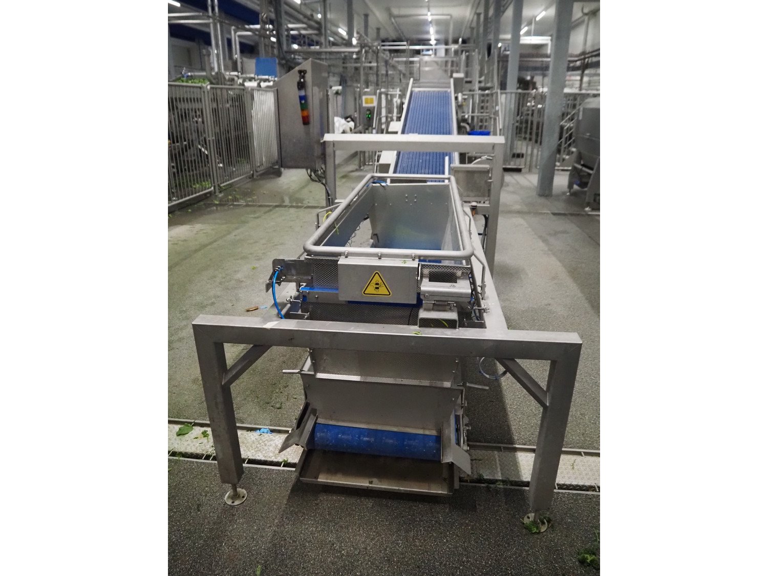 JBT FTNON B.V. weighing hopper with outfeed belt, dimensions hopper: 2500 mm x 1800 mm x 2000 mm, plastic mesh belt, belt width: 600 mm, elevating height: 800 mm, total dimensions outfeed belt: 4000 mm x 1300 mm x 950 mm. Incomplete, technical condition unknown. Kavel locatie: Maarten de Vriesstraat 3, 5975 RW Sevenum, Nederland