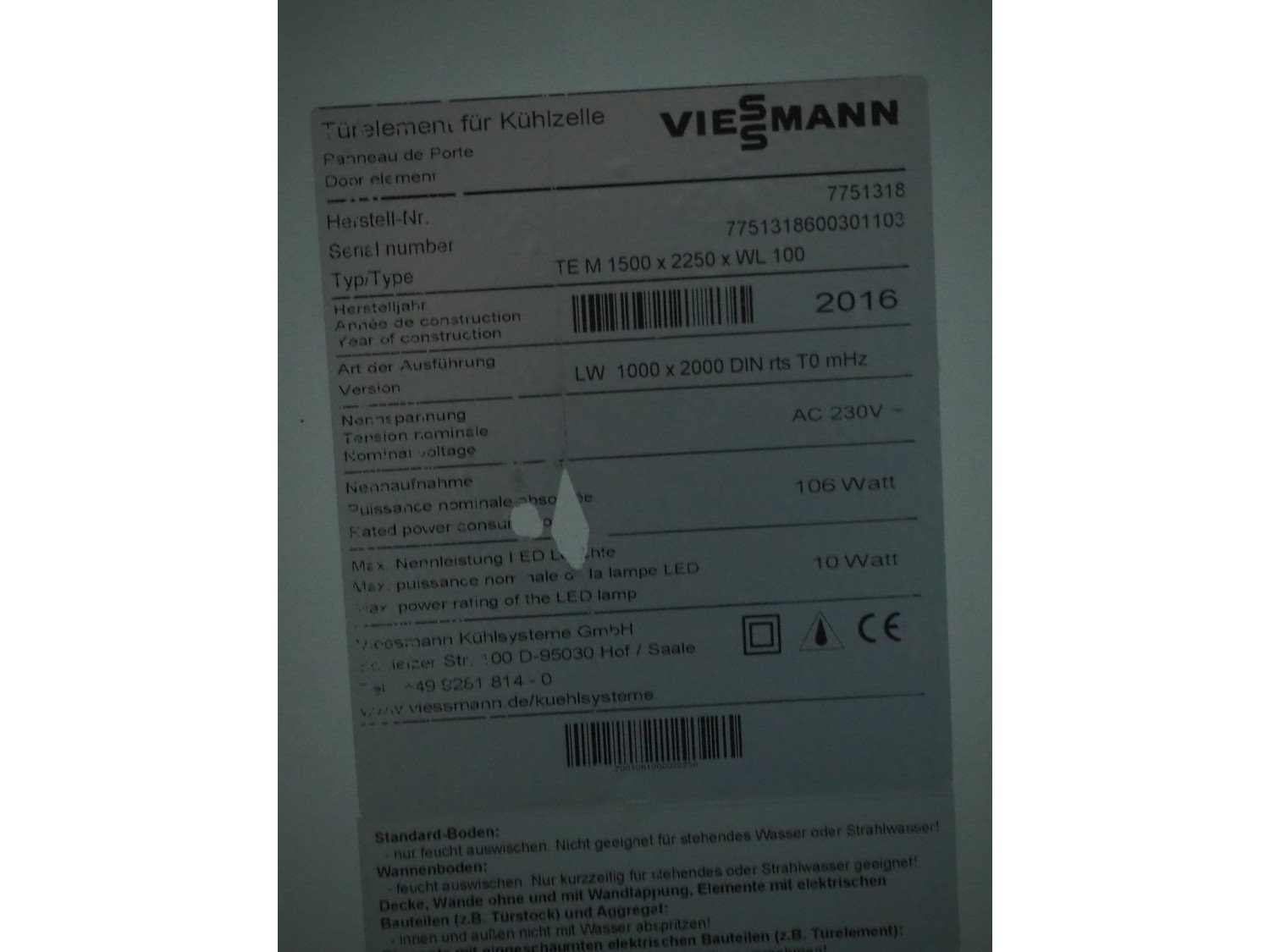 Viessmann cooling cell, type: TE M 1500 x 2250 x WL 100, year of construction: 2016, Walter Roller GmbH & Co. Evaporator, 2 fans, type: FHVT 602 EC, inside dimensions: 2200 mm x 3310 mm x 2260 mm, total dimensions: 2400 mm x 3650 mm x 2600 mm. Kavel locatie: Sprokkelveld 5, 6596 DH Milsbeek, Nederland