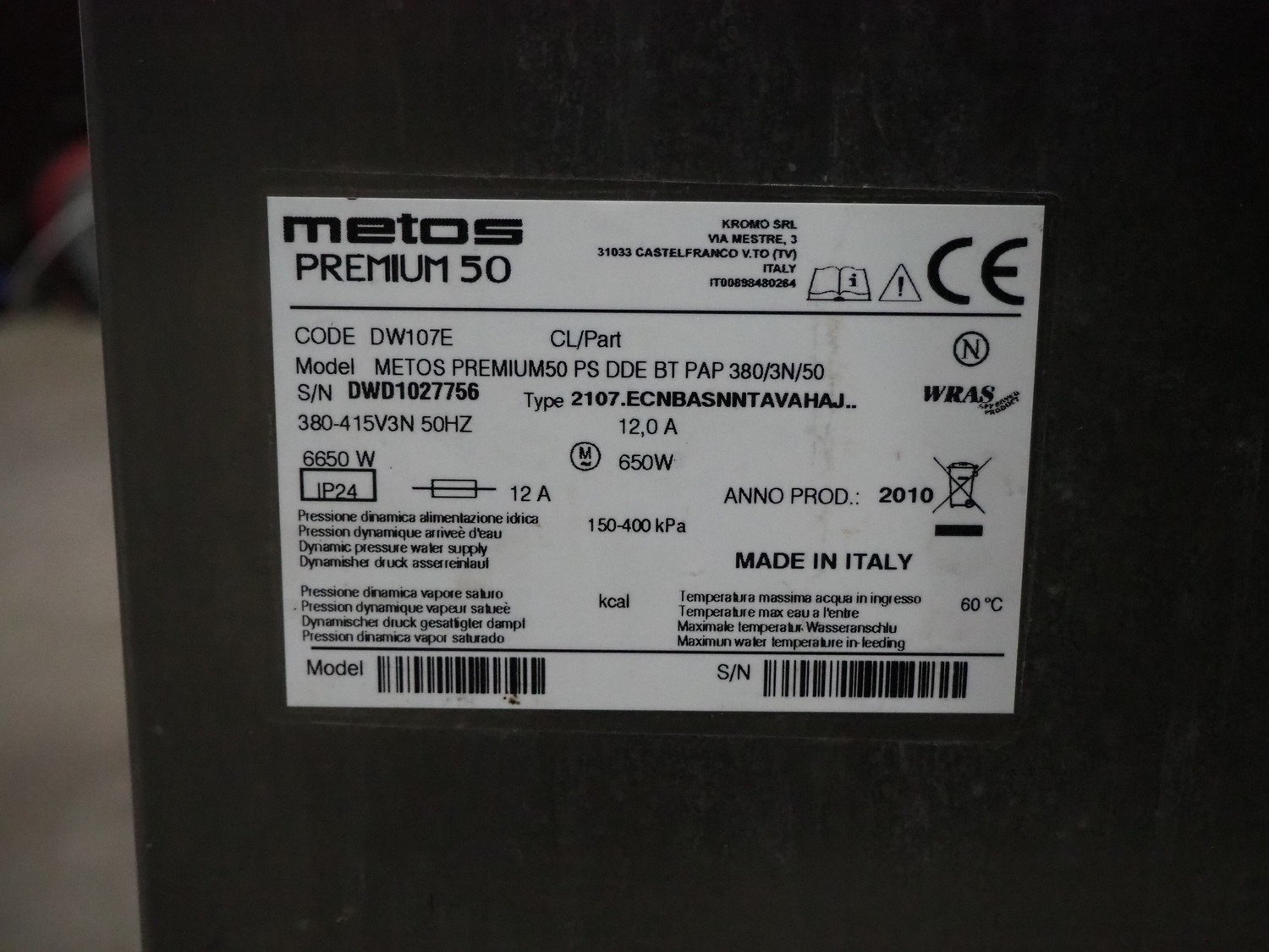 Metos dishwasher, model: METOS PREMIUM50 PS DDE BT PAP 380/3N/50, serial number: DWD1027756, year of construction: 2010, 380-415 V, 3 Ph, 50 Hz, 12 A, 6650 W, dimensions: 600 mm x 635 mm x 1340 mm. Kavel locatie: Sprokkelveld 5, 6596 DH Milsbeek, Nederland