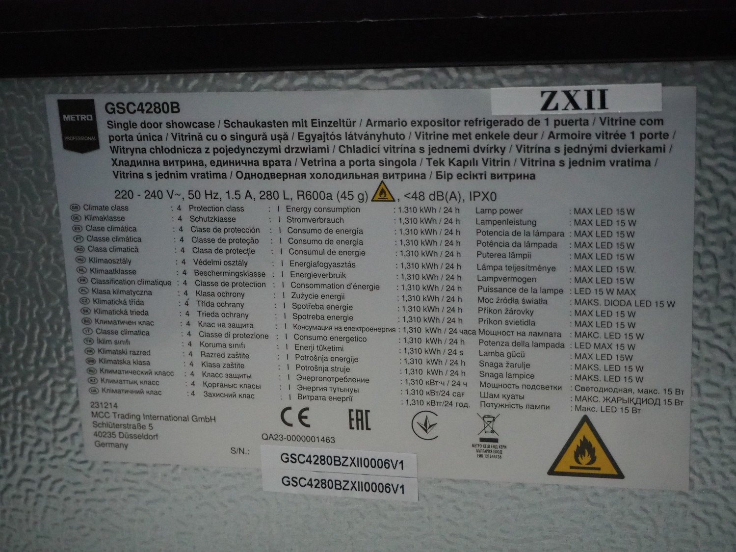 Metro refrigerator, type: GSC4280B, serial number: GSC4280BZXII0006V1, 220-240 V, 50 Hz, 1.5 A, refrigerant: R600a/45 g, 16 floors, dimensions floors: (16x) 330 mm x 510 mm, total dimensions: 595 mm x 540 mm x 1575 mm. Kavel locatie: Sprokkelveld 5, 6596 DH Milsbeek, Nederland
