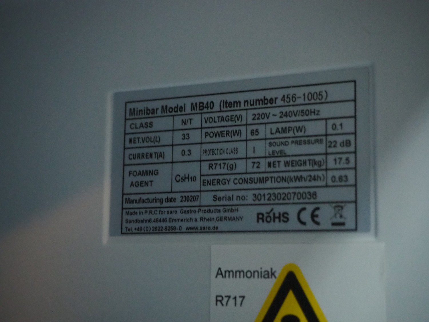 Saro minibar refrigerator, model: MB40, serial number: 3012302070036, year of construction: 2007, 220-240 V, 50 Hz, dimensions: 400 mm x 450 mm x 570 mm. Kavel locatie: Sprokkelveld 5, 6596 DH Milsbeek, Nederland