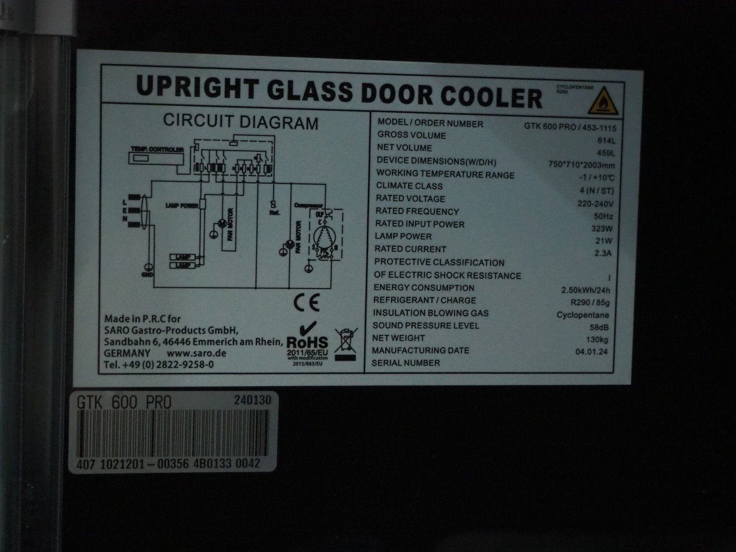 Saro refrigerator, model: GTK 600 PRO, year of construction: 2024, 220-240 V, 50 Hz, net volume: 459 litres, 5 floors, dimensions floors: (5x) 610 mm x 490 mm, total dimensions: 745 mm x 710 mm x 2010 mm. Kavel locatie: Sprokkelveld 5, 6596 DH Milsbeek, Nederland