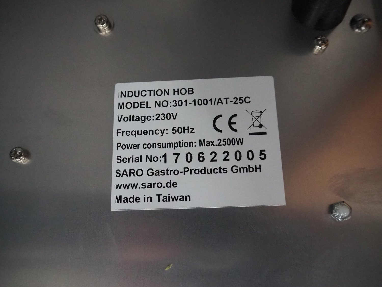 Saro induction plate, model: 301-1001/AT-25C, serial number: 170622005, 230 V, 50 Hz, 2500 W, dimensions: 420 mm x 330 mm x 105 mm. Kavel locatie: Sprokkelveld 5, 6596 DH Milsbeek, Nederland