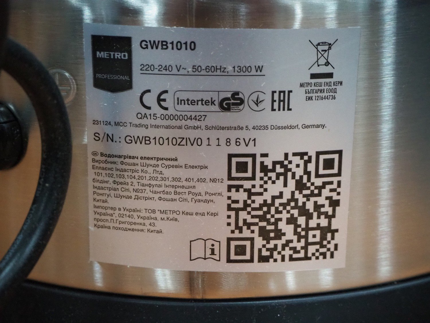 Metro coffee dispenser, model: GWB1010, serial number: GWB1010ZIV01186V1, 220-240 V, 50-60 Hz, 1300 W, volume: 10 litres, dimensions: 300 mm x 300 mm x 480 mm. Kavel locatie: Sprokkelveld 5, 6596 DH Milsbeek, Nederland