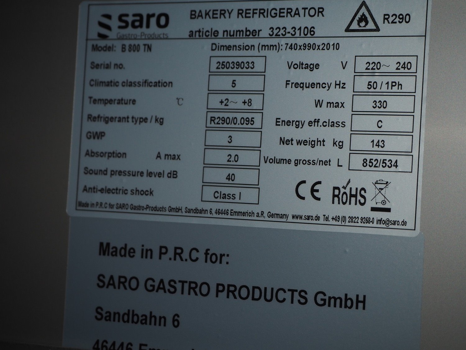 Saro bakery refrigerator, model: B 800 TN, serial number: 25039033, 220-240 V, 1 Ph, 50 Hz, refrigerant: R290/0.095 g, 10 floors, dimensions floors: (10x) 790 mm x 600 mm, total dimensions: 990 mm x 740 mm x 1875 mm. Kavel locatie: Sprokkelveld 5, 6596 DH Milsbeek, Nederland