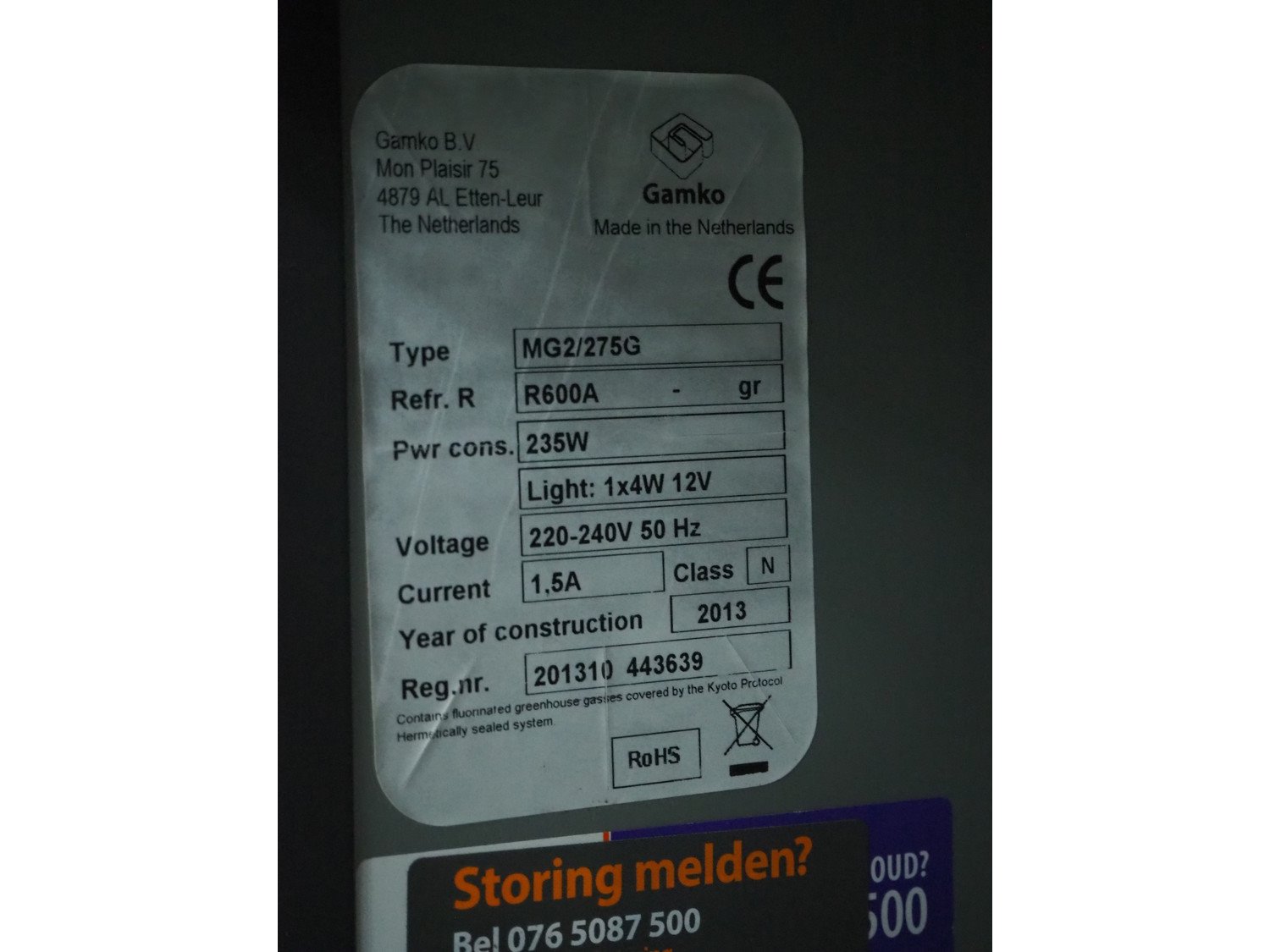 Gamko B.V. beverage showcase refrigerator, type: MG2/275G, year of construction: 2013, 220-240 V, 50 Hz, 1.5 A, 235 W, refrigerant: R600a, dimensions: 540 mm x 1200 mm x 900 mm. Kavel locatie: Sprokkelveld 5, 6596 DH Milsbeek, Nederland