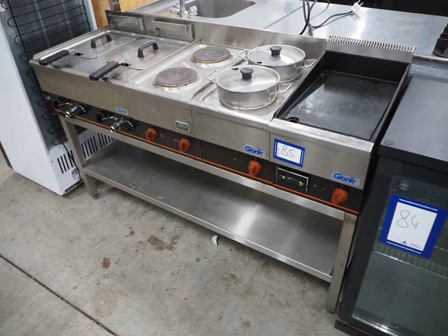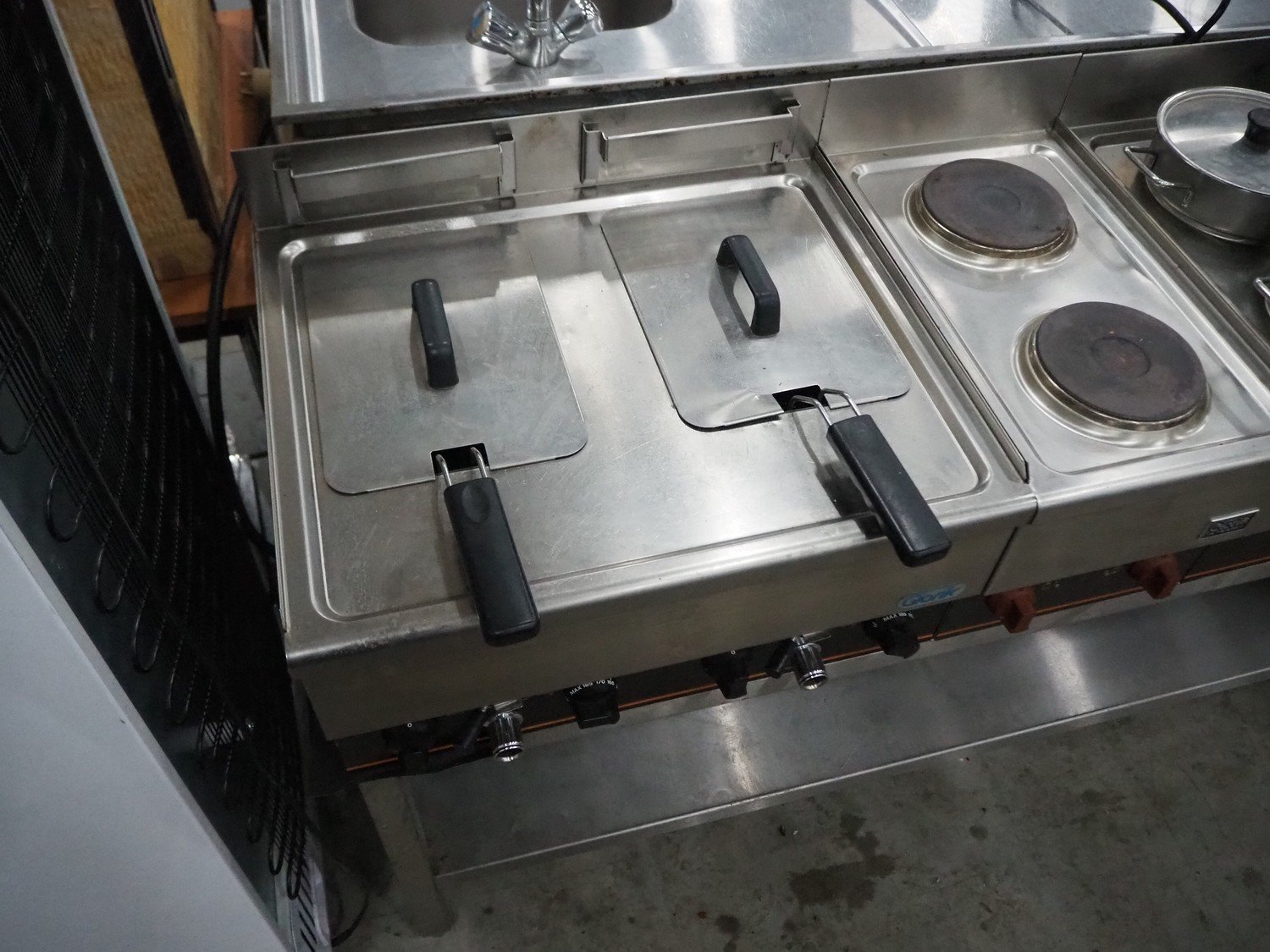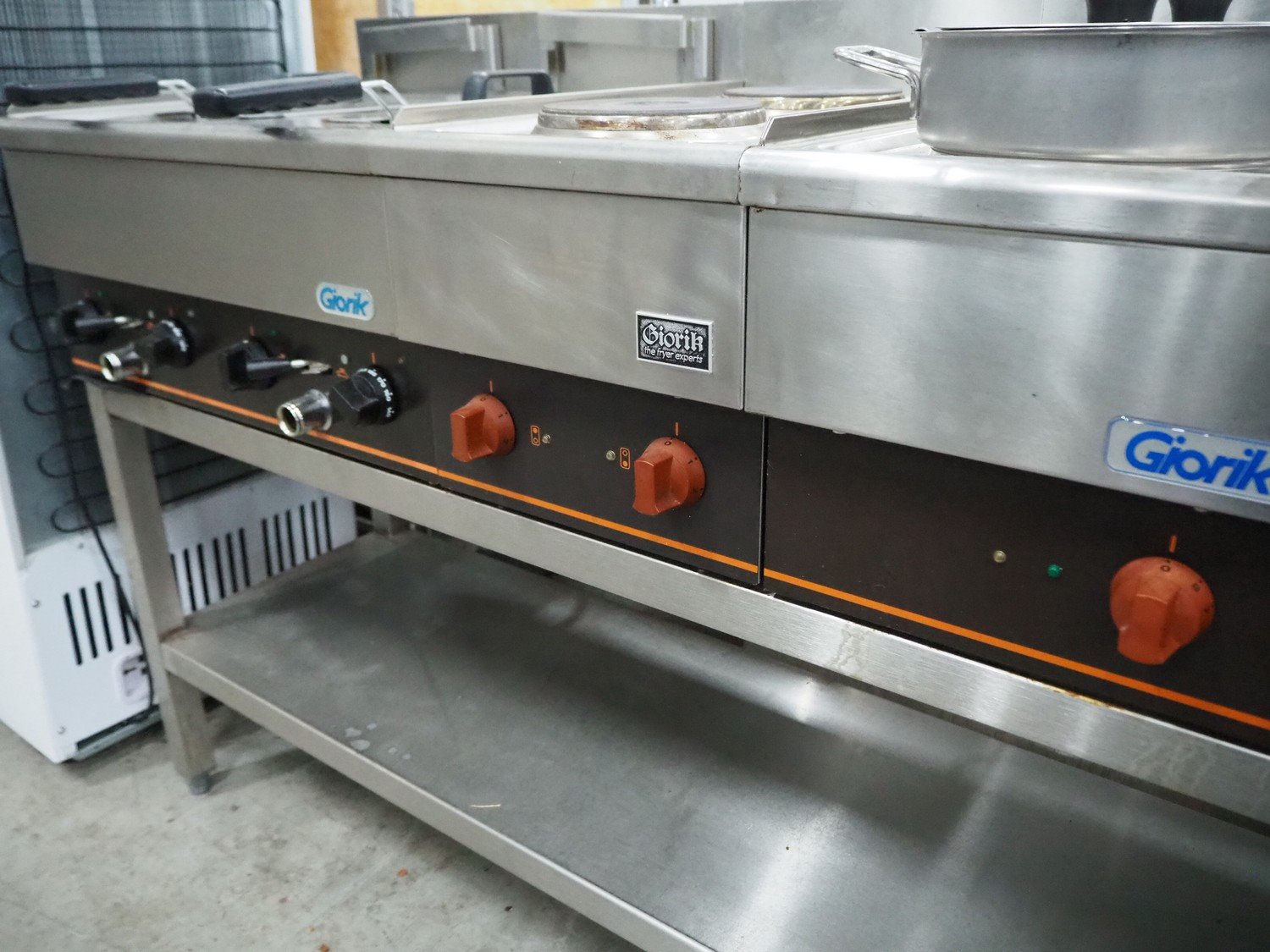 Giorik kitchen counter consisting of 2 deep fryers, 3 stoves with 2 pits and frying plate, dimensions: 550 mm x 1500 mm x 1000 mm. Kavel locatie: Sprokkelveld 5, 6596 DH Milsbeek, Nederland