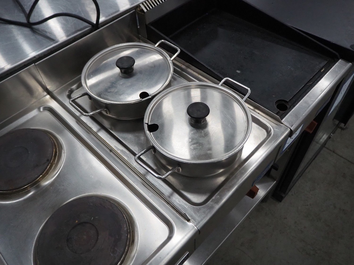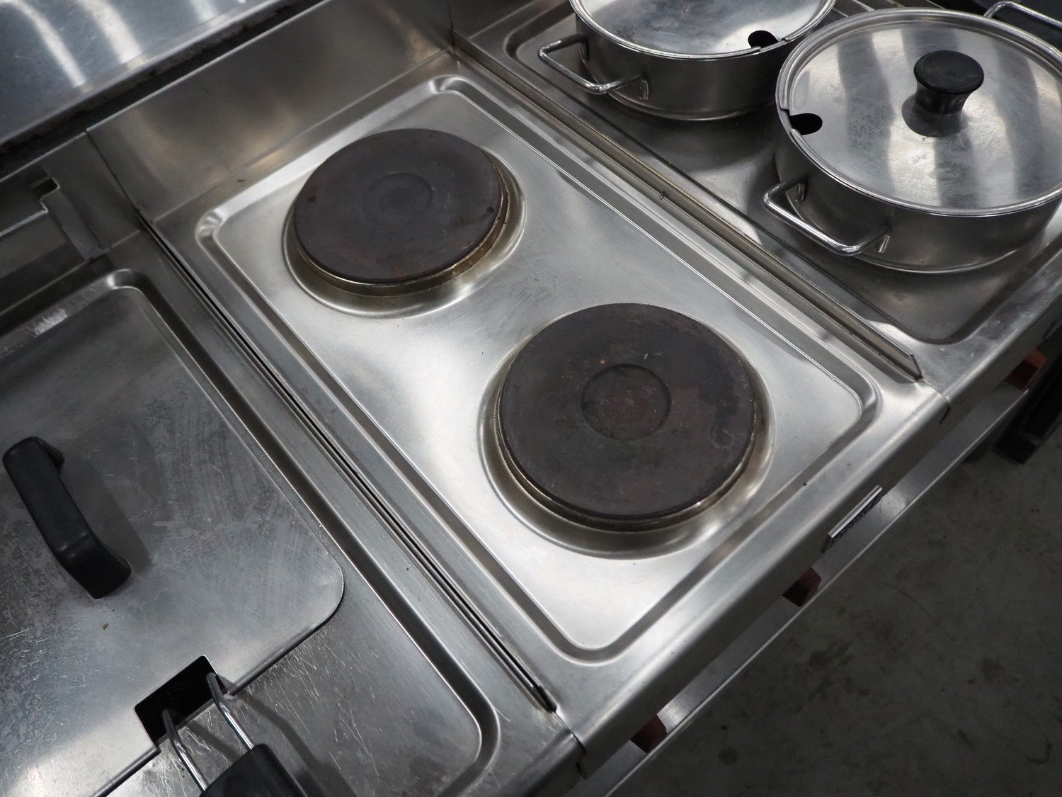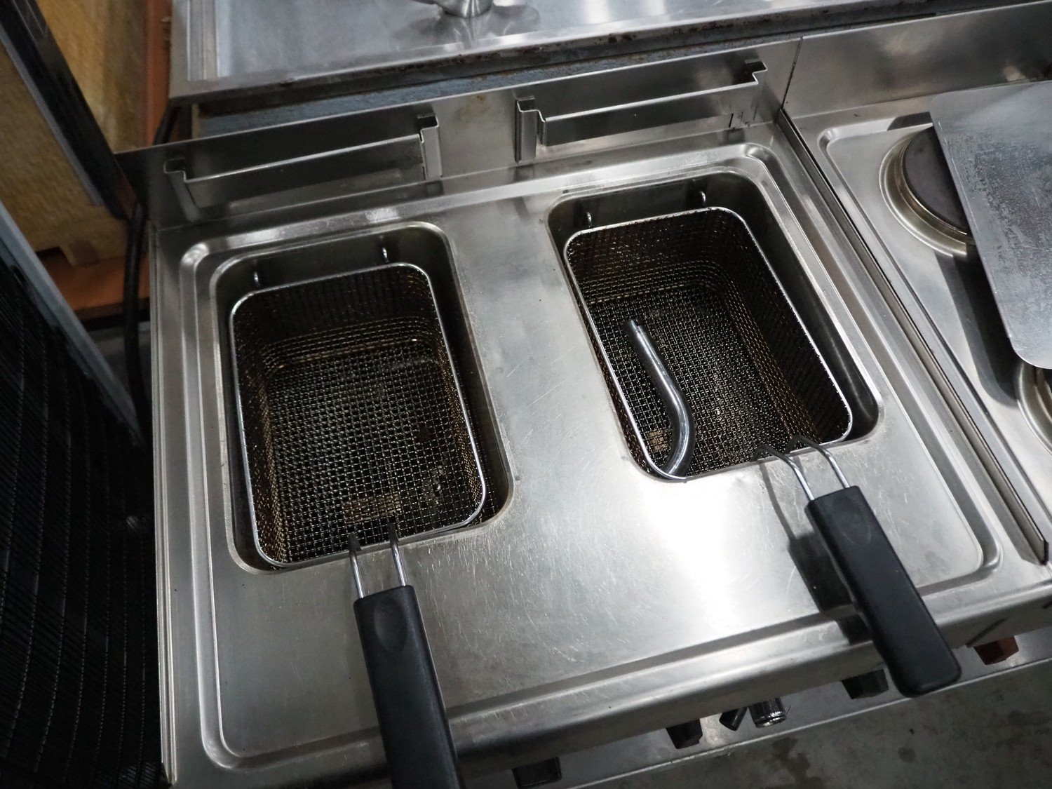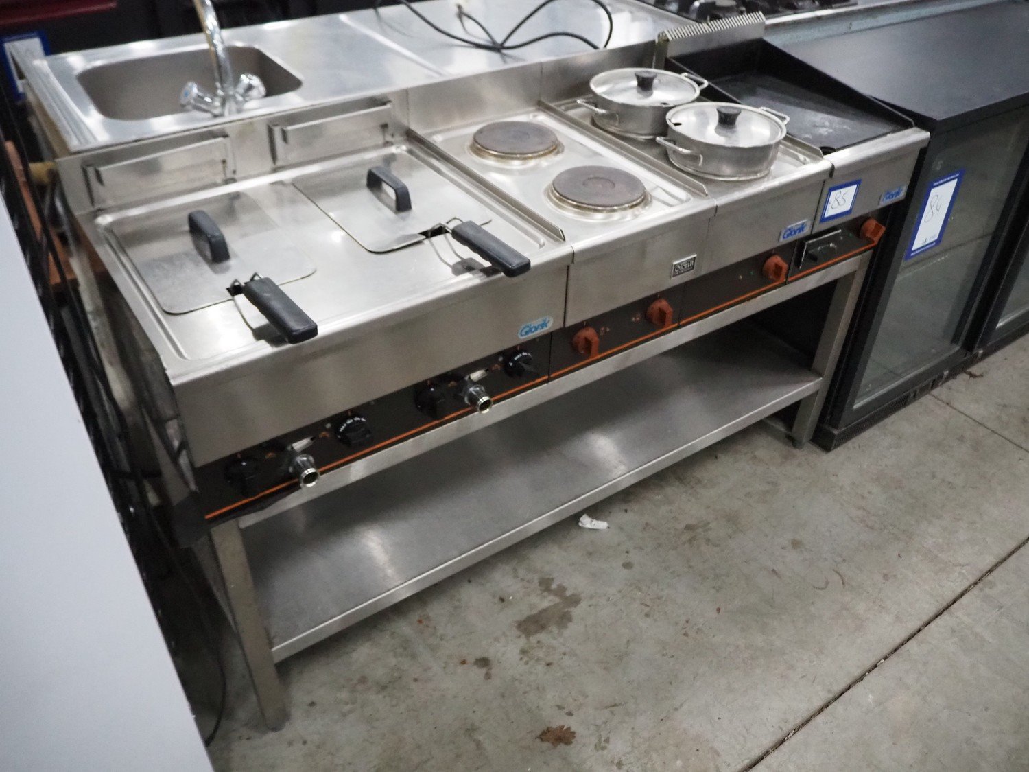 Giorik kitchen counter consisting of 2 deep fryers, 3 stoves with 2 pits and frying plate, dimensions: 550 mm x 1500 mm x 1000 mm. Kavel locatie: Sprokkelveld 5, 6596 DH Milsbeek, Nederland