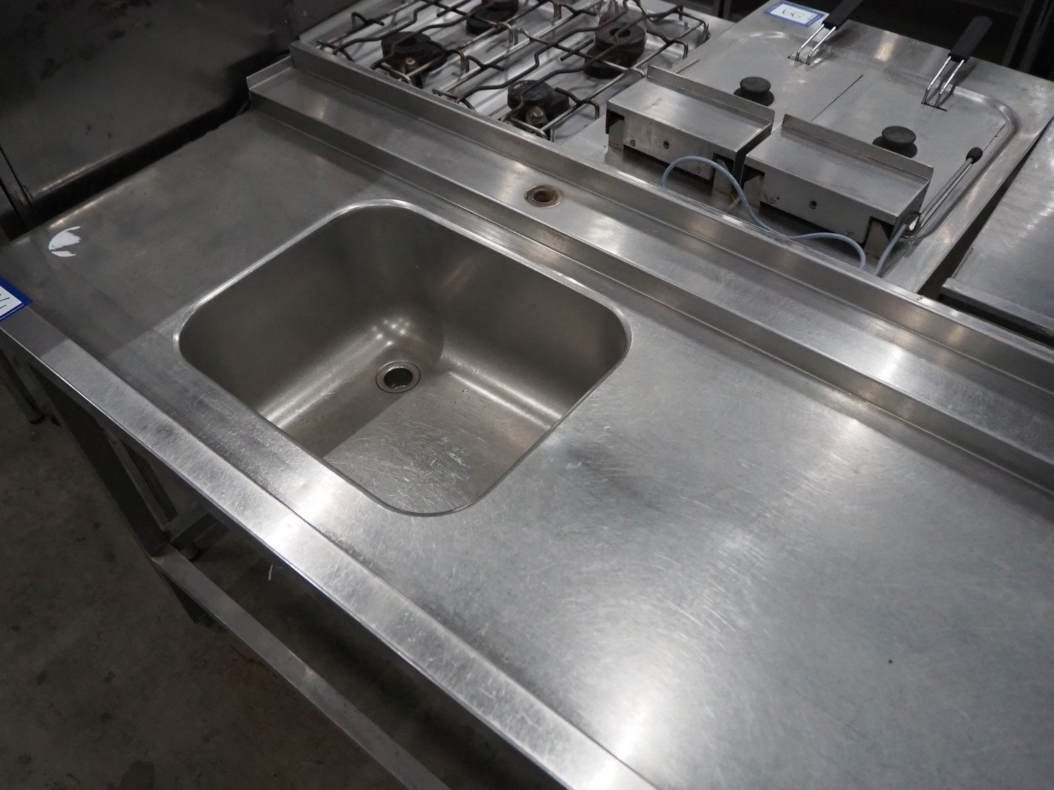 S/s counter with sink, dimensions: 700 mm x 1600 mm x 910 mm. Without faucet. Kavel locatie: Sprokkelveld 5, 6596 DH Milsbeek, Nederland