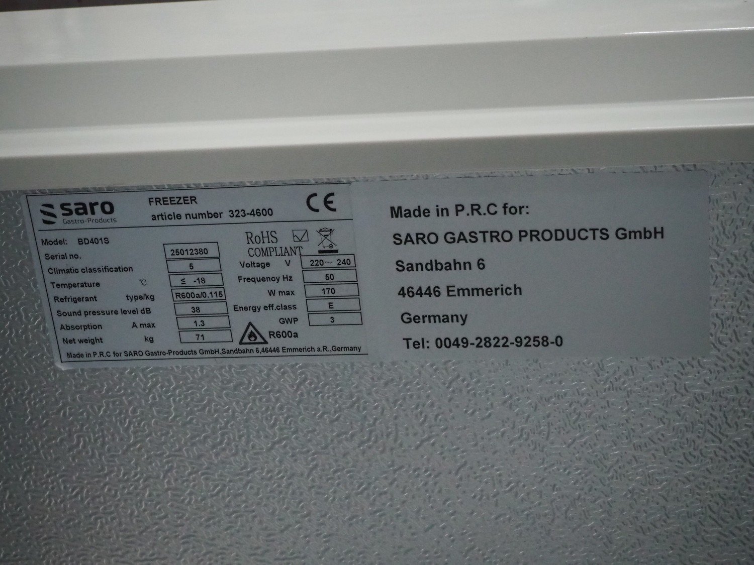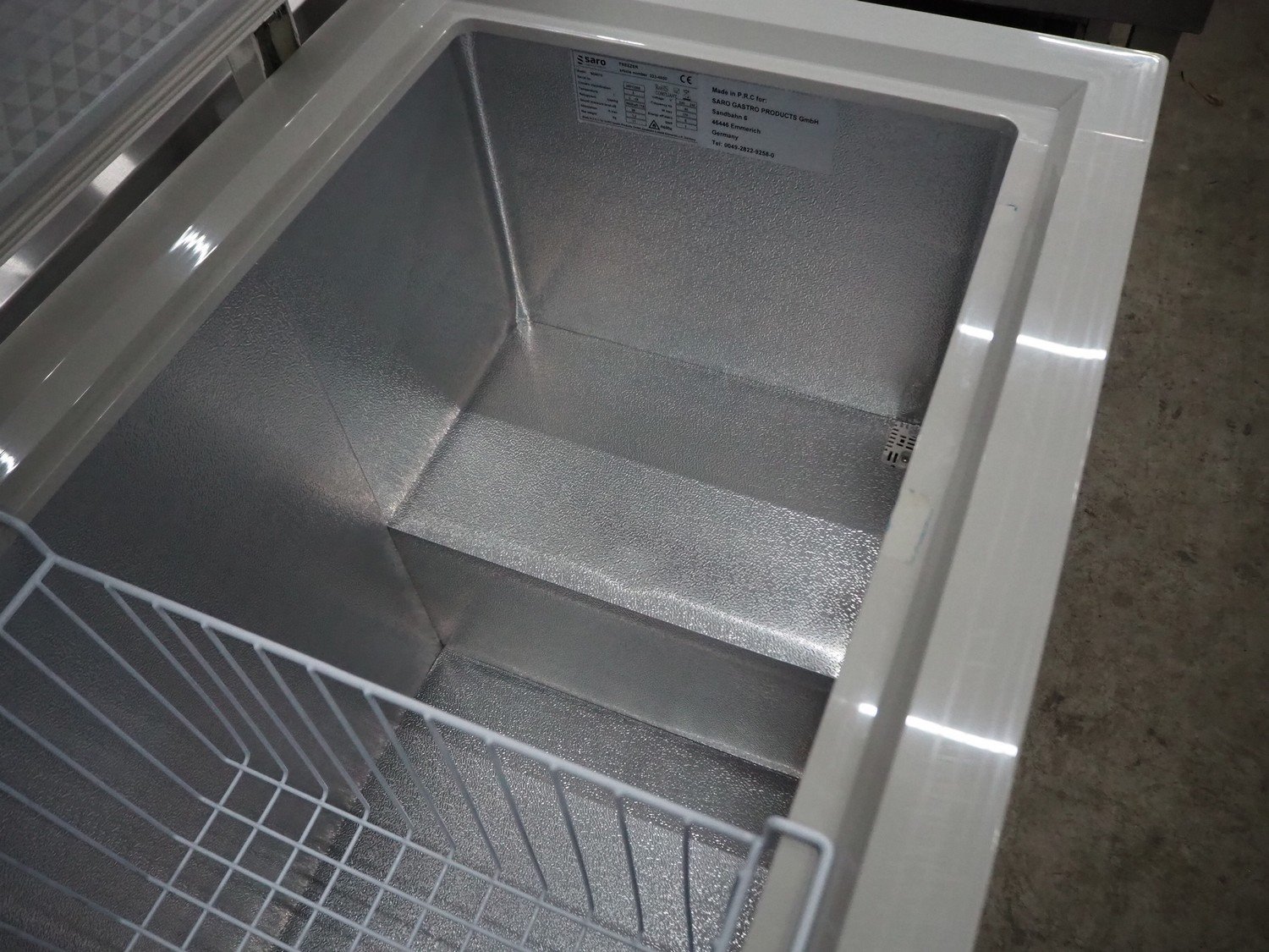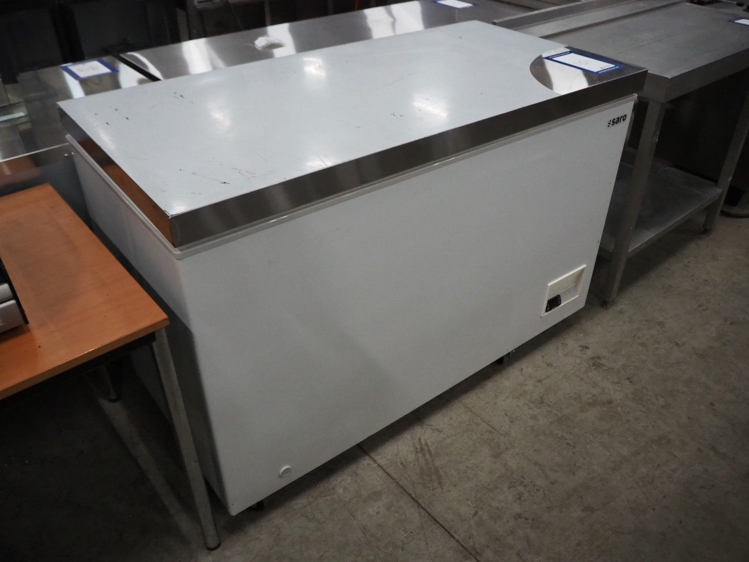 Saro box freezer, model: BD401S, serial number: 25012380, 220-240 V, 50 Hz, 170 W, refrigerant: R600a/0.115 g, inside dimensions: 1250 mm x 500 mm x 665 mm, total dimensions: 760 mm x 435 mm x 950 mm. One wheel broken. Kavel locatie: Sprokkelveld 5, 6596 DH Milsbeek, Nederland