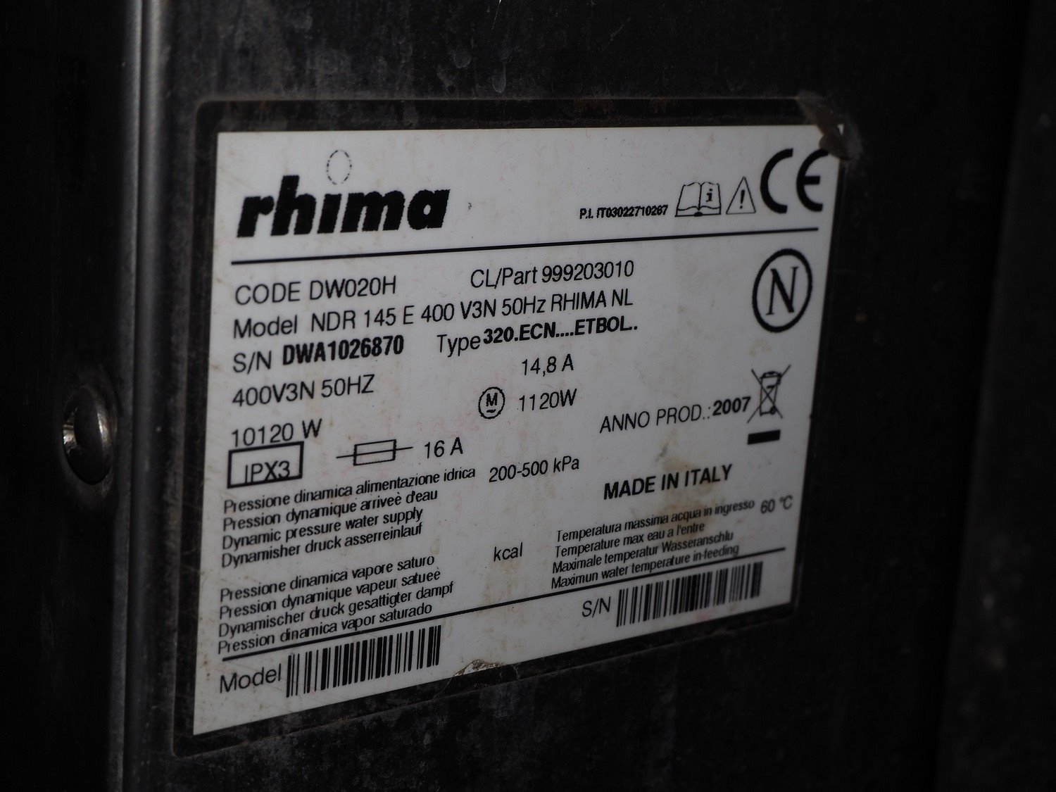 Rhima dishwasher, model: NDR 145 E, serial number: DWA1026870, 400 V, 3 Ph, 50 Hz, 14.8 kW, dimensions: 780 mm x 600 mm x 1395 mm. Kavel locatie: Sprokkelveld 5, 6596 DH Milsbeek, Nederland