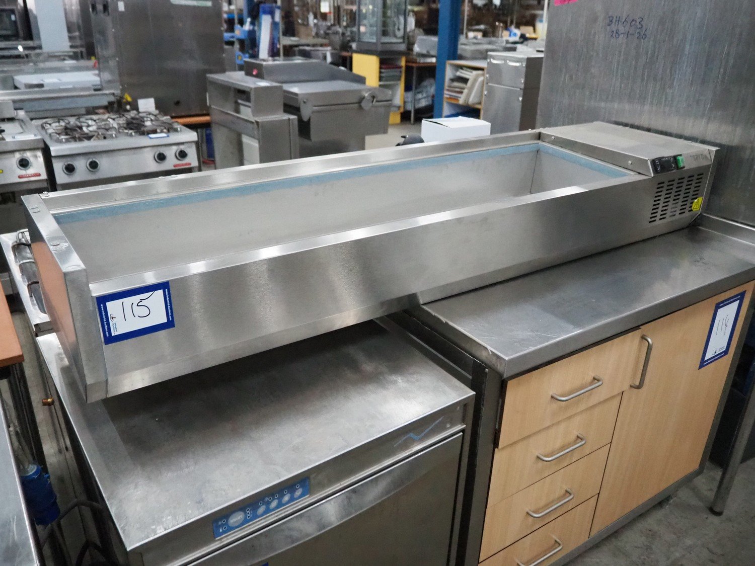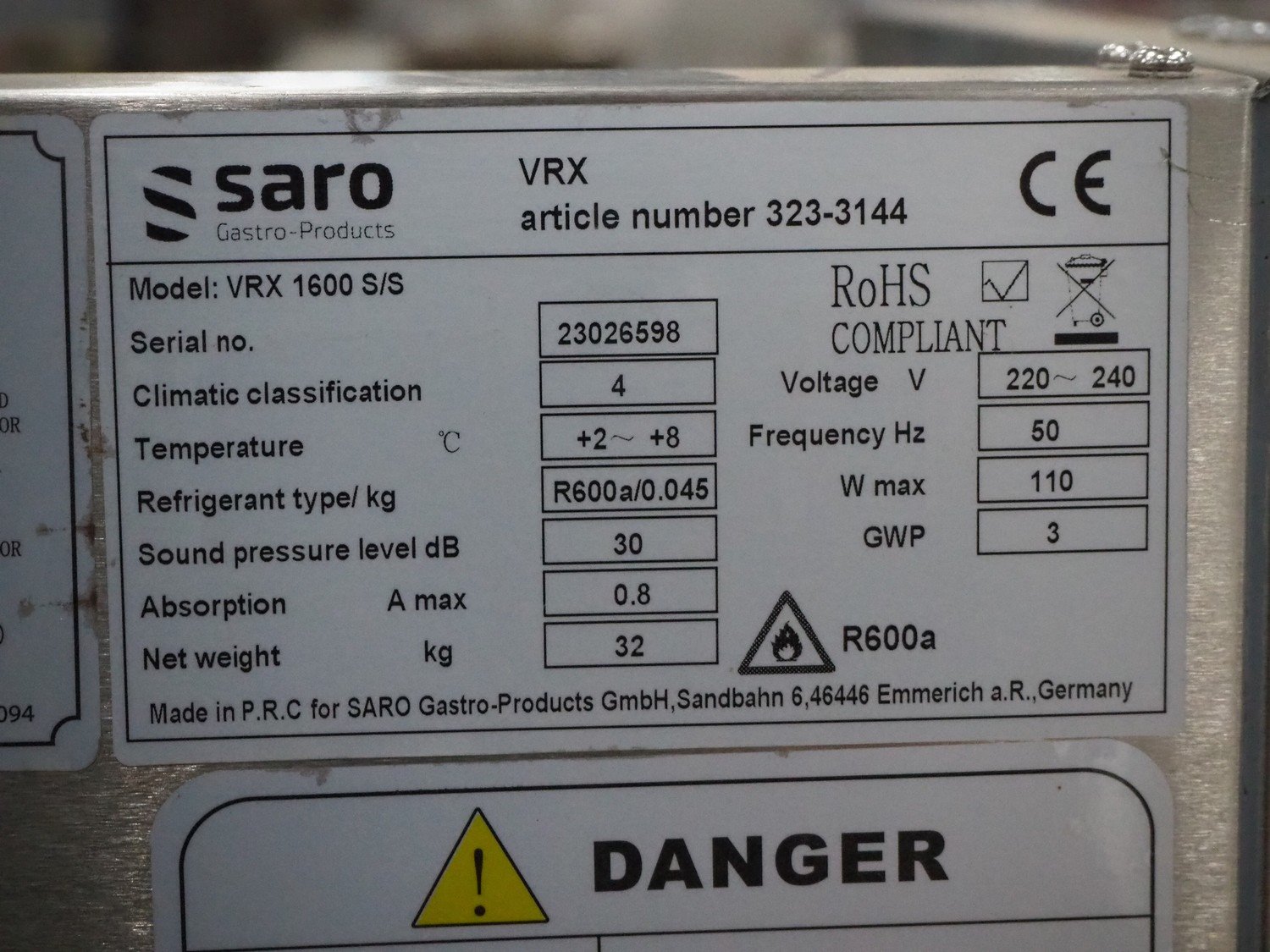 Saro saladette, model: VRX 1600 S/S, serial number: 23026598, 220-240 V, 50 Hz, 110 W, refrigerant: R600a/0.045g, dimensions: 395 mm x 1600 mm x 230 mm. Kavel locatie: Sprokkelveld 5, 6596 DH Milsbeek, Nederland