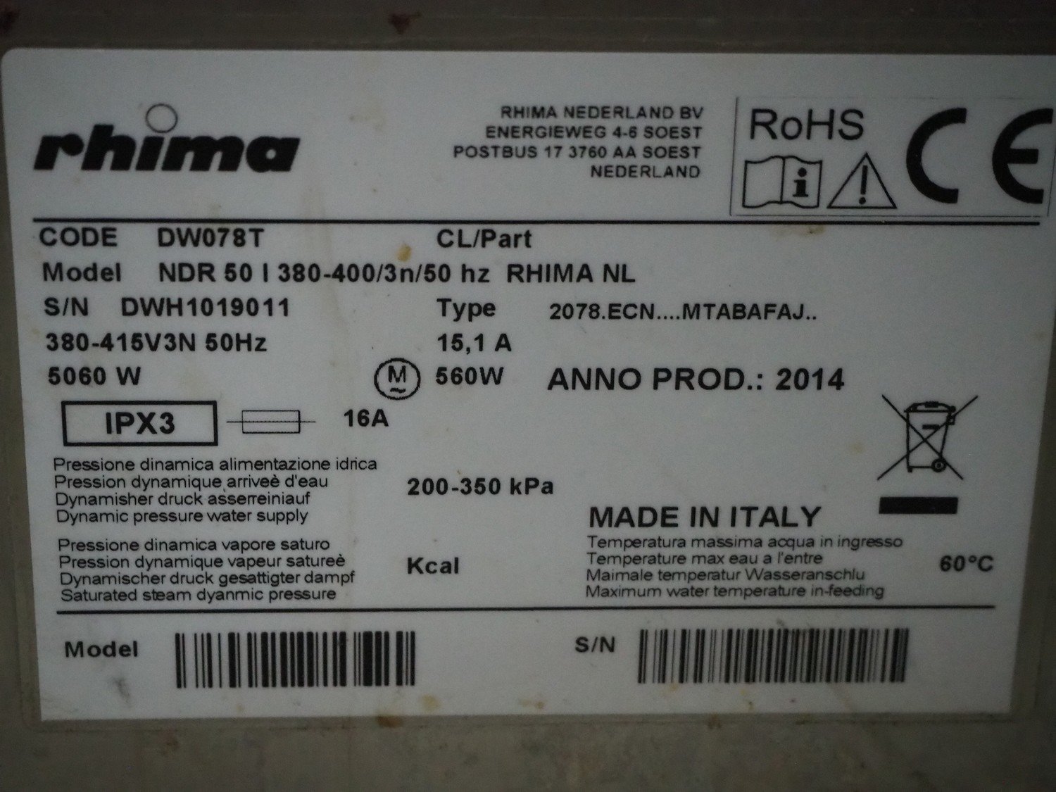 Rhima dishwasher, model: NDR 50 I, serial number: DWH1019011, year of construction: 2014, 380-415 V, 3 Ph, 50 Hz, 15.1 A, dimensions: 610 mm x 590 mm x 830 mm. Kavel locatie: Sprokkelveld 5, 6596 DH Milsbeek, Nederland