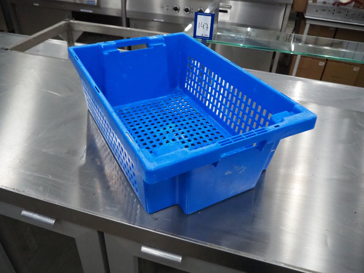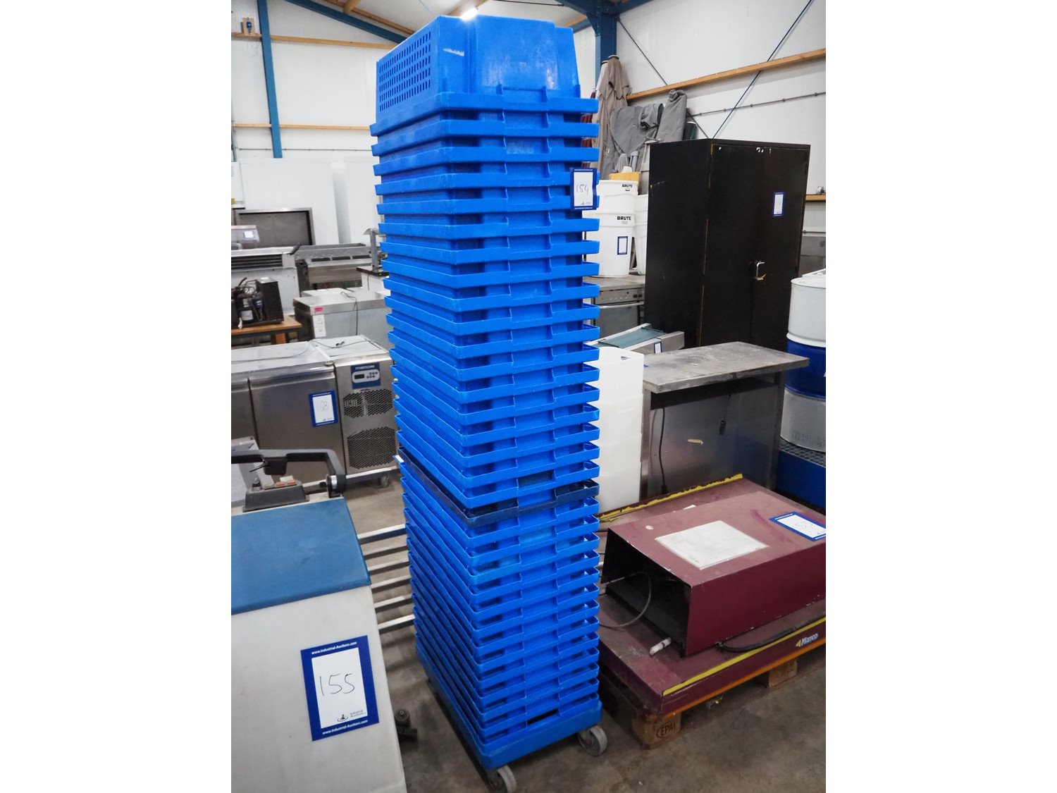 Plastic rollie with 32 plastic perforated crates, dimensions crates: (32x) 600 mm x 400 mm x 200 mm. Kavel locatie: Sprokkelveld 5, 6596 DH Milsbeek, Nederland