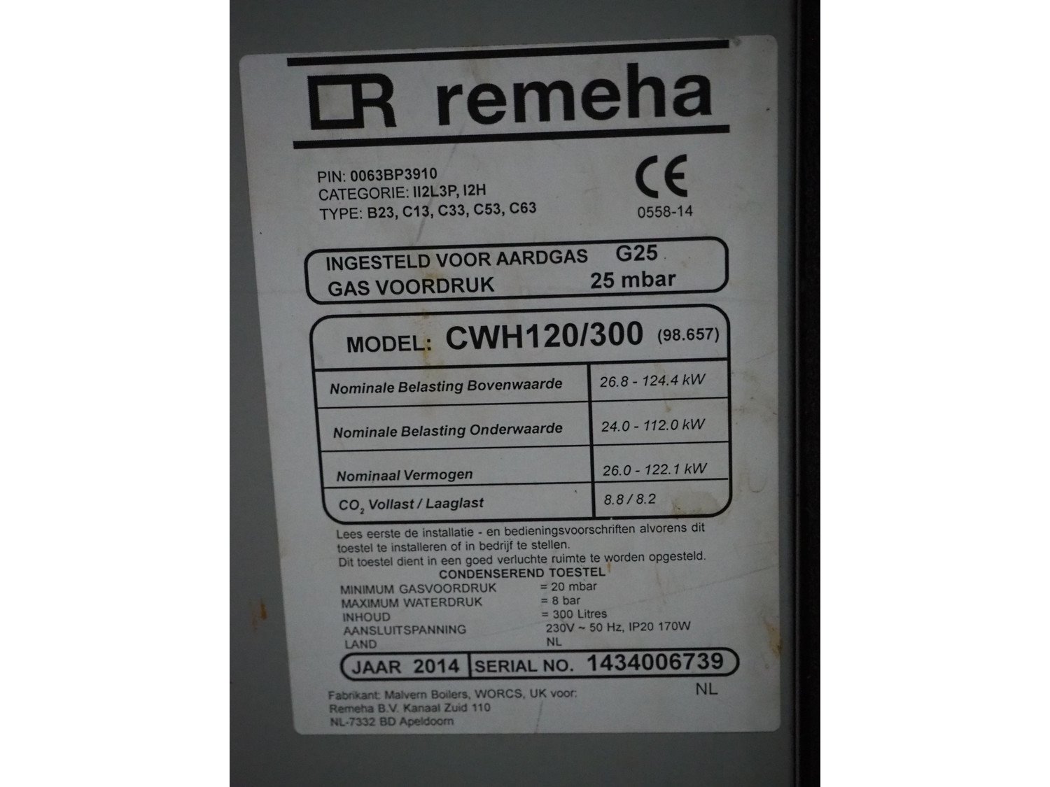 Remeha boiler, model: CWH120/300, serial number: 1434006739, year of construction: 2014, 230 V, 50 Hz, 170 W, rated power: 26.0-122.1 kW, volume: 300 liter, dimensions: 910 mm x 600 mm x 1955 mm. Kavel locatie: Sprokkelveld 5, 6596 DH Milsbeek, Nederland