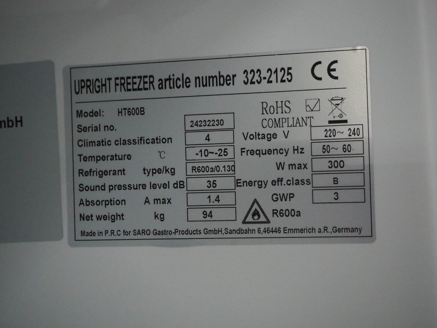 Saro Gastro-Products GmbH freezer, model: HT600B, serial number: 242322330, 220-240 V, 50-60 Hz, 1.4 A, 300 W, refrigerant: R600a / 0.130 kg, weight: 94 kg, 6 floors, floor dimensions: 500 mm x 620 mm, total dimensions: 690 mm x 780 mm x 1900 mm. Kavel locatie: Sprokkelveld 5, 6596 DH Milsbeek, Nederland