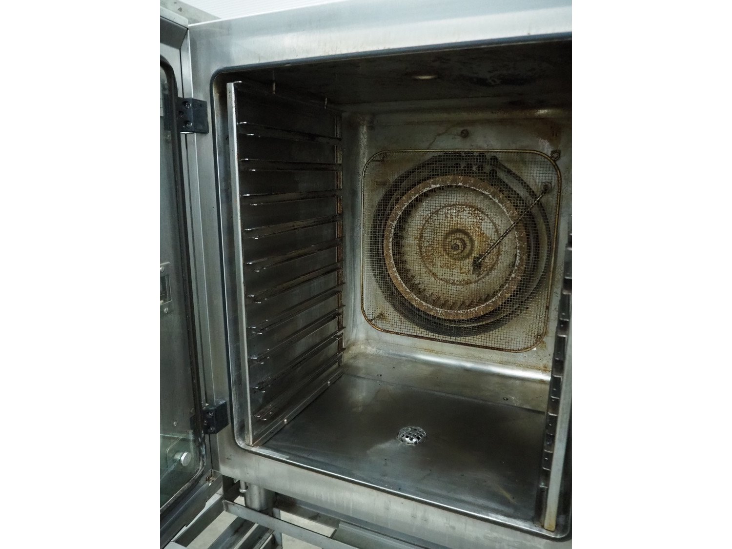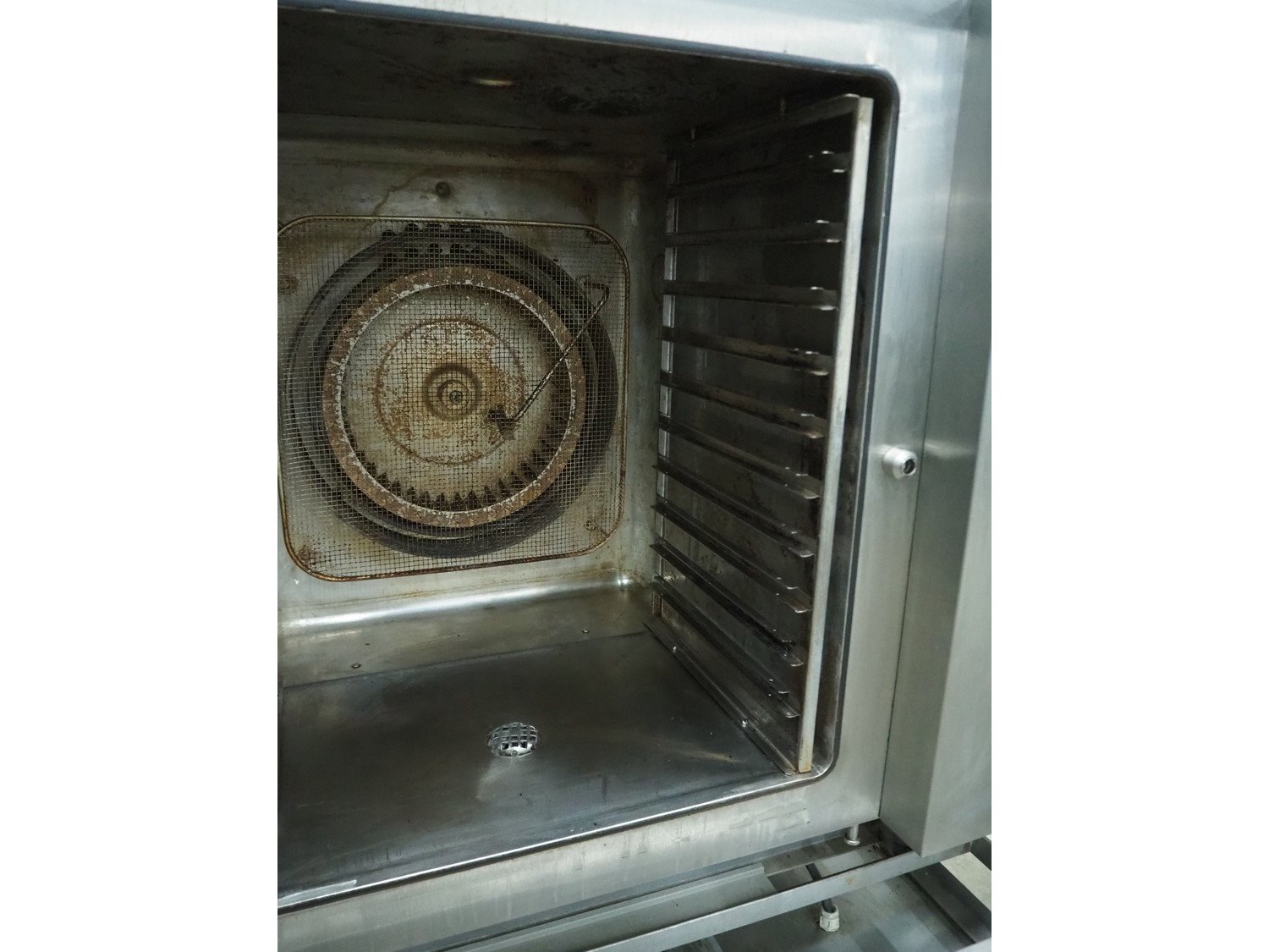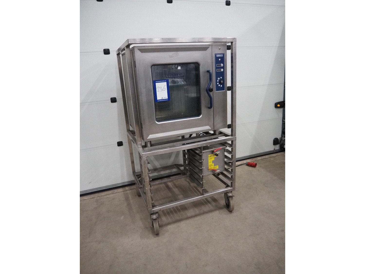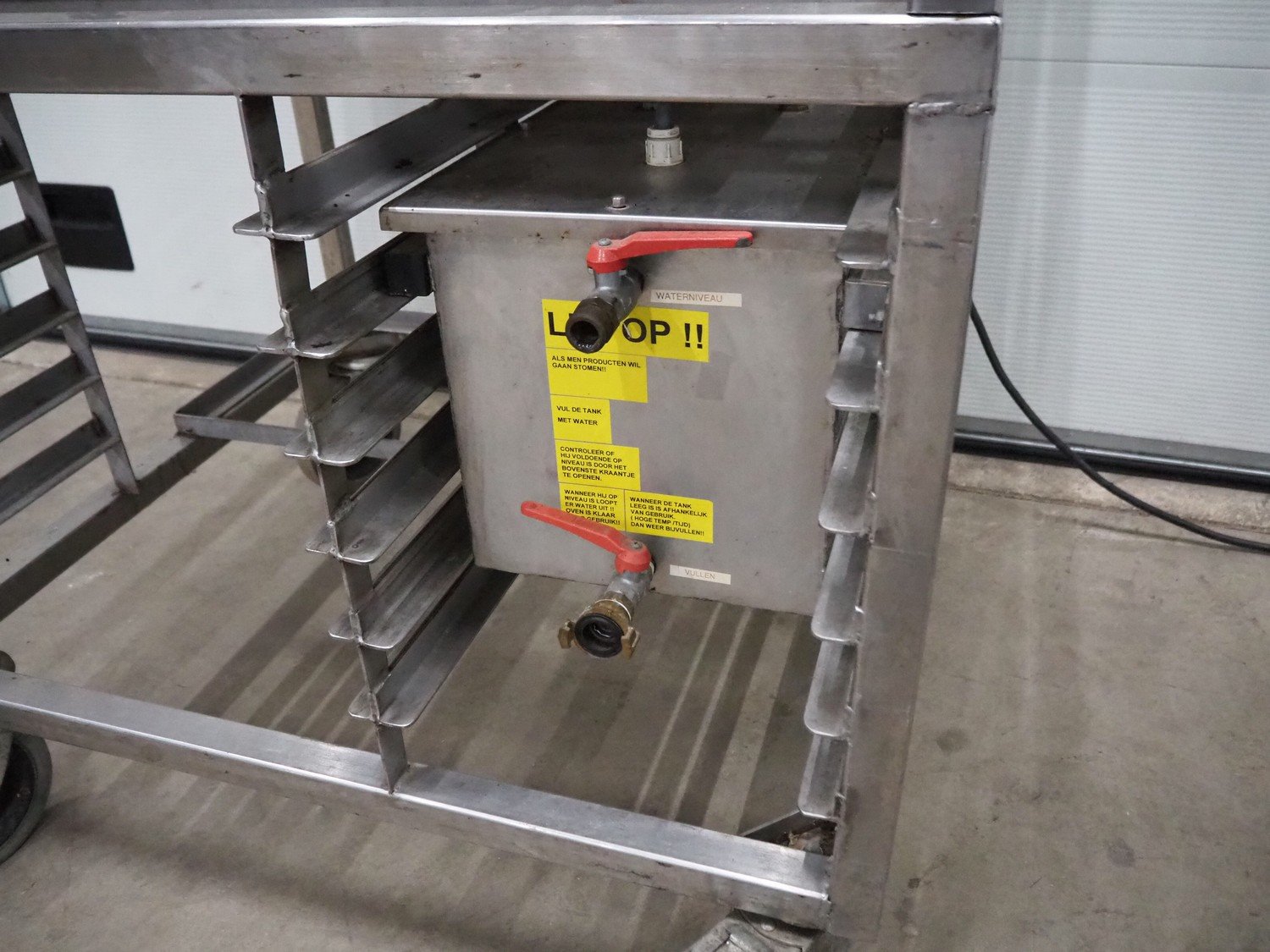 Hobart combi steamer on s/s trolley, model: CSMUC1012LAE-KK, serial number: 81.846.201, 400 V, 50 Hz, 3 Ph, 27 A, 18 kW, 10 floors, floor dimensions: 370 mm x 530 mm, total dimensions: 950 mm x 1000 mm x 1830 mm. Technical condition unknown. Kavel locatie: Sprokkelveld 5, 6596 DH Milsbeek, Nederland
