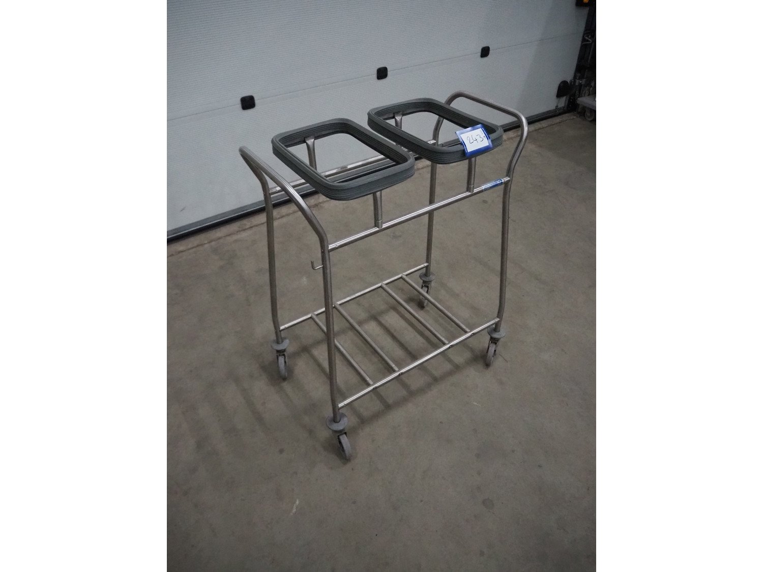 S/s waste bag trolley for 2 bags, dimensions: 800 mm x 430 mm x 980 mm. Kavel locatie: Sprokkelveld 5, 6596 DH Milsbeek, Nederland