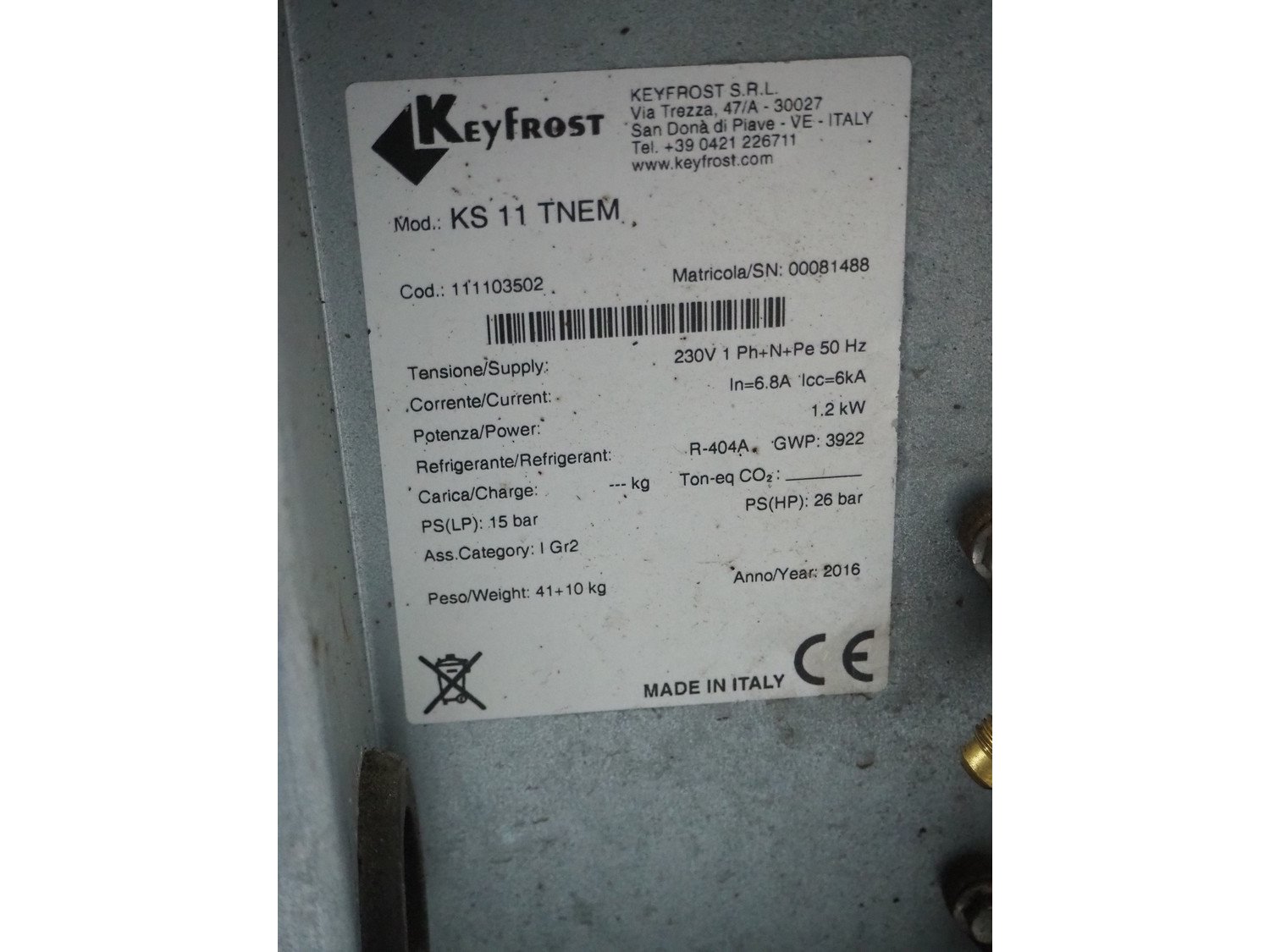 Keyfrost S.r.l. cooling compressor, model: KS 11 TNEM, serial number: 00081488, year of construction: 2016, 230 V, 1 Ph, 50 Hz, 6.8 A, 1.2 kW, refrigerant: R404A, weight: 41+10 kg, dimensions: 450 mm x 760 mm x 410 mm. Kavel locatie: Sprokkelveld 5, 6596 DH Milsbeek, Nederland