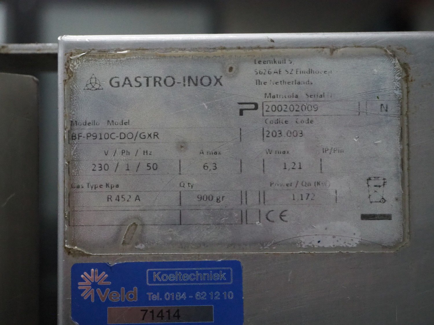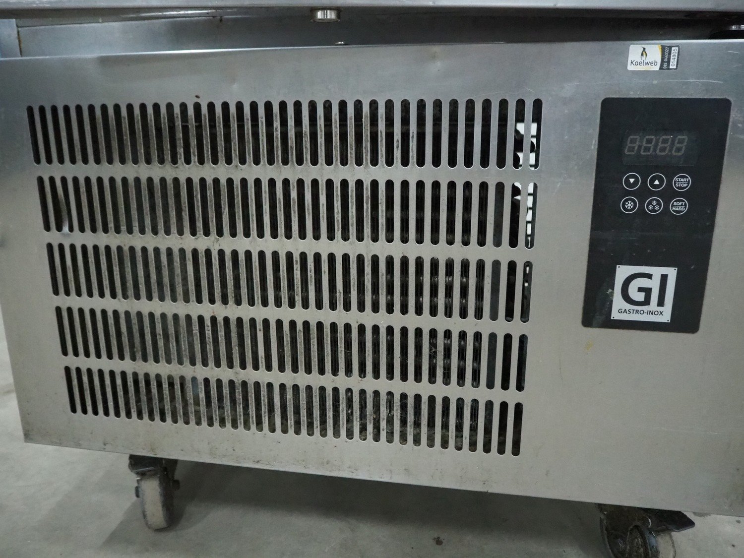 Gastro-Inox mobile blast chiller, model: BF-P910C-DO/GXR, serial number: 200202009, 230 V, 1 Ph, 50 Hz, 6.3 A, 1.172 kW, refrigerant: R452A / 900 gram, 10 floors, floor dimensions: 380 mm x 510 mm, total dimensions: 800 mm x 790 mm x 1420 mm. Kavel locatie: Sprokkelveld 5, 6596 DH Milsbeek, Nederland