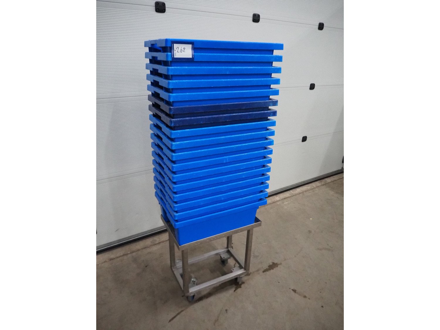 S/s trolley with 17 plastic crates, crate dimensions: 600 mm x 400 mm x 200 mm, trolley dimensions: 560 mm x 360 mm x 580 mm. Kavel locatie: Sprokkelveld 5, 6596 DH Milsbeek, Nederland