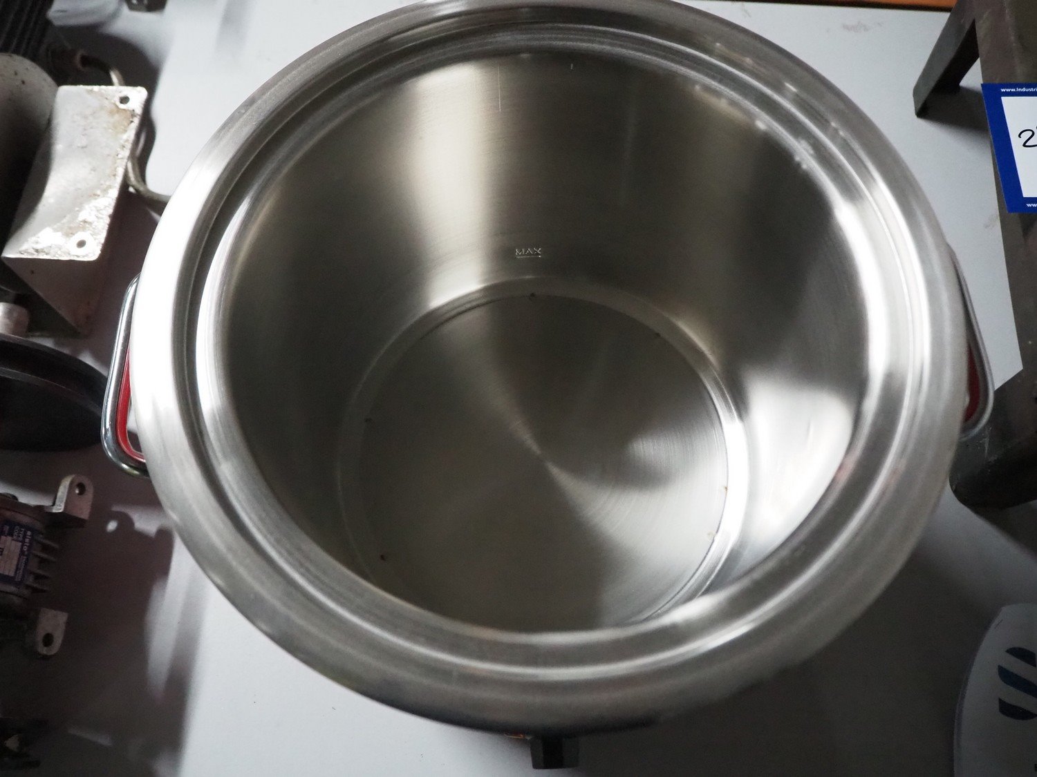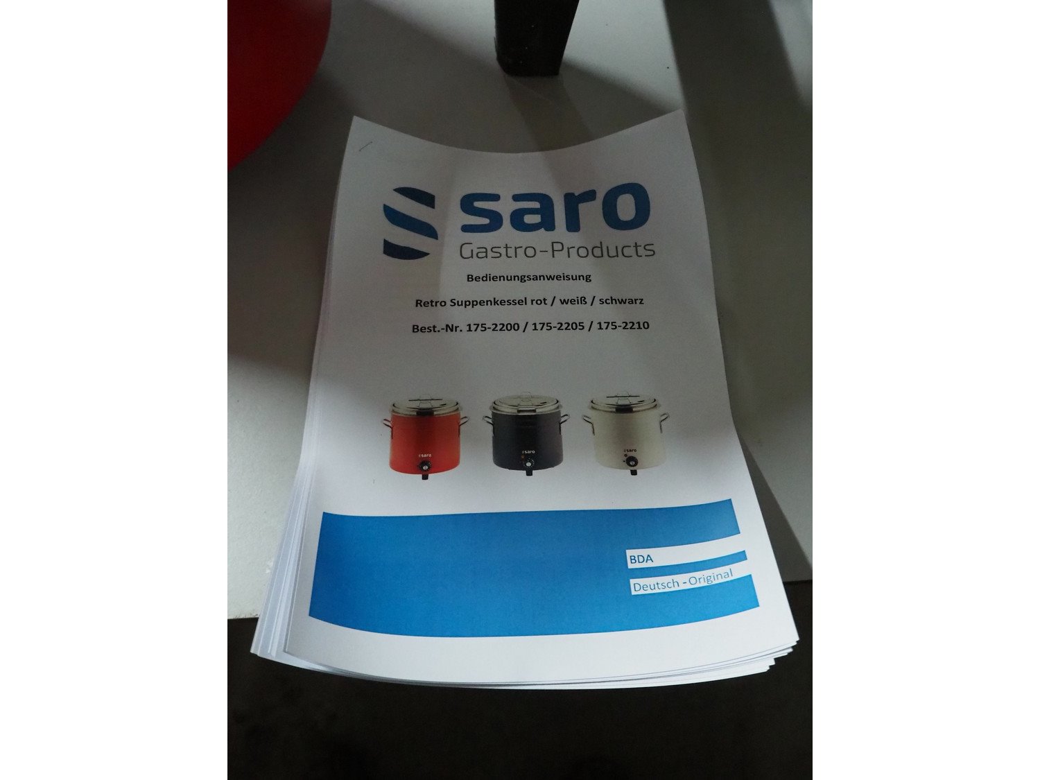 Saro retro soup kettle, number: 175-2200, 220-240 V, 1Ph, 50-60 Hz, 6,3 A,1,28-1,53 kW, capacity of approximately: 11 to 10.4 liters, inside dimensions: 250 mm x 220 mm, total dimensions: 360 mm x 400 mm x 370 mm. Kavel locatie: Sprokkelveld 5, 6596 DH Milsbeek, Nederland