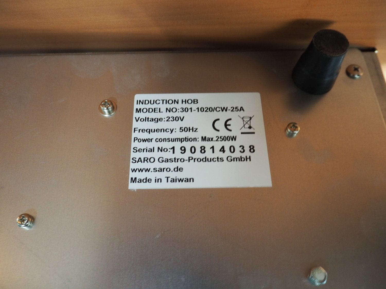Saro Gastro-Products GmbH wok induction plate, model: 301-1020/CW-25A, serial number: 190814038, 230 V, 50 Hz, 2500 W, dimensions: 560 mm x 390 mm x 160 mm. Including s/s pan. Kavel locatie: Sprokkelveld 5, 6596 DH Milsbeek, Nederland