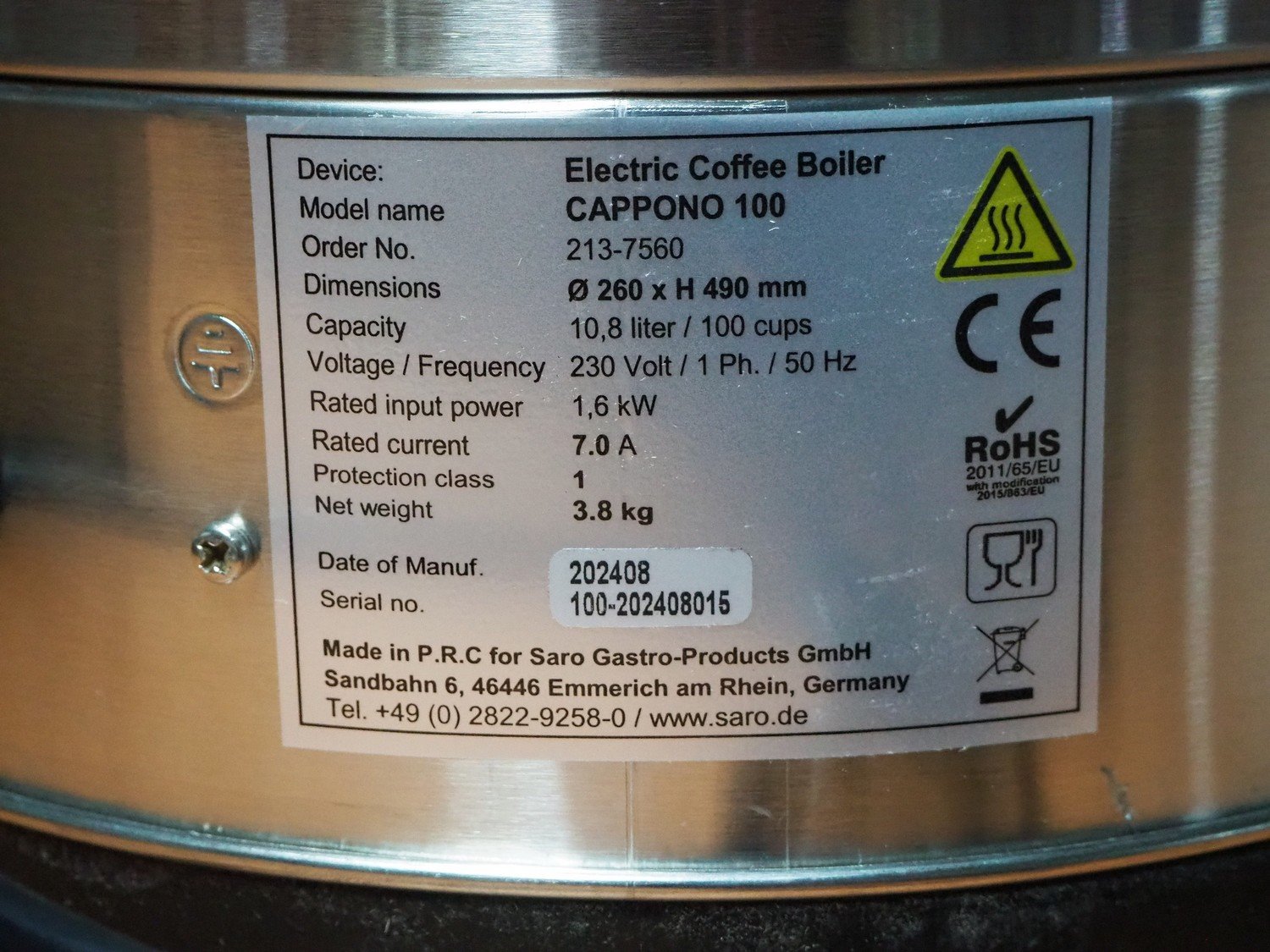 Saro Gastro-Products GmbH coffee boiler, model: CAPPONO 100, serial number: 100-202408015, year of construction: 202408, 230 V, 1 Ph, 50 Hz, 7.0 A, 1.6 kW, dimensions: 350 mm x 300 mm x 550 mm. Kavel locatie: Sprokkelveld 5, 6596 DH Milsbeek, Nederland