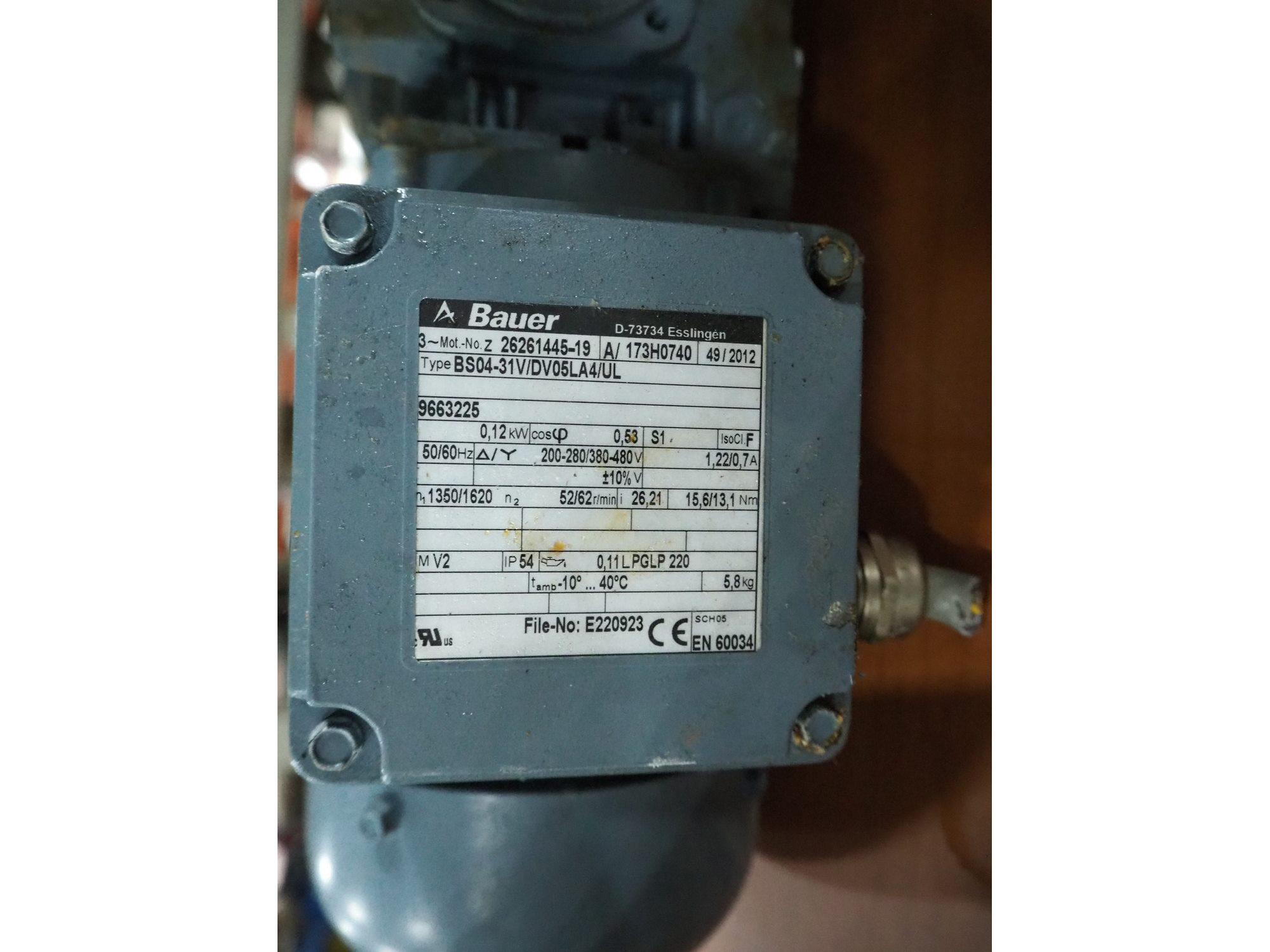 Bauer electro motor, type: BS04-31V/DV05LA4/UL, serial number: 26261445-19, year of construction: 49/2012, 200-280/380-480 V, 3 Ph, 50/60 Hz, dimensions: 300 mm x 140 mm x 250 mm. Kavel locatie: Sprokkelveld 5, 6596 DH Milsbeek, Nederland