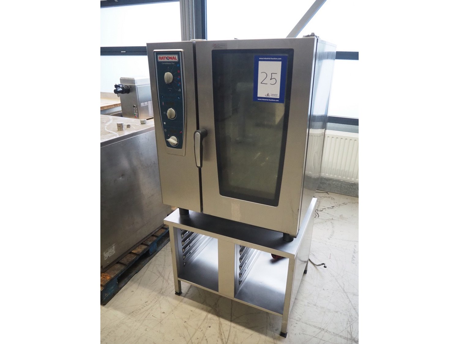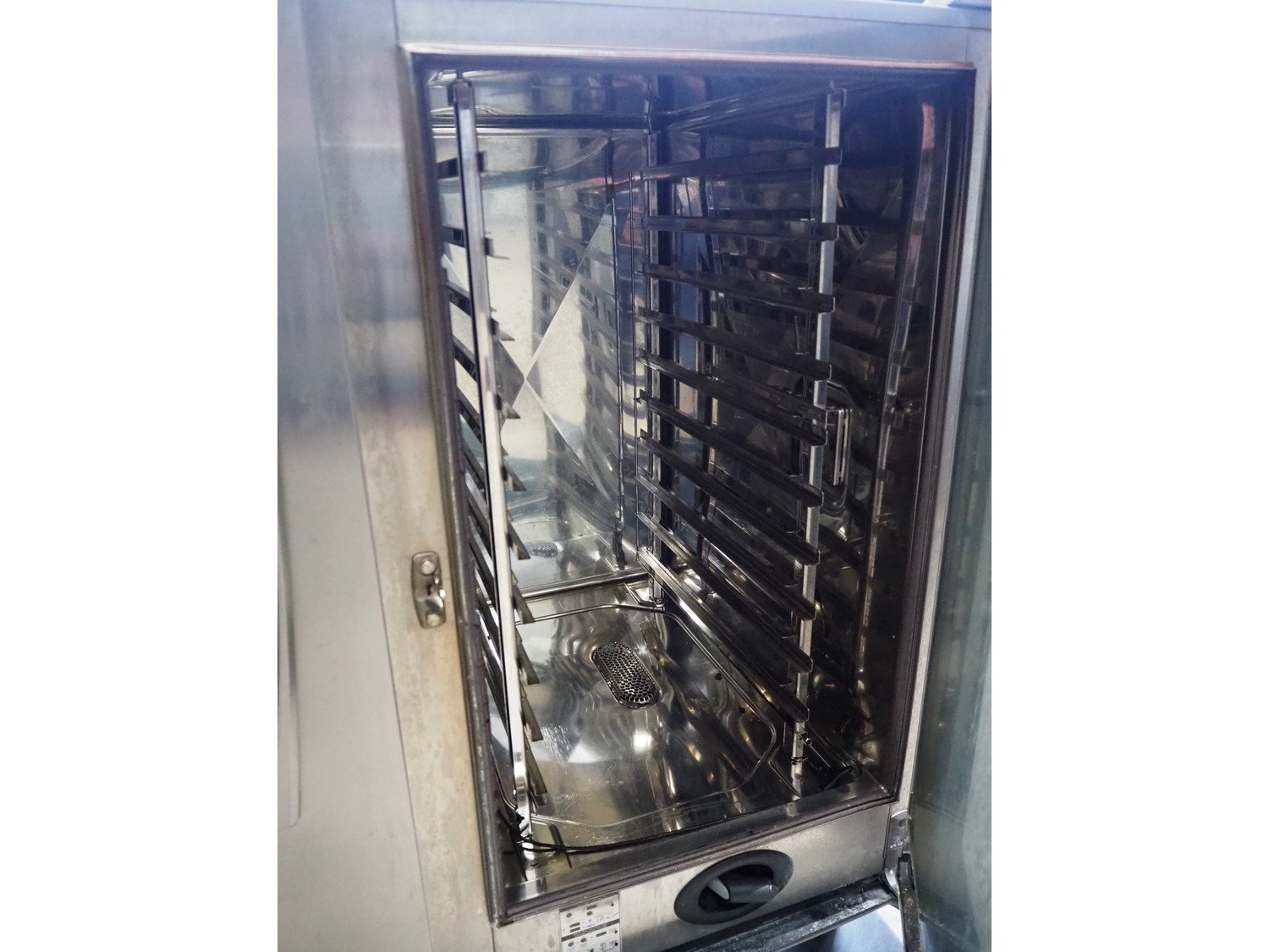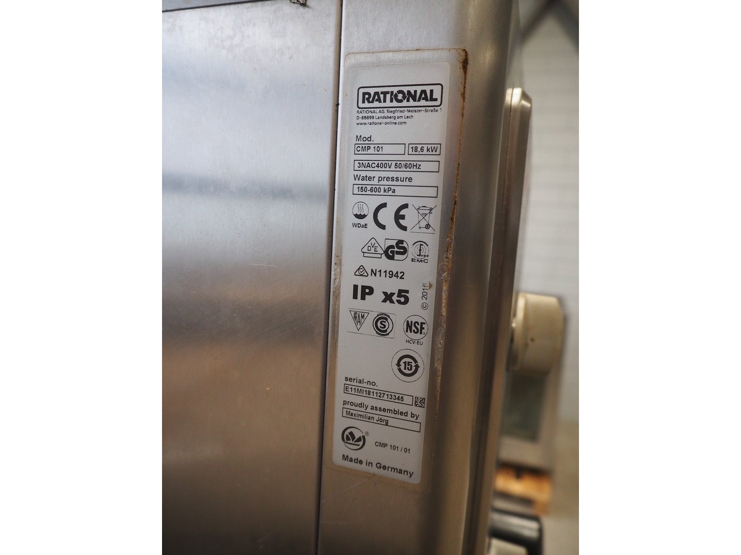 Rational combi steamer, model: CMP 101, serial number: E11MI18112713345, 400 V, 3 Ph, 50/60 Hz, 18.6 kW, water pressure: 150-600 kPa, 10 floors, dimensions floors: (10x) 530 mm x 330 mm, total dimensions: 850 mm x 830 mm x 1770 mm. Kavel locatie: Looyenbeemd 11, 5652 BH Eindhoven, Nederland