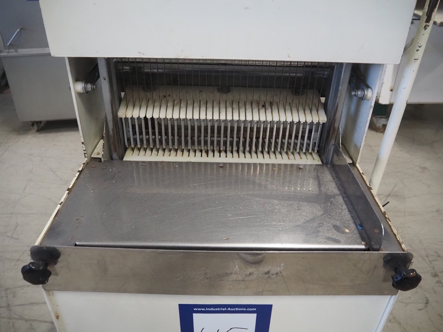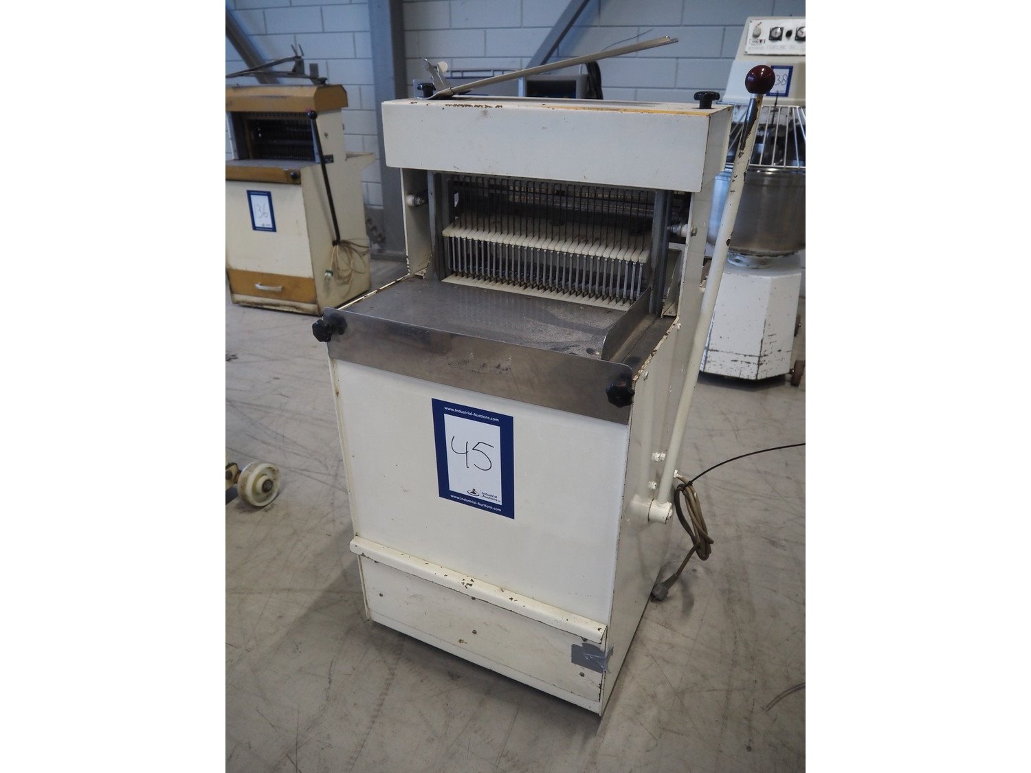 Bread slicer, 30 knives, distance between knives: 12.5 mm, working width: 400 mm, total dimensions: 570 mm x 680 mm x 1160 mm. Kavel locatie: Looyenbeemd 11, 5652 BH Eindhoven, Nederland