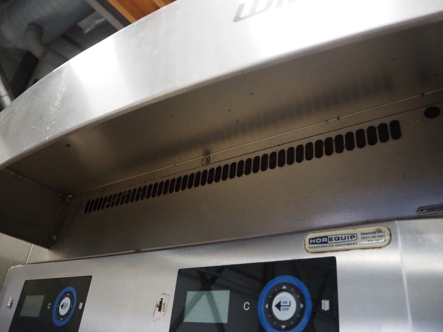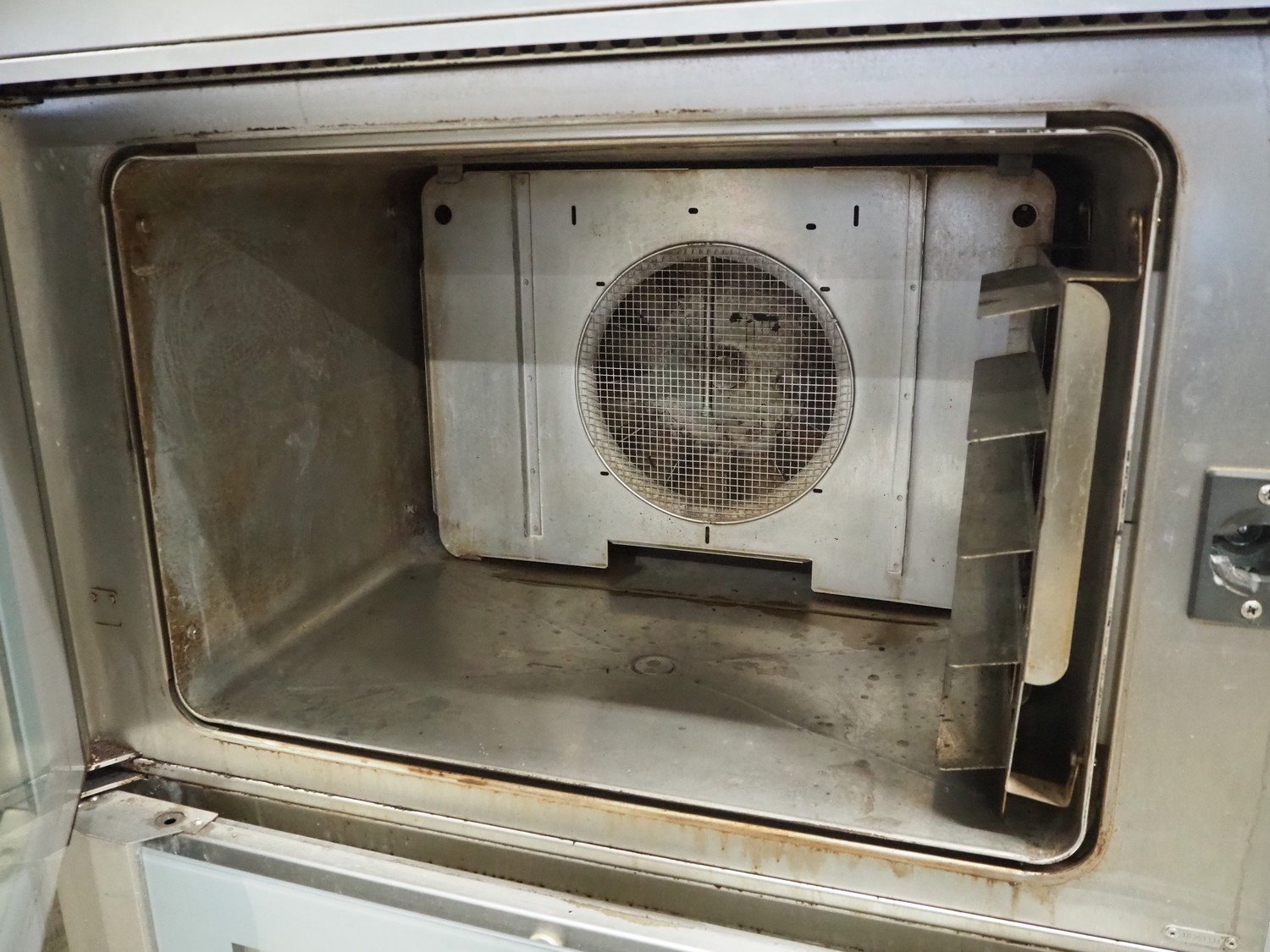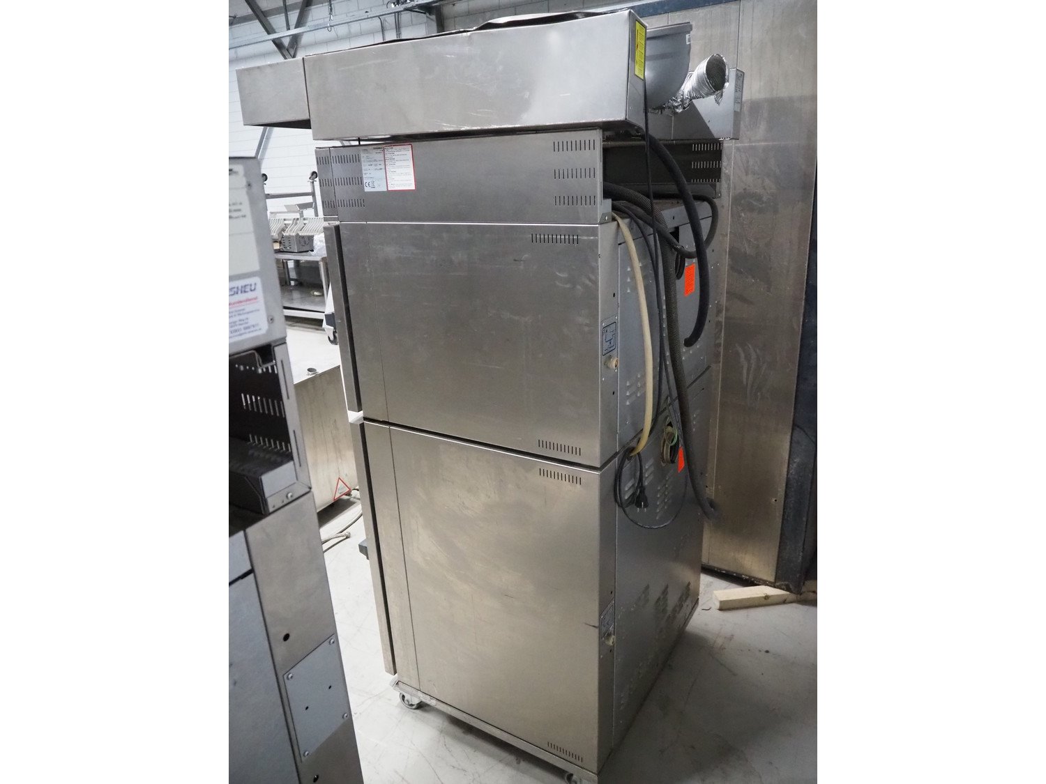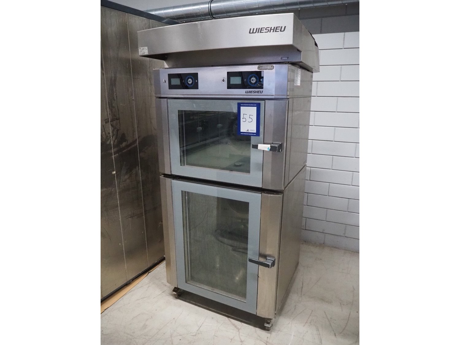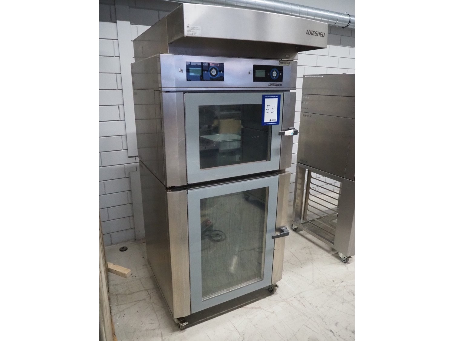 Wiesheu GmbH mobile double stacked oven, model: B08-B04-EM-VA, serial number: 10363334, year of construction: 2017-10, 400 V, 3 Ph, 50 Hz, 32 A, 20.8 kW, 5 and 10 floors, dimensions each floor: 620 mm x 400 mm, total dimensions: 930 mm x 1200 mm x 2070 mm. 1 side of the rack is missing. Kavel locatie: Looyenbeemd 11, 5652 BH Eindhoven, Nederland