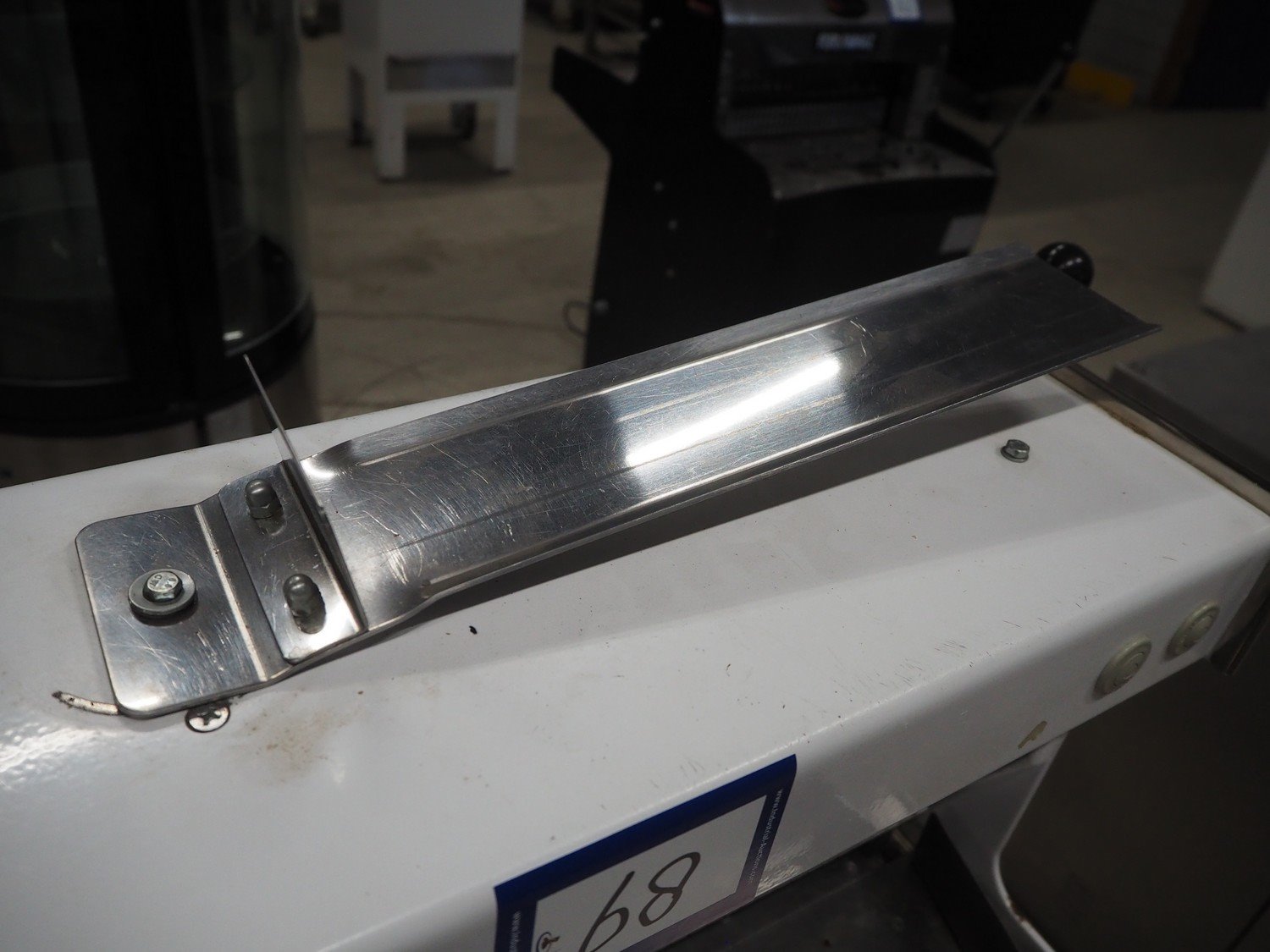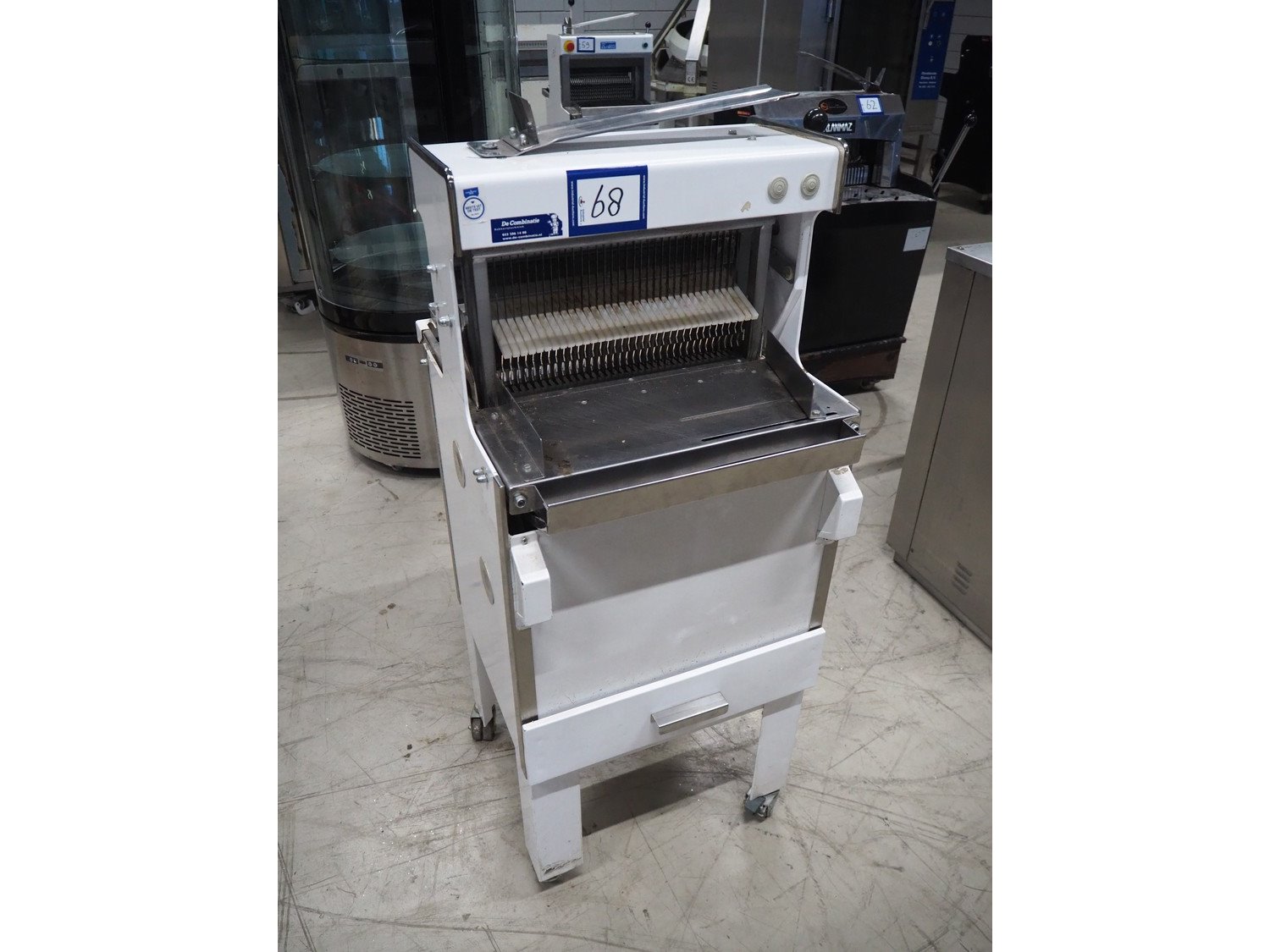 Mobile bread slicer, 34 knives, distance between knives: 12 mm, total dimensions: 640 mm x 660 mm x 1230 mm. Kavel locatie: Looyenbeemd 11, 5652 BH Eindhoven, Nederland