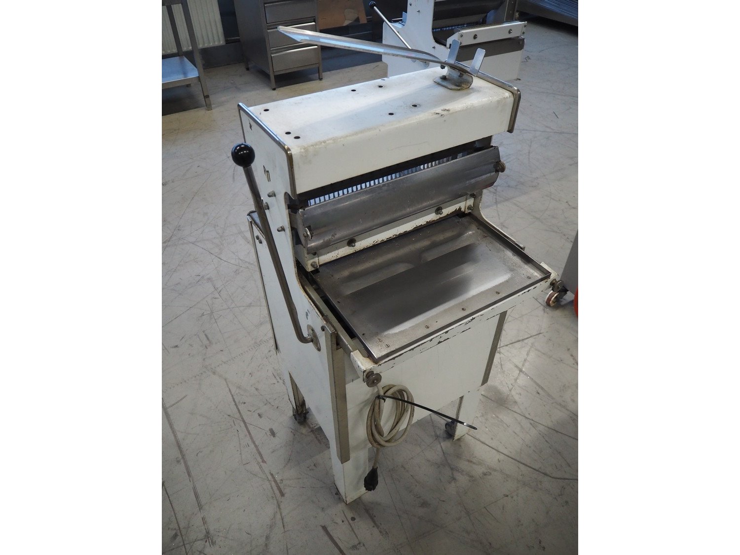 Mobile bread slicer, 34 knives, distance between knives: 12 mm, total dimensions: 550 mm x 660 mm x 1390 mm. Kavel locatie: Looyenbeemd 11, 5652 BH Eindhoven, Nederland
