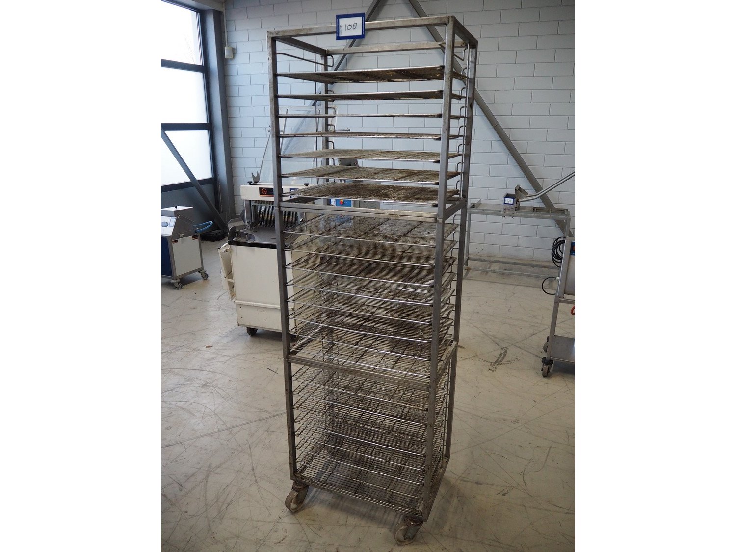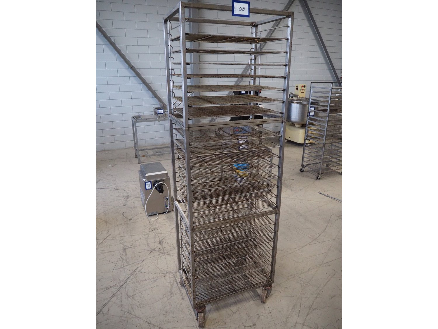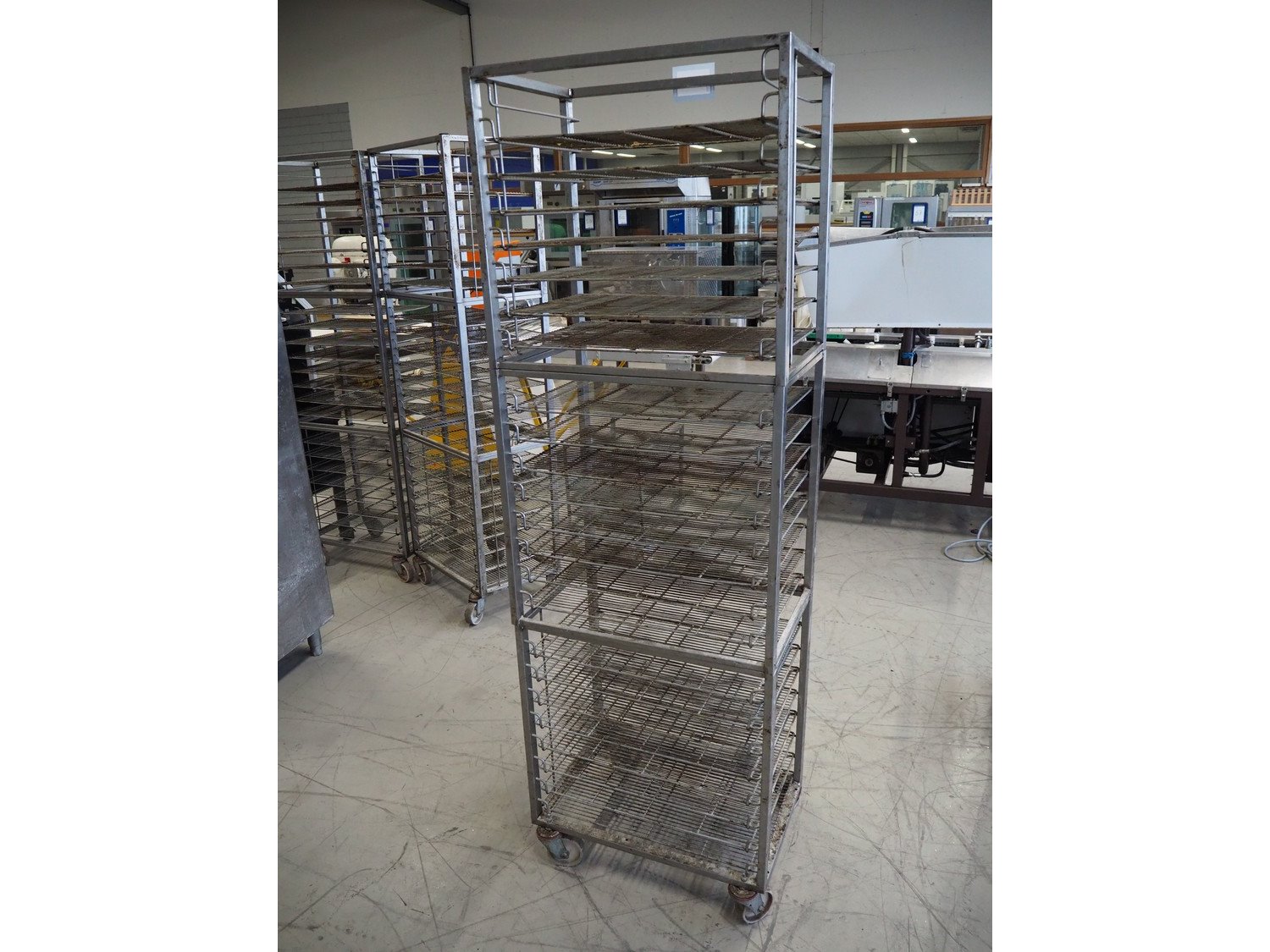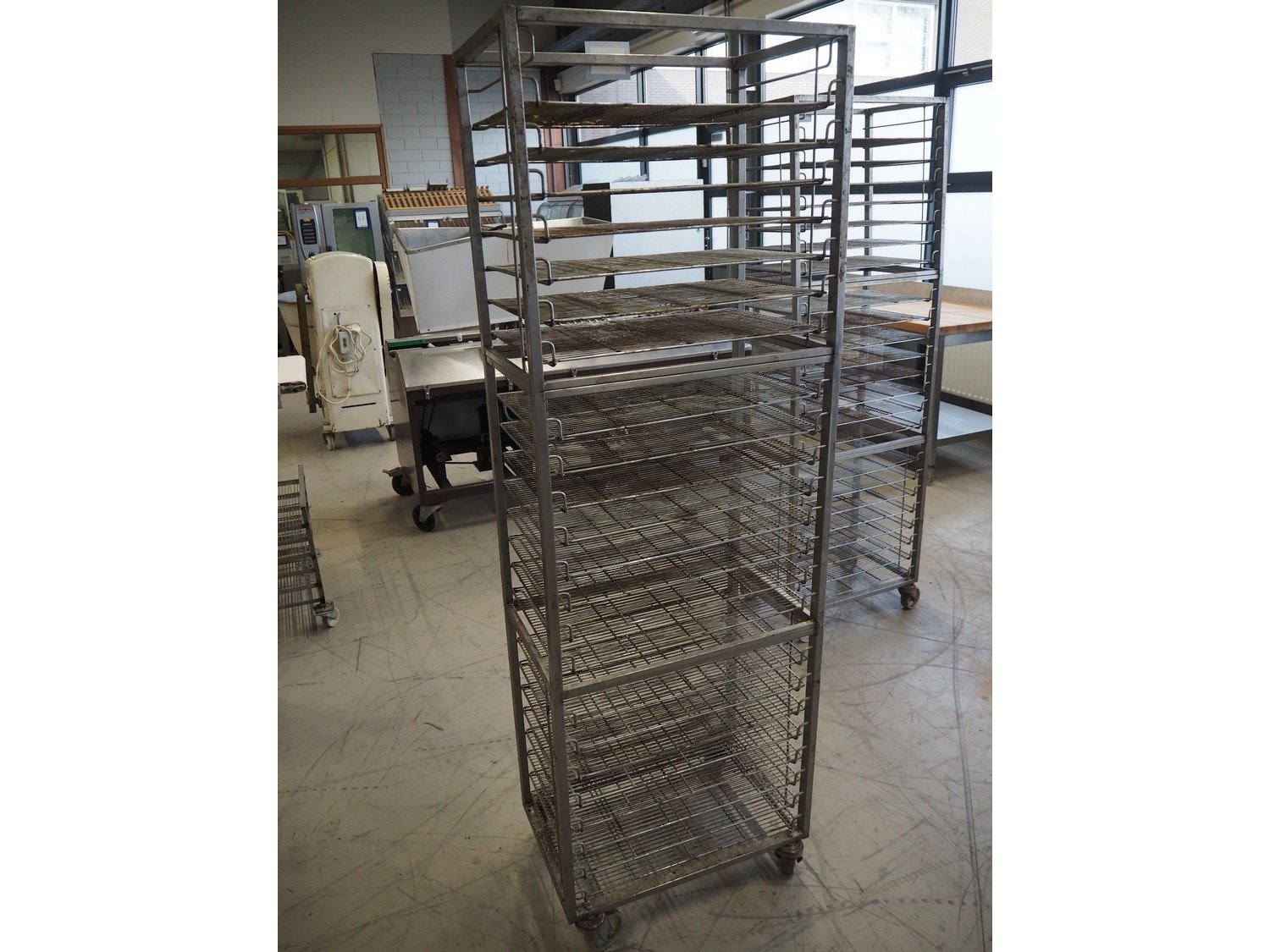 S/s trolley, 23 floors, dimensions floors: 650 mm x 420 mm, total dimensions: 660 mm x 420 mm x 1970 mm. Including 23 s/s racks. Kavel locatie: Looyenbeemd 11, 5652 BH Eindhoven, Nederland