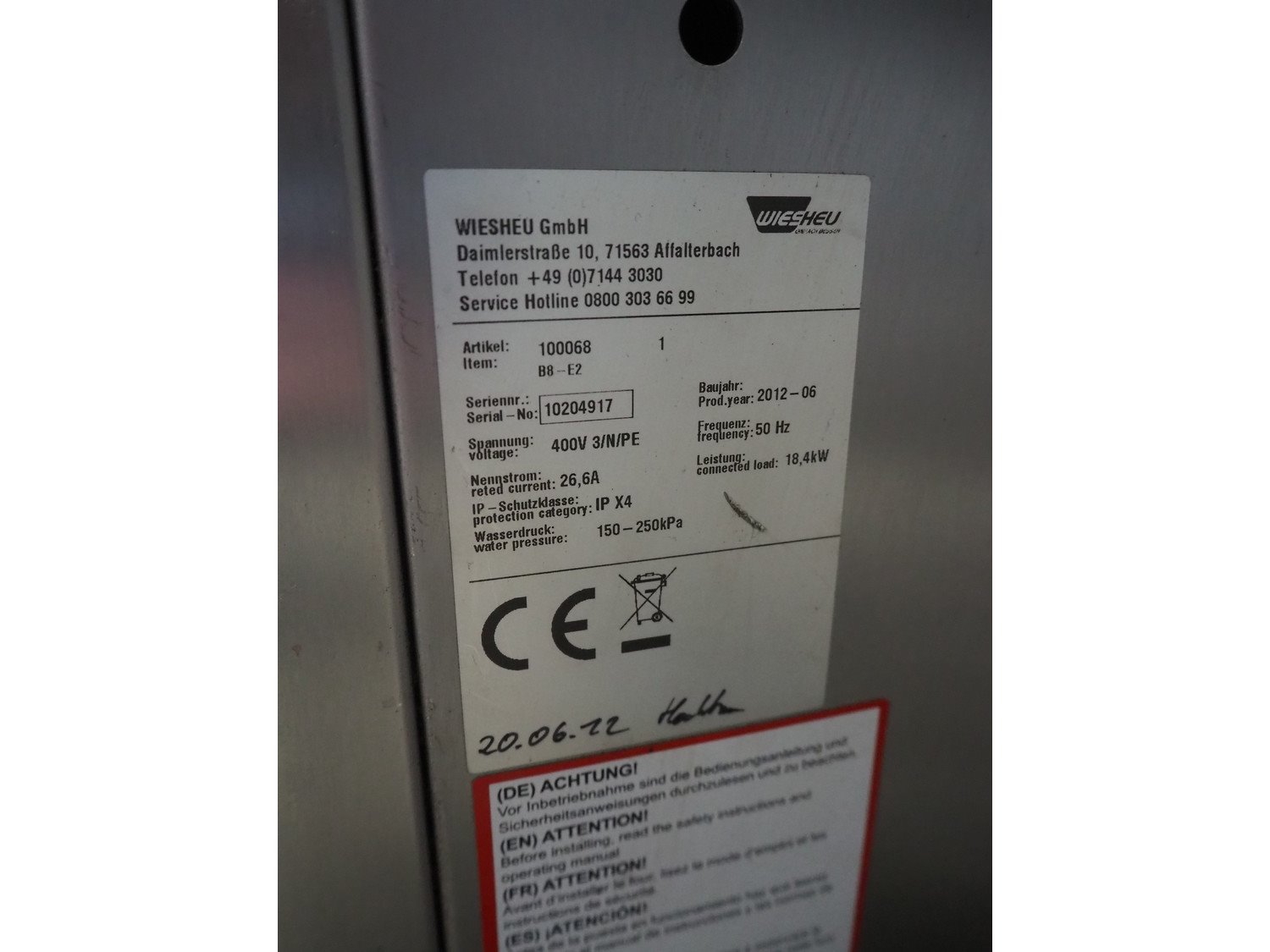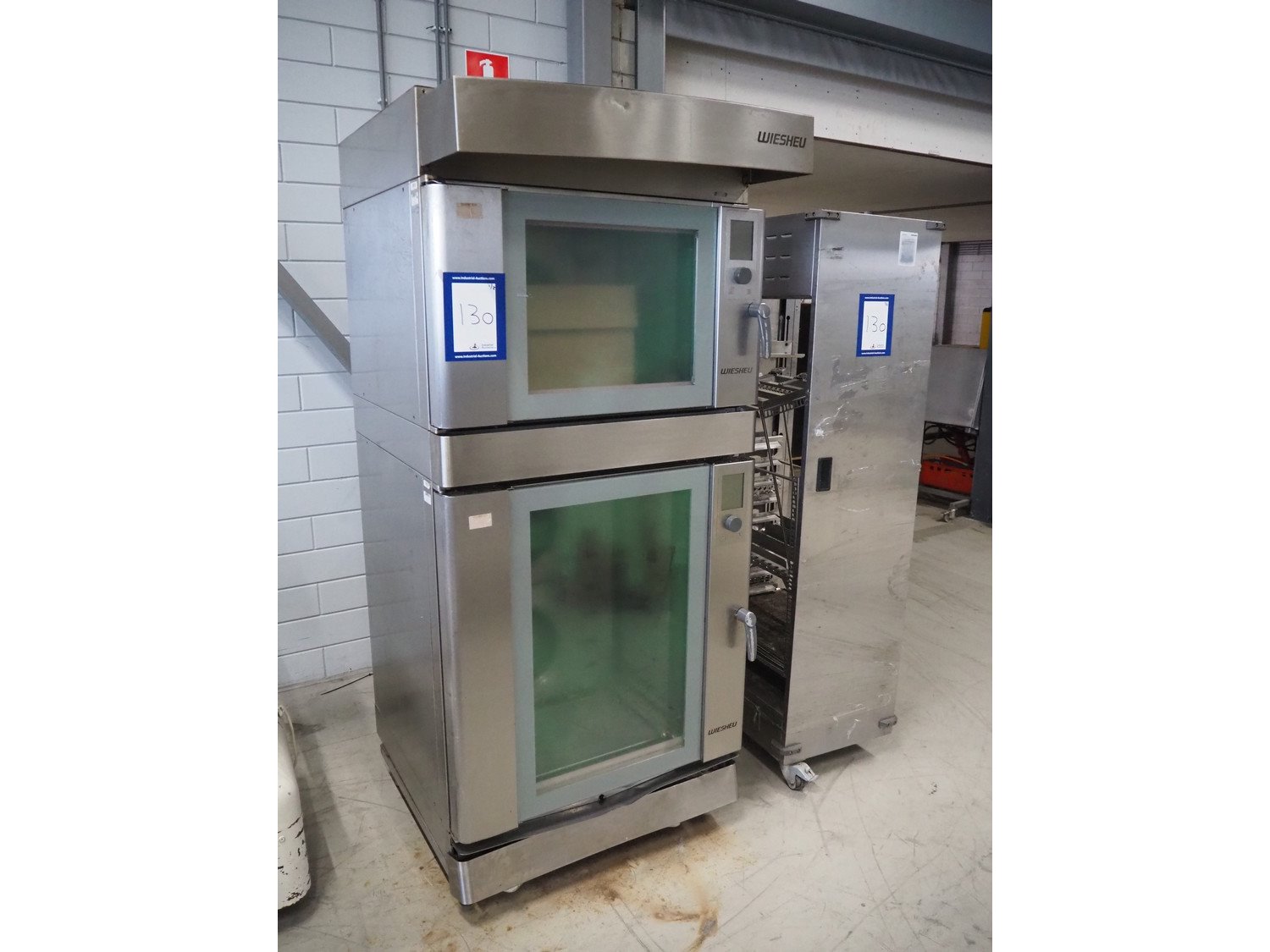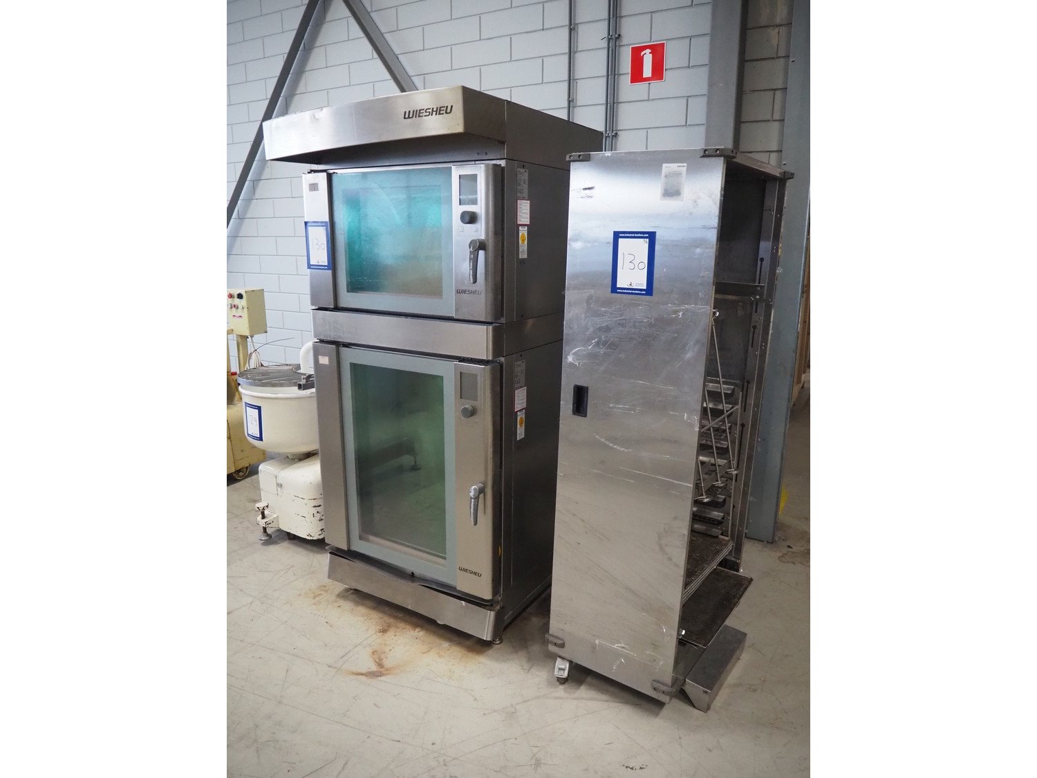 Wiesheu GmbH double stacked oven, type top oven: B4-E2, serial number: 10204883, year of construction: 2012, 400 V, 3 Ph, 50 Hz, 9.2 kW, 13 A, type bottom oven: B8-E2, serial number: 10204917, year of construction: 2012, 400 V, 50 Hz, 26.6 A, 18.4 kW, dimensions: 1100 mm x 950 mm x 2110 mm. Including WIESHEU GmbH tray loading trolley, dimensions: 500 mm x 750 mm x 1920 mm. Incomplete. Kavel locatie: Looyenbeemd 11, 5652 BH Eindhoven, Nederland