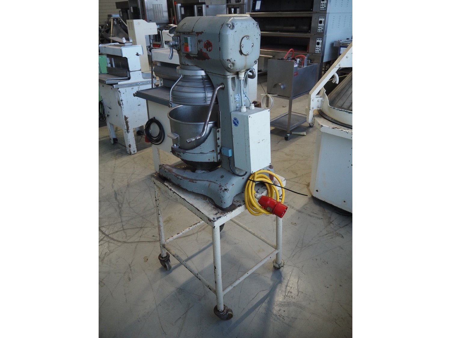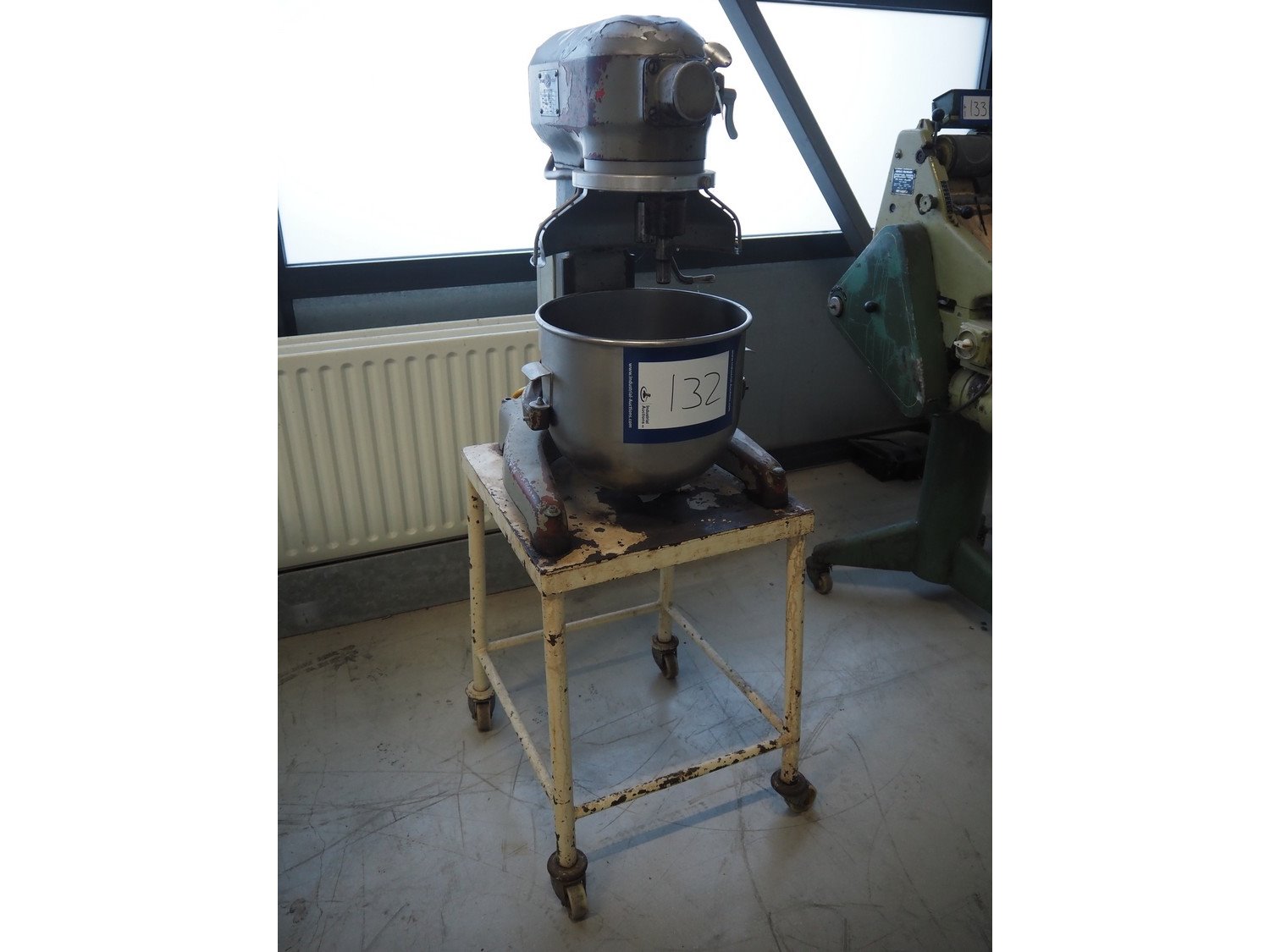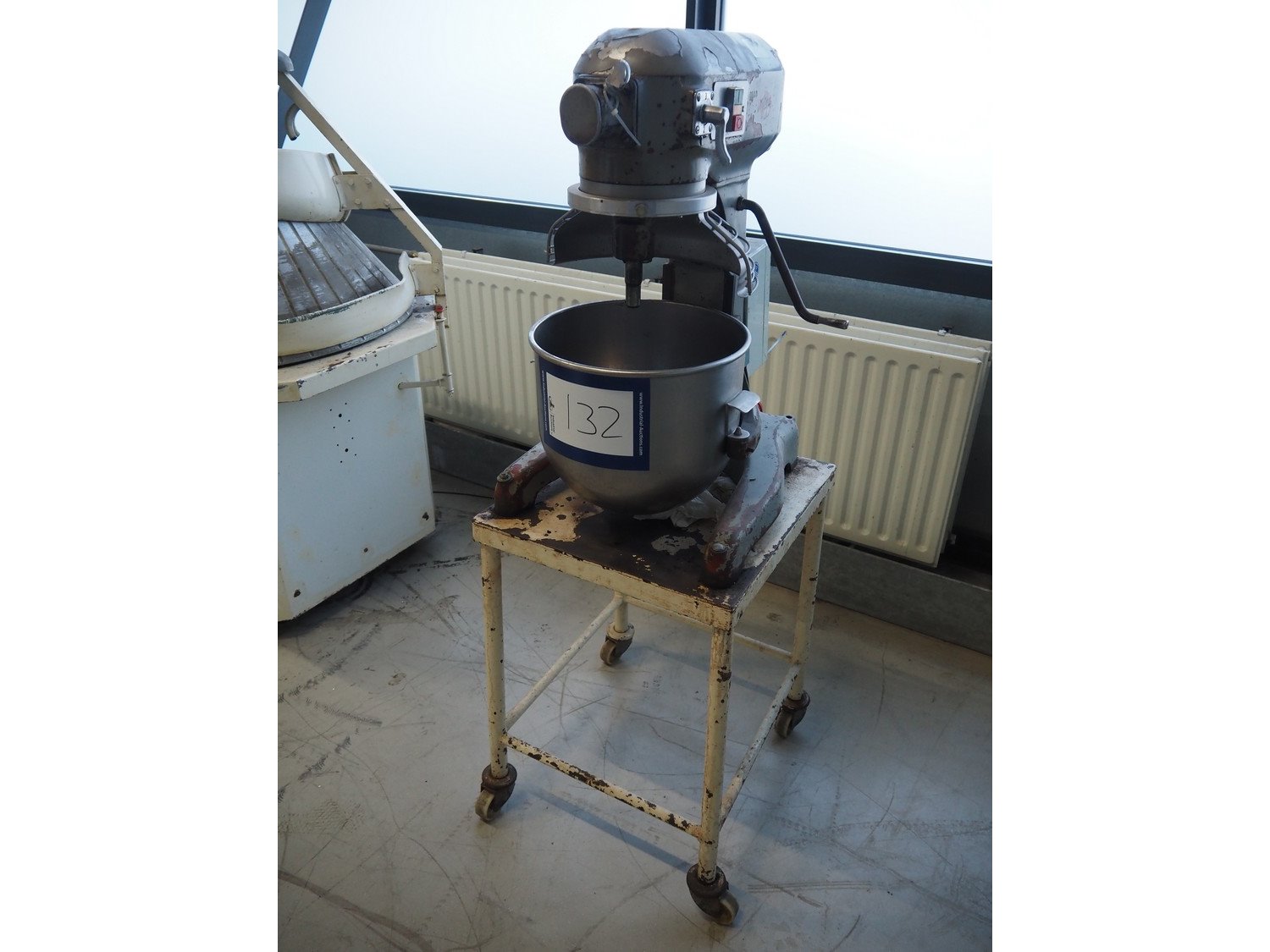 Hobart mixer on steel trolley, model: A200, number: 934682, 380 V, 3 Ph, 50 Hz, 0.98 A, 368 W, inside dimensions: Ø 320 mm x 280 mm, total dimensions: 480 mm x 520 mm x 1430 mm. Including whisk, hook and flat beater. Kavel locatie: Looyenbeemd 11, 5652 BH Eindhoven, Nederland