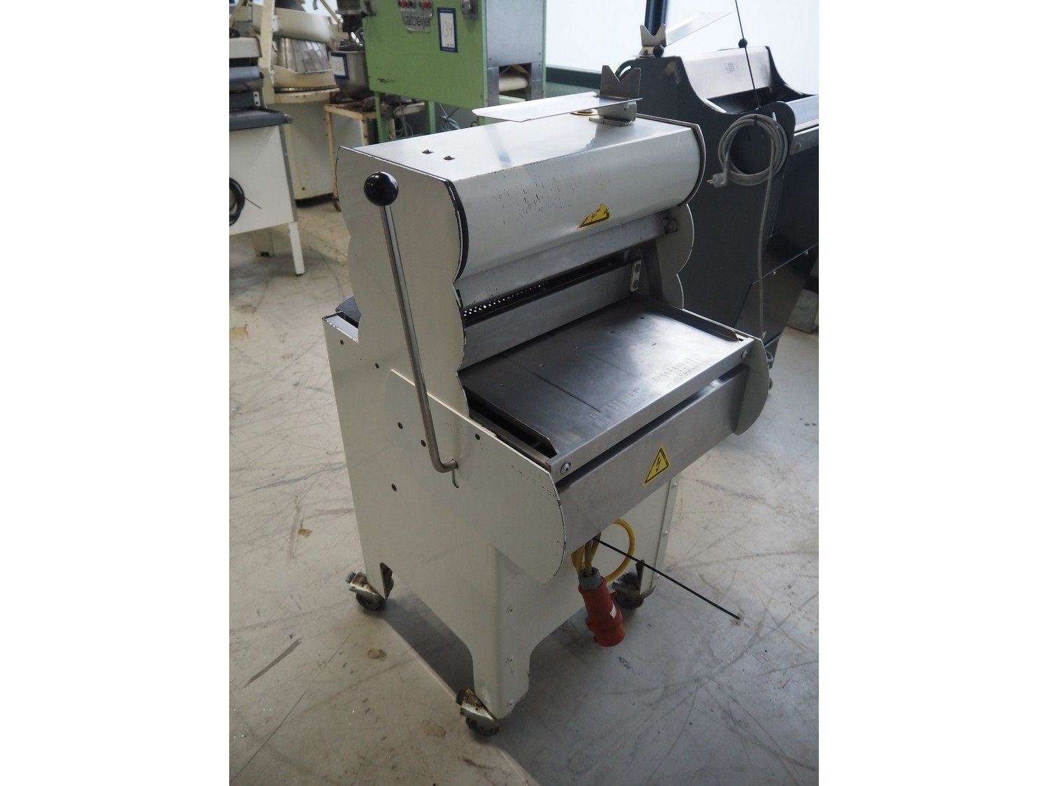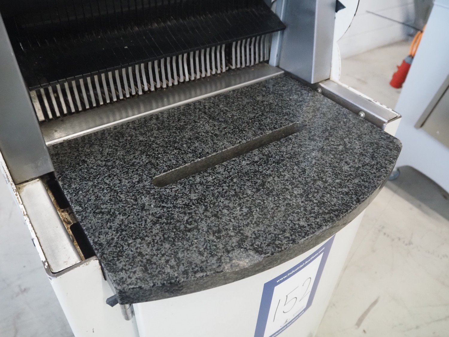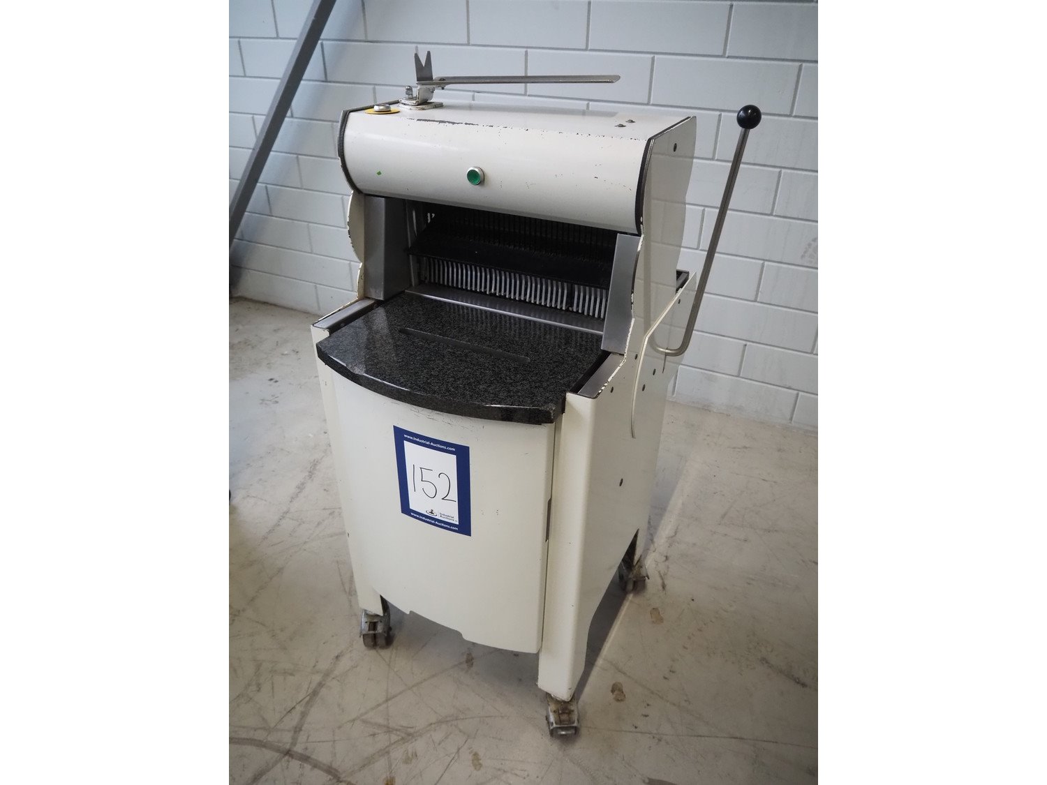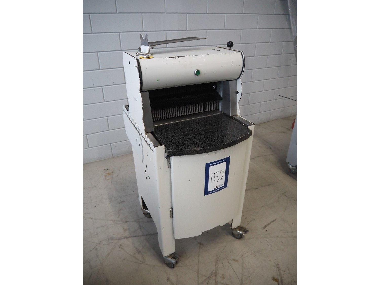 VLB mobile bread slicer, type: A Granit 45 11, number: 5860, year of construction: 2006, 230/400 V, 50 Hz, 0.56 kW, 38 knives, distance between knives: 11 mm, working width: 420 mm, total dimensions: 750 mm x 660 mm x 1270 mm. Kavel locatie: Looyenbeemd 11, 5652 BH Eindhoven, Nederland