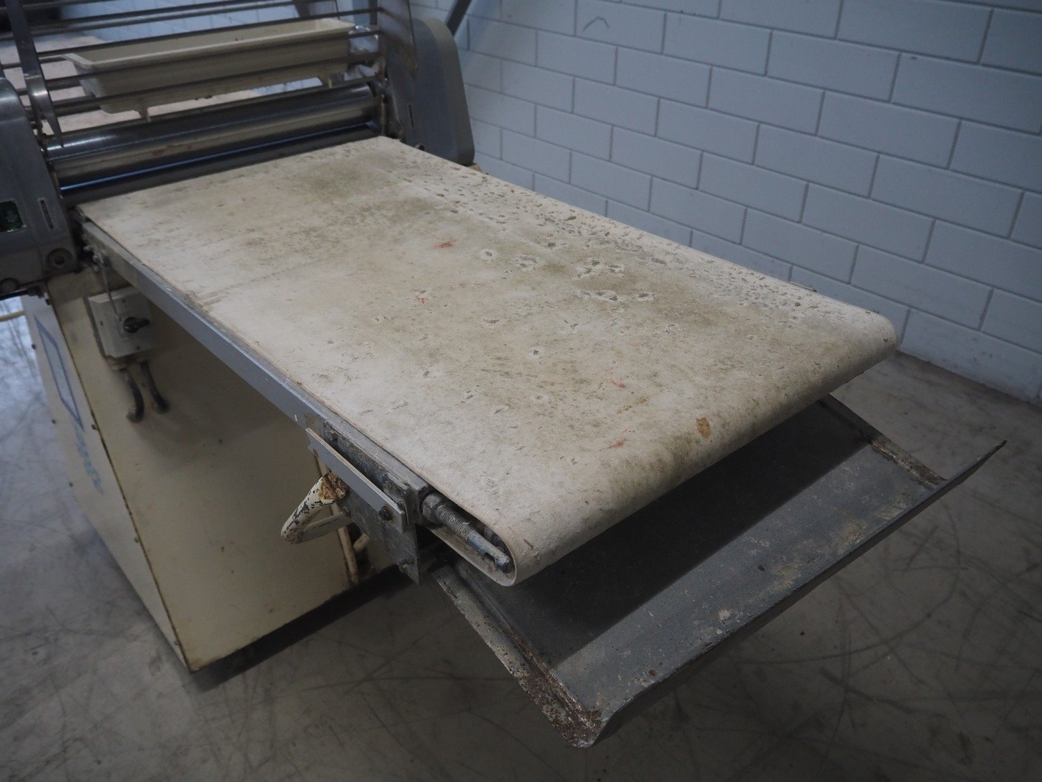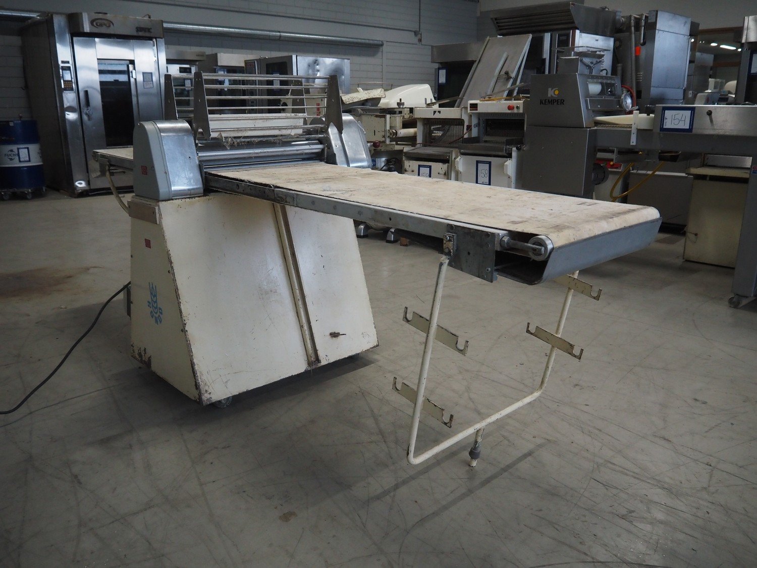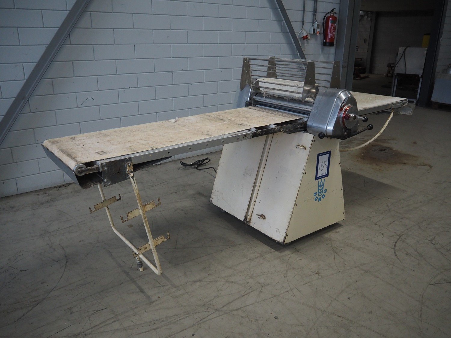 Seewer Rondo mobile dough sheeter, type: AUT 604, model: S, serie: 70184, machine number: 2782, cloth belt, belt width: 550 mm, total dimensions: 3000 mm x 1150 mm x 1290 mm. Kavel locatie: Looyenbeemd 11, 5652 BH Eindhoven, Nederland