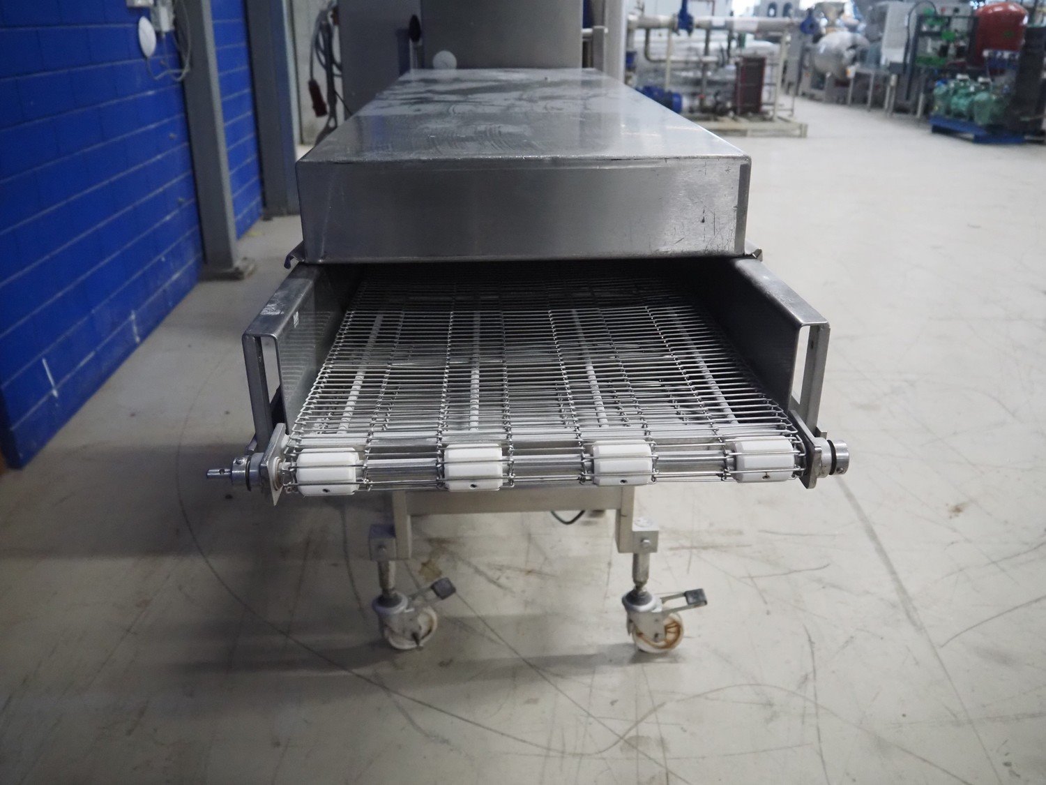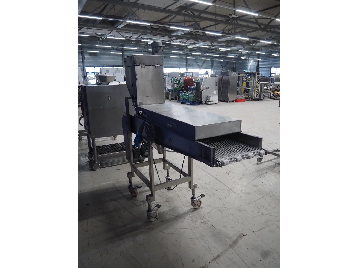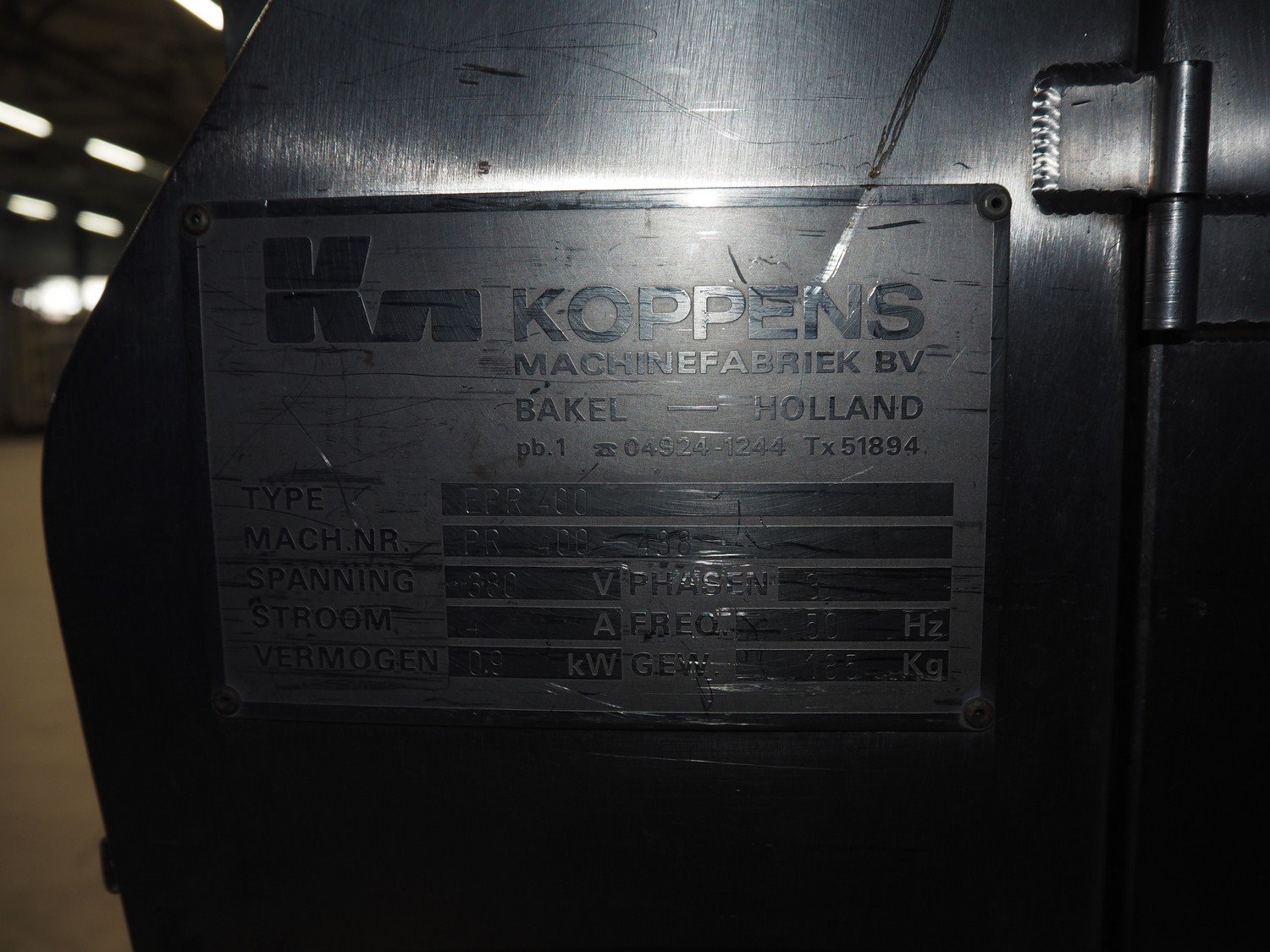 Koppens mobile battering machine, type: EPR 400, machine number: PR 400/438, 380 V, 3 Ph, 50 Hz, 4 A, 0.9 kW, weight: 185 kg, s/s mesh belt, belt width: 400 mm, total dimensions: 2100 mm x 700 mm x 1900 mm. Kavel locatie: Looyenbeemd 11, 5652 BH Eindhoven, Nederland