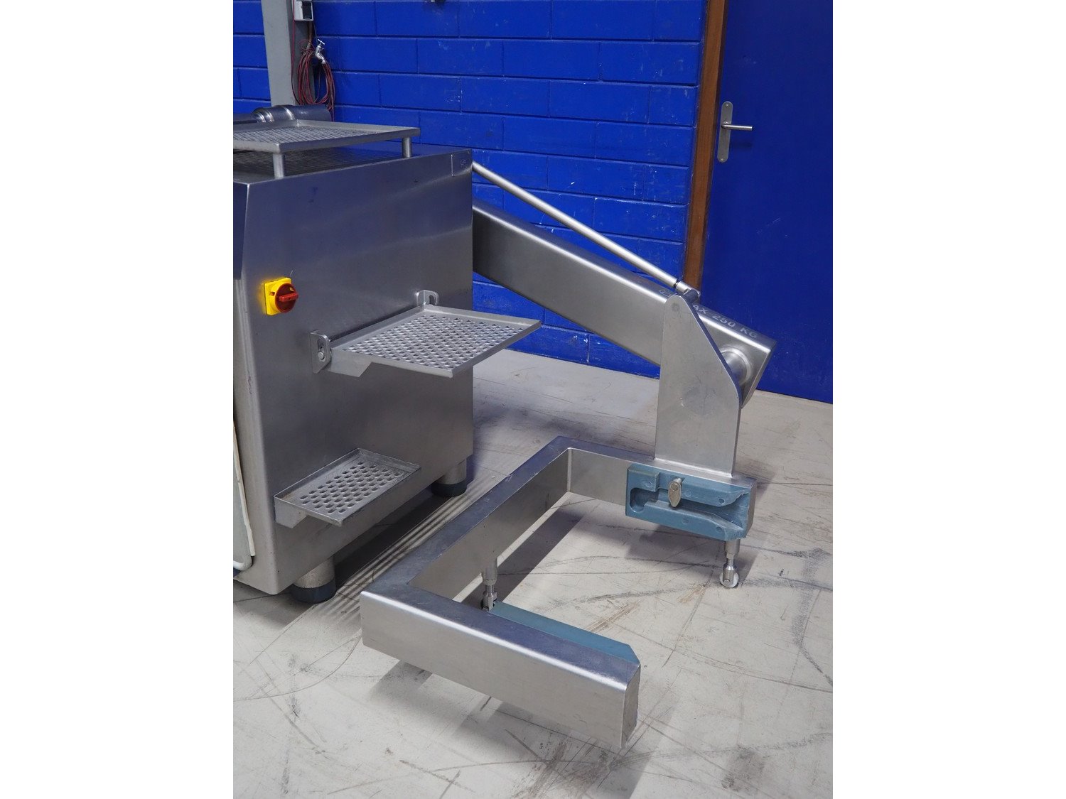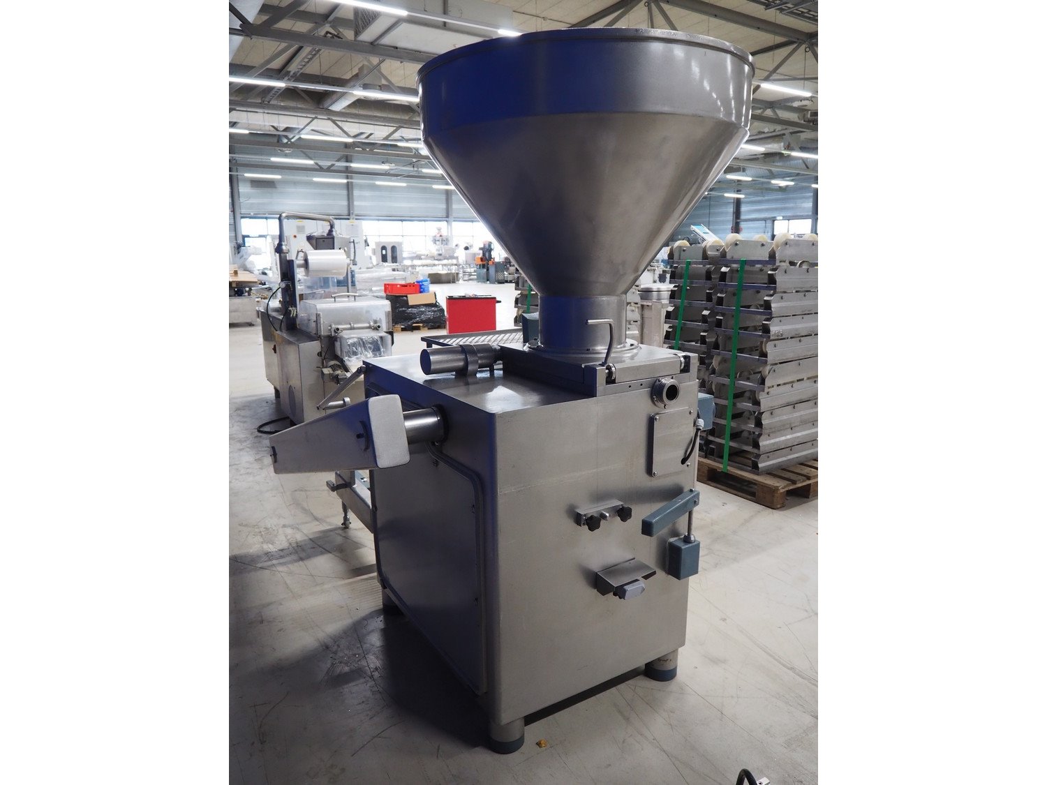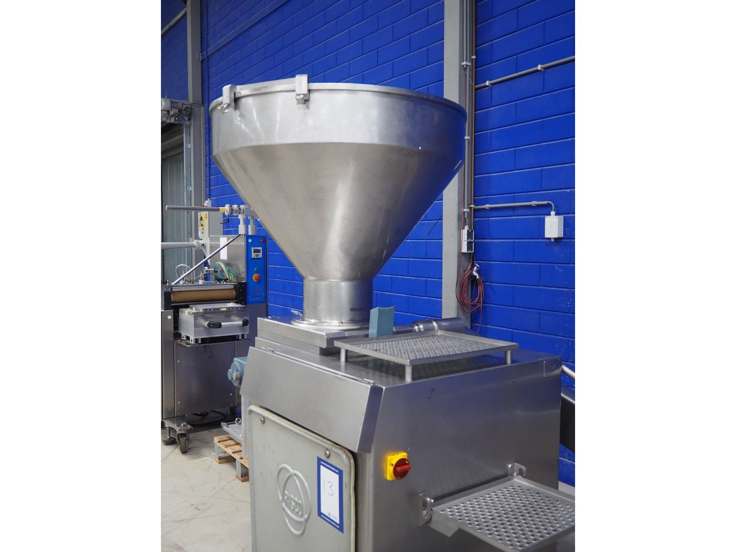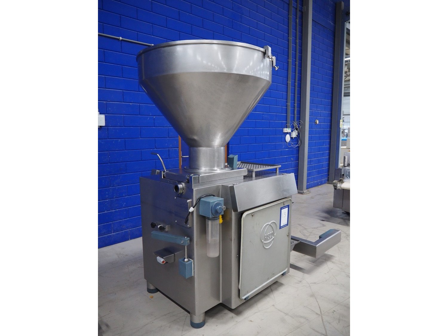 Risco S.p.a. vacuum filling machine with lifter for 200 liter meat bins, model: RS 5001, serial number: C100005, year of construction: 2000, 575 V, 3 Ph, 60 Hz, 12.5 kW, weight: 1210 kg, dimensions: 2100 mm x 1200 mm x 2070 mm. Without vacuum pump. Kavel locatie: Looyenbeemd 11, 5652 BH Eindhoven, Nederland