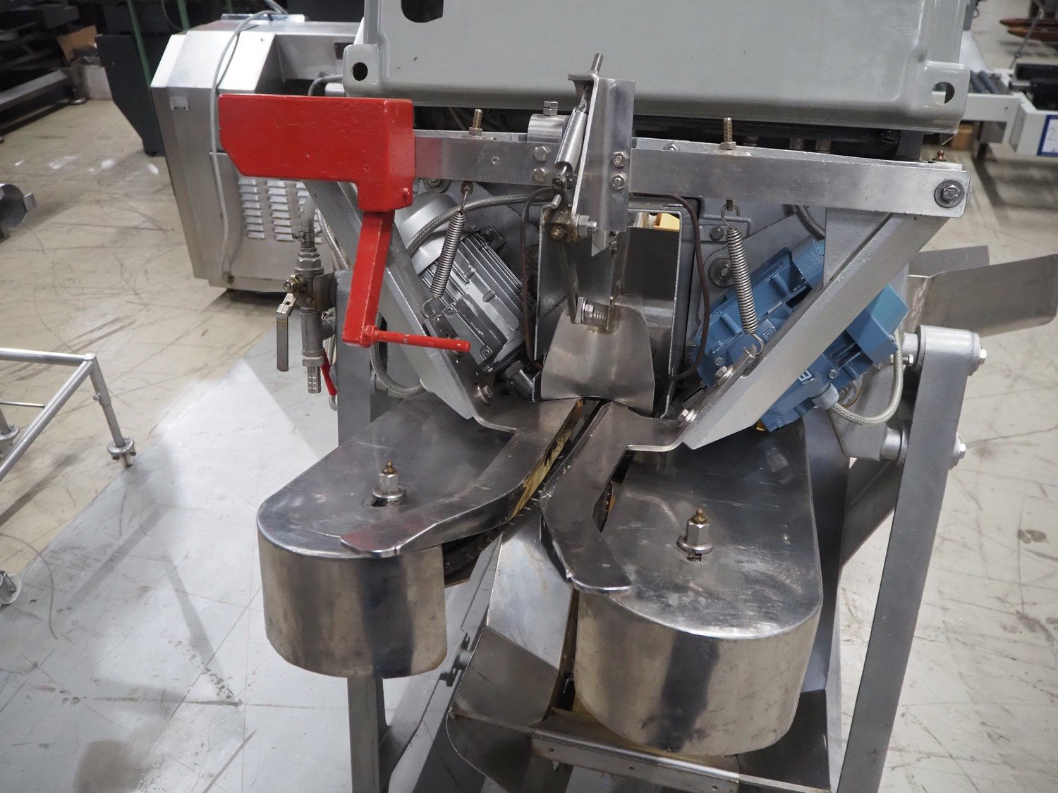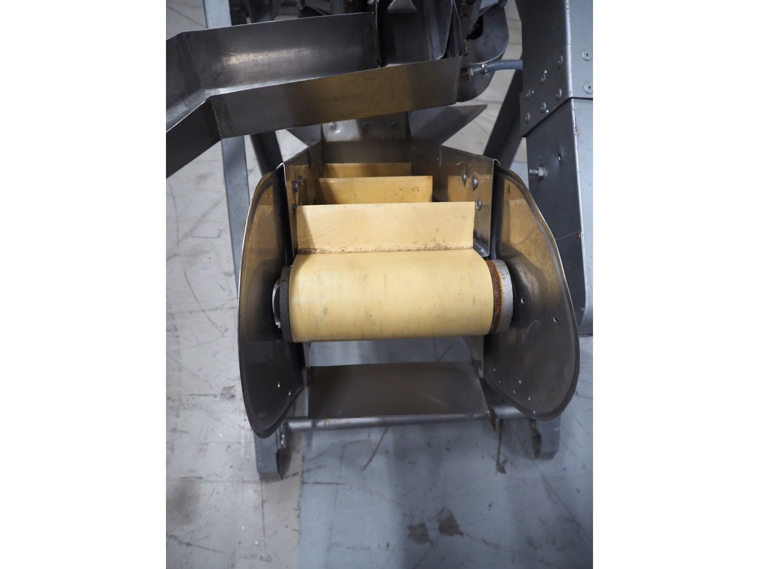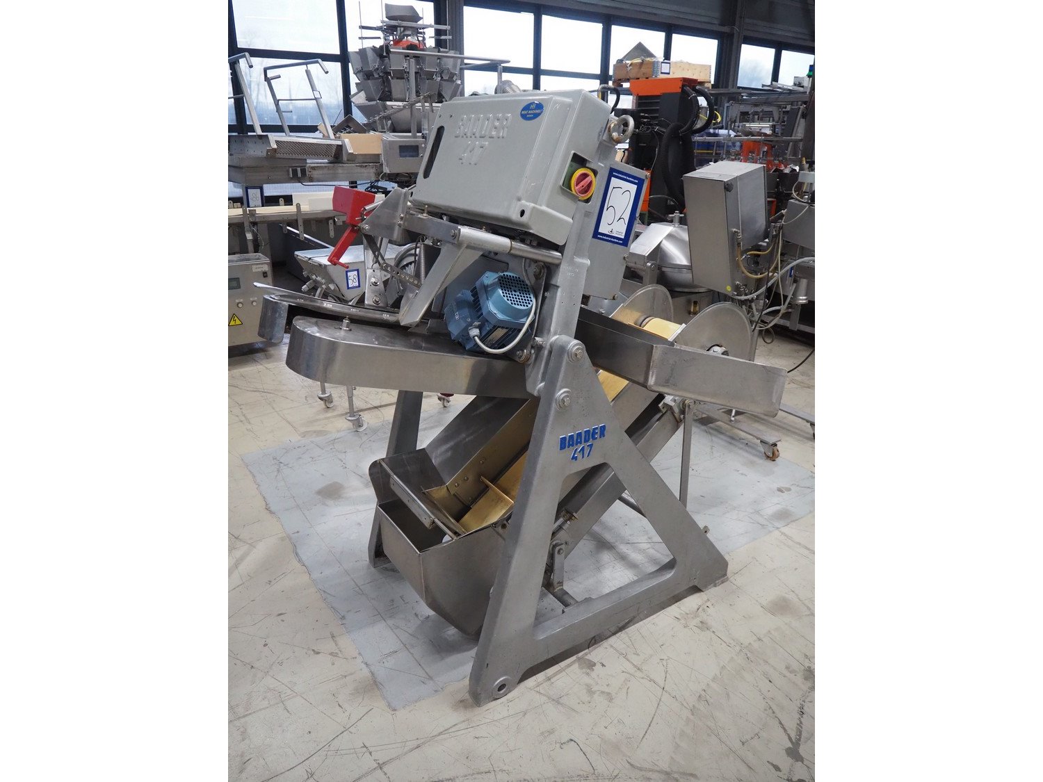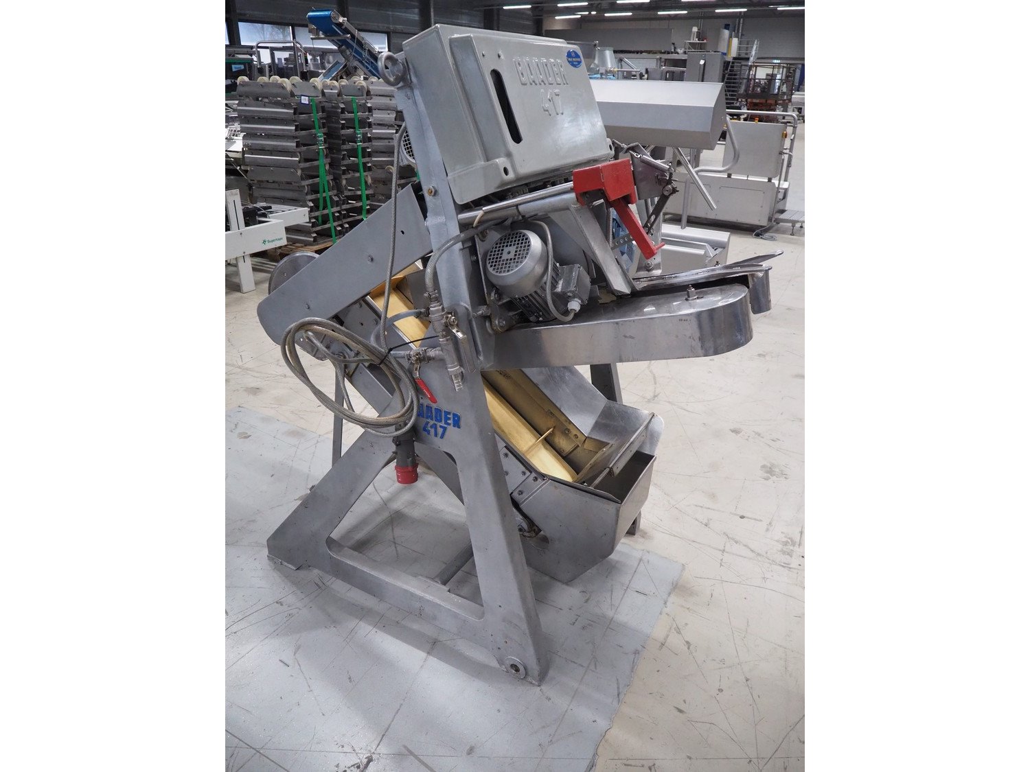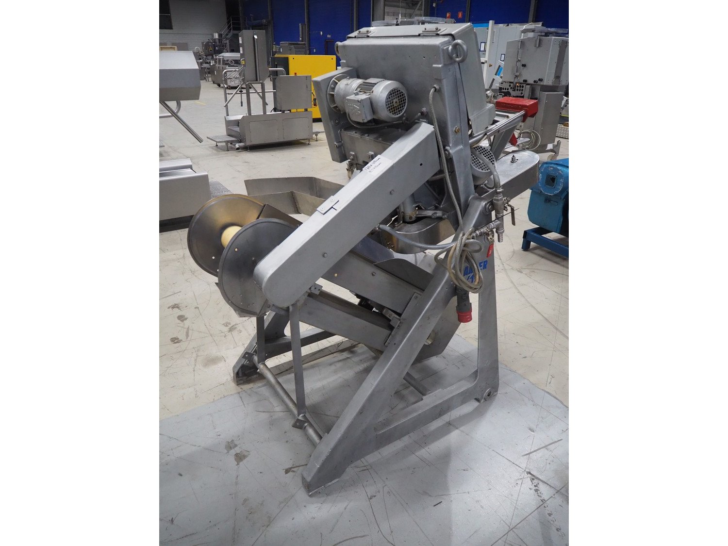 Baader V-cut deheader, type: 417, knife diameter: (2x) 200 mm, plastic belt, belt width: 280 mm, divider height: 70 mm, distance between dividers: 900 mm, elevating height: 1200 mm, total dimensions: 1700 mm x 1100 mm x 1900 mm. Kavel locatie: Looyenbeemd 11, 5652 BH Eindhoven, Nederland