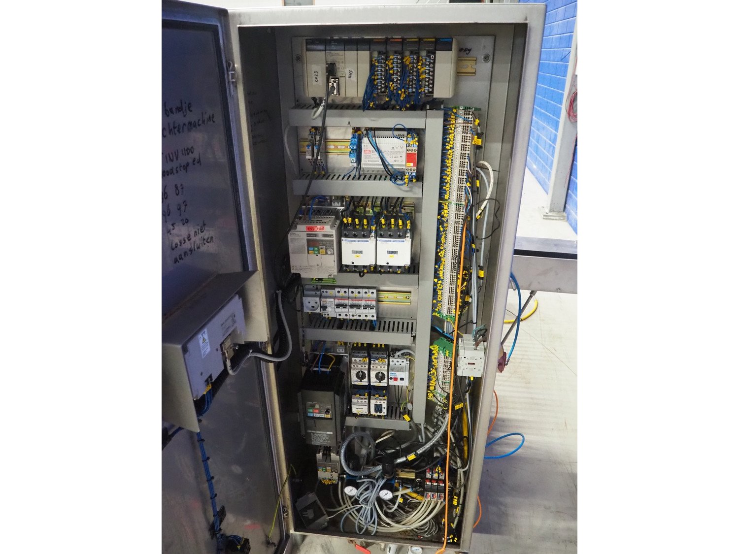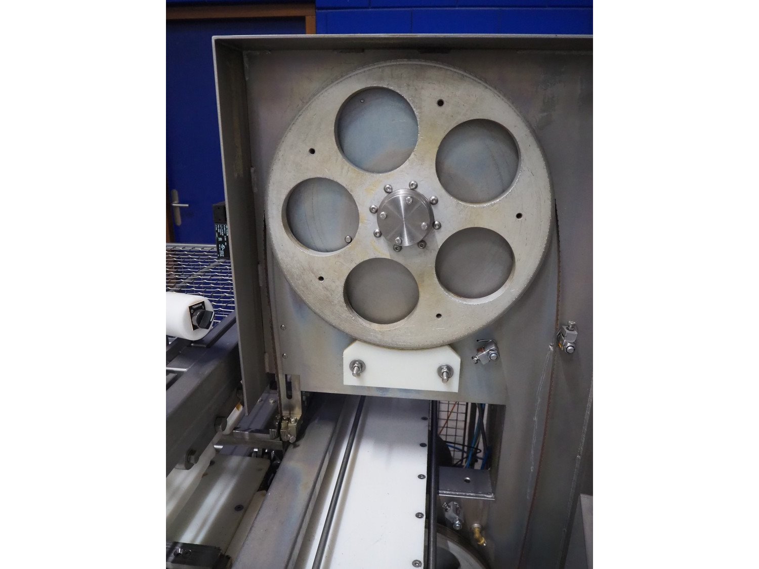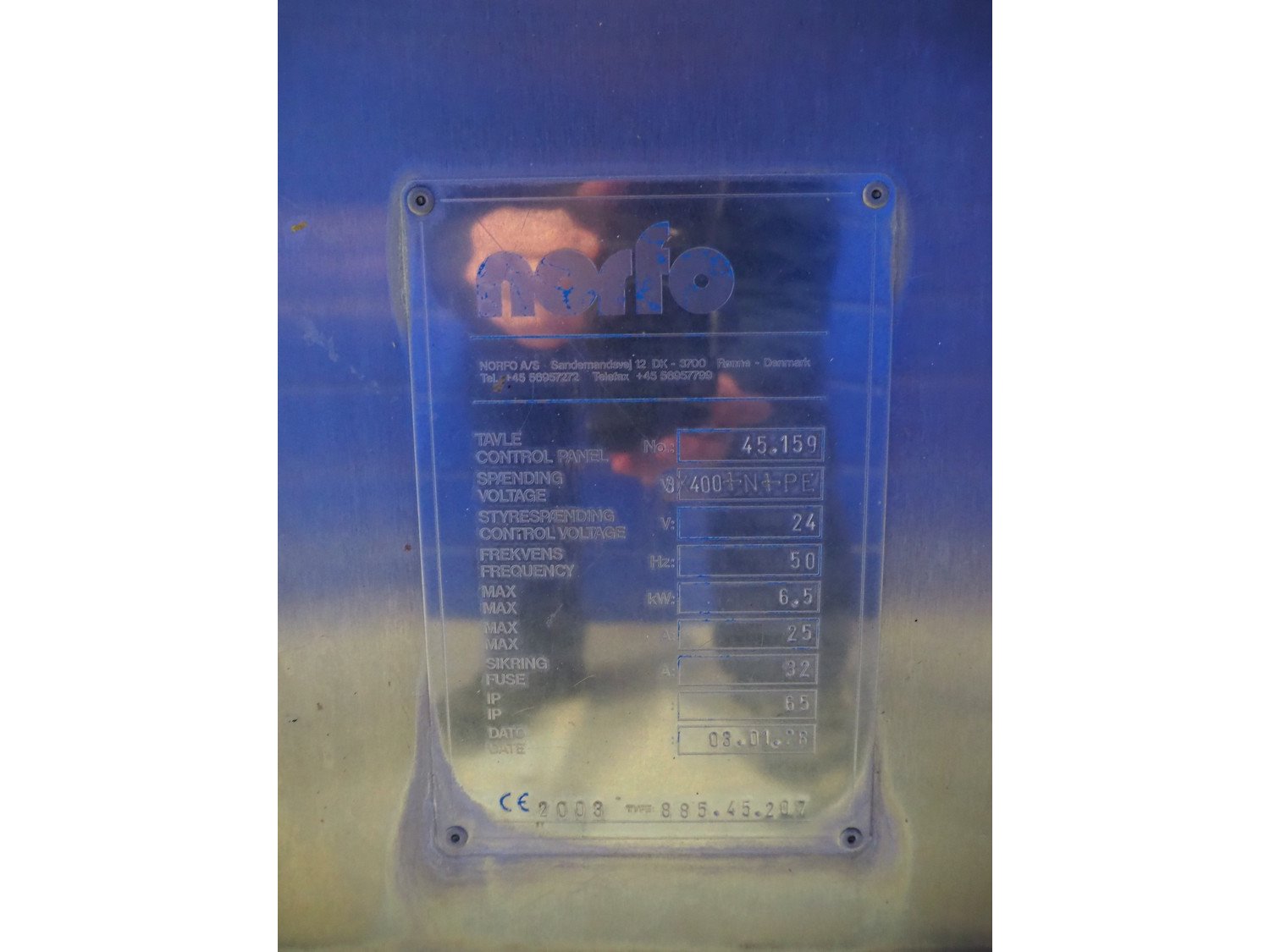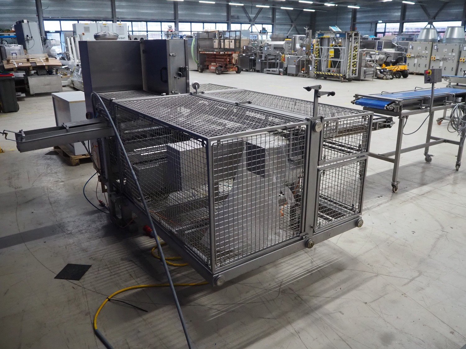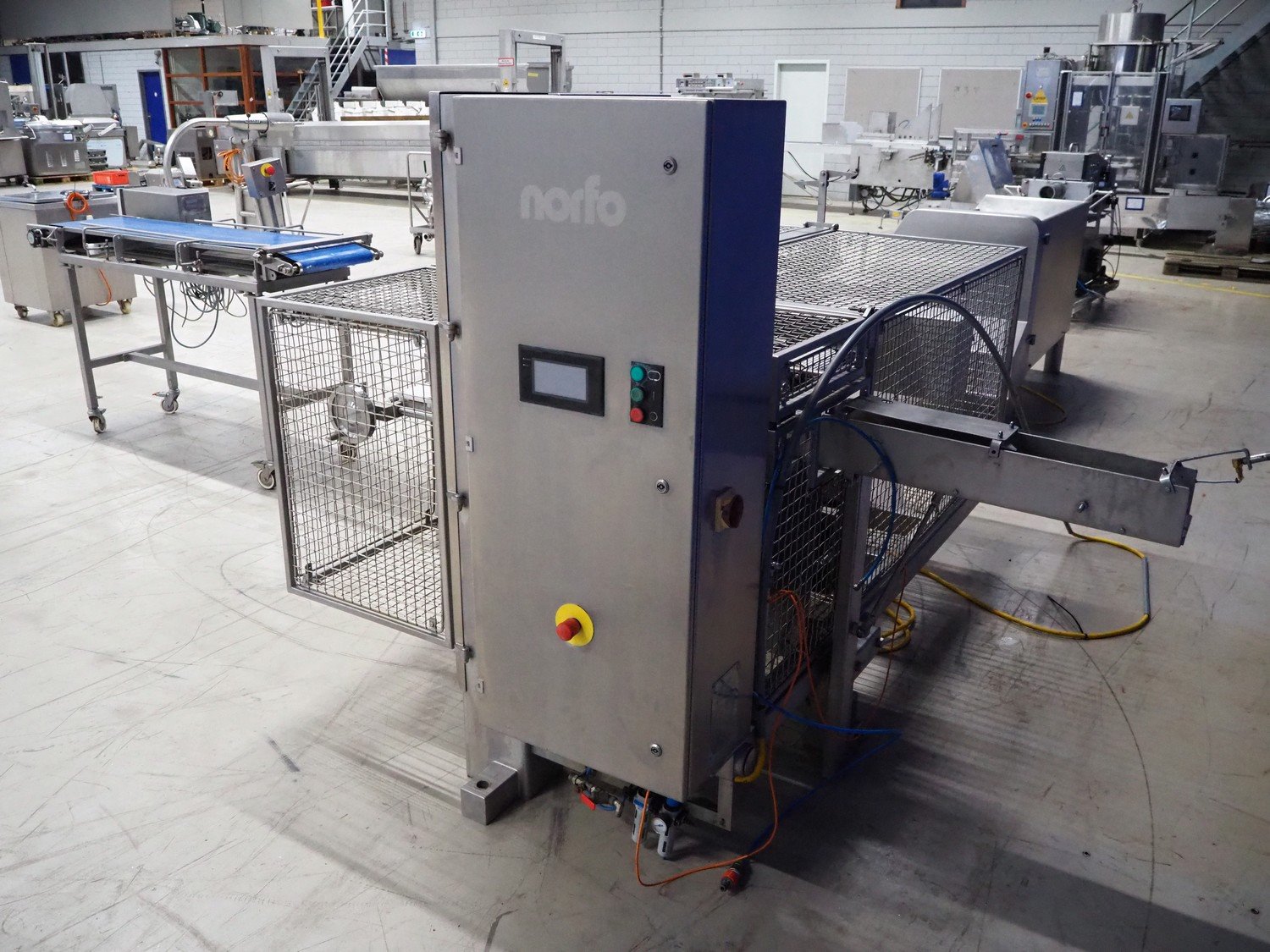 Norfo A/S automatic slicer for fish, type: 885.45.207, year of construction: 2003, 400 V, 3 Ph, 50 Hz, 25/32 A, 6.5 kW, plastic belts, belt width: 250 mm, total dimensions: 3600 mm x 2500 mm x 1600 mm. Including mobile infeed belt, number: 885.43.605, plastic belts, belt width: 380 mm, total dimensions: 2100 mm x 800 mm x 1400 mm. Slicer is missing belts. Including cabinet with parts. Kavel locatie: Looyenbeemd 11, 5652 BH Eindhoven, Nederland