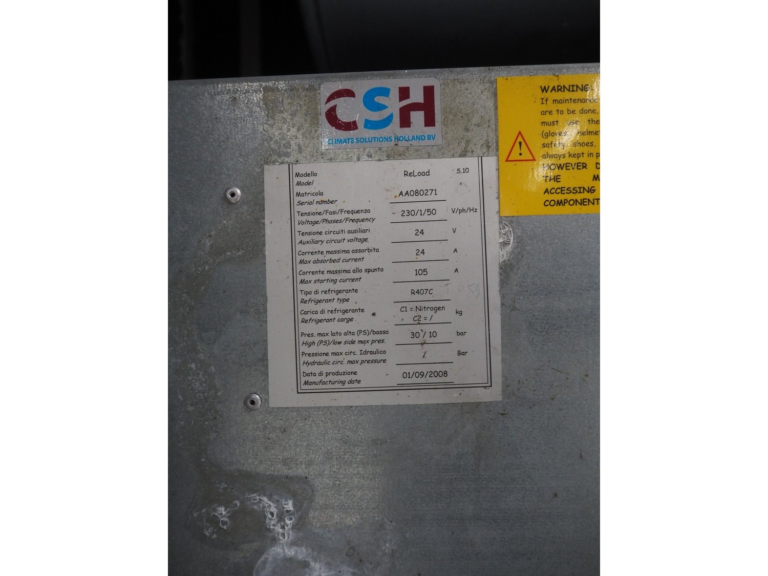 Hidros cooling unit, model: ReLoad S.10, serial number: AA080271, year of construction: 01/09/2008, 230 V, 1 Ph, 50 Hz, 24/105 A, refrigerant: R407C, dimensions: 800 mm x 500 mm x 2000 mm. Kavel locatie: Looyenbeemd 11, 5652 BH Eindhoven, Nederland