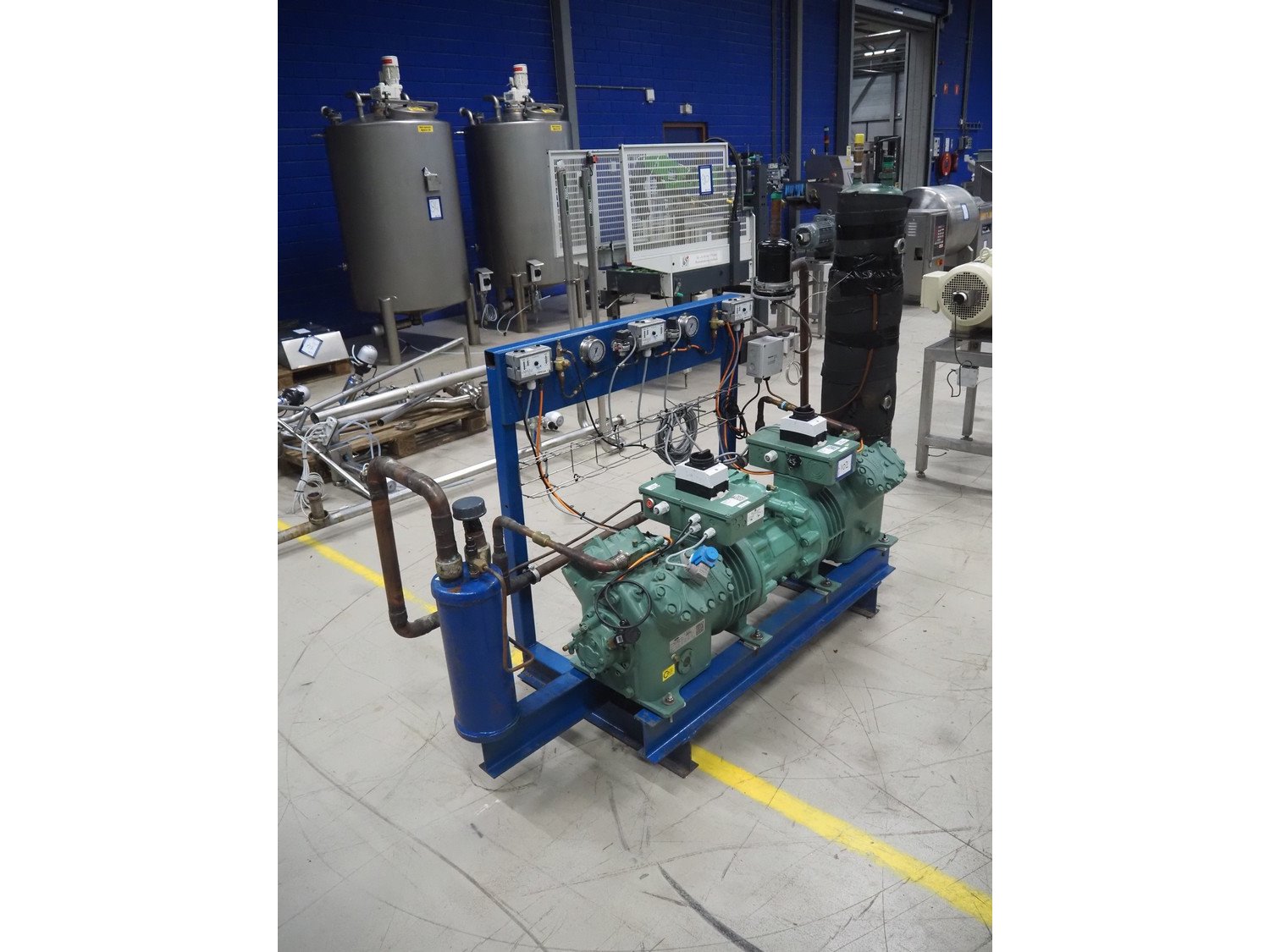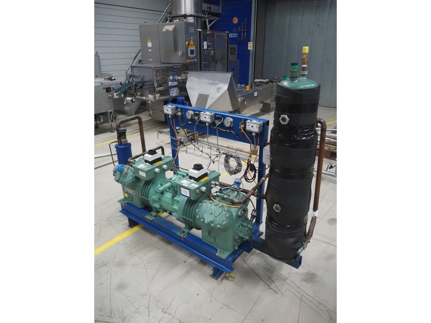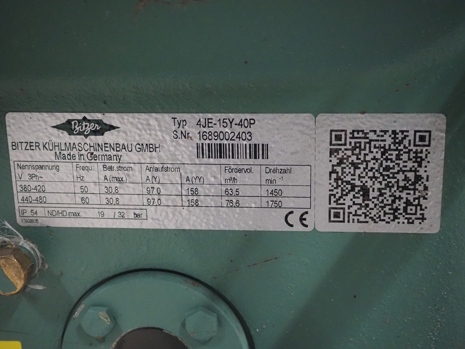 Bitzer Kühlmaschinenbau GmbH cooling compressor rack with 2 cooling compressors, type: (2x) 4JE-15Y-40P, serial number: 1689002402, 380/420/440/480 V, 3 Ph, 50/60 Hz, 30.8/97.0 A, capacity: 63.5/76.6 m³ per hour, dimensions: 2000 mm x 700 mm x 1600 mm. Kavel locatie: Looyenbeemd 11, 5652 BH Eindhoven, Nederland