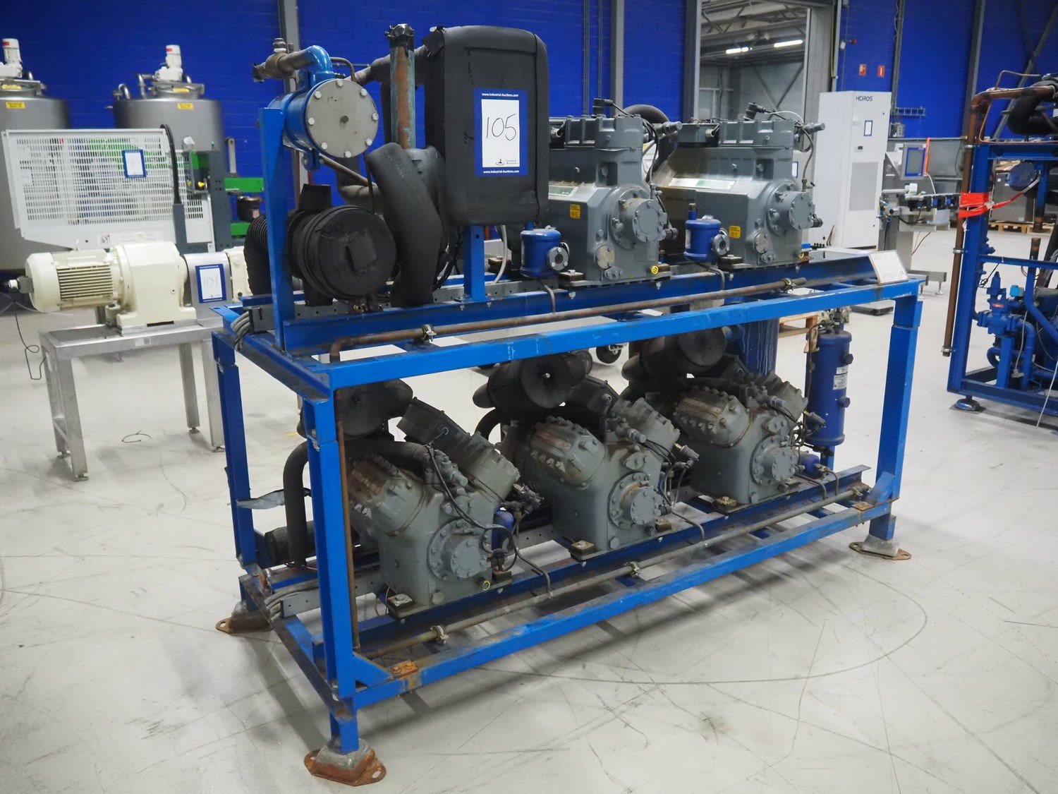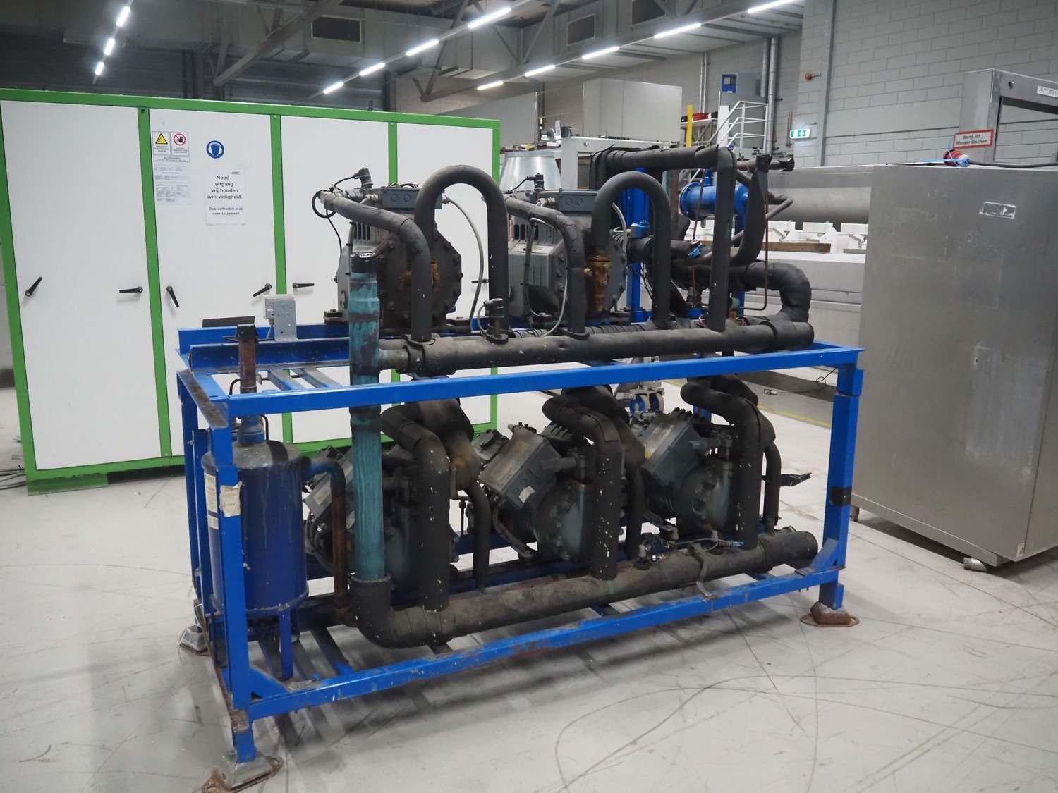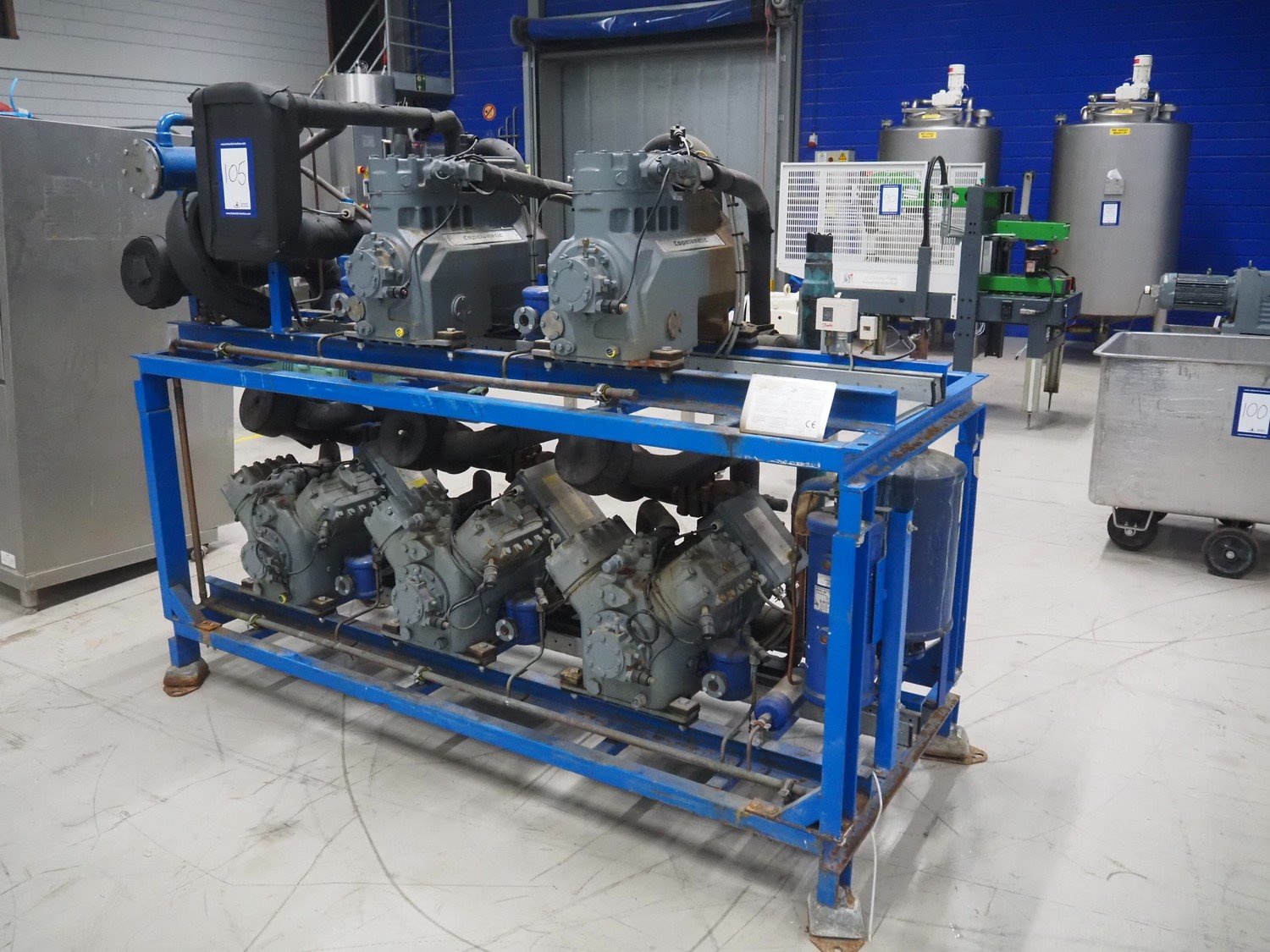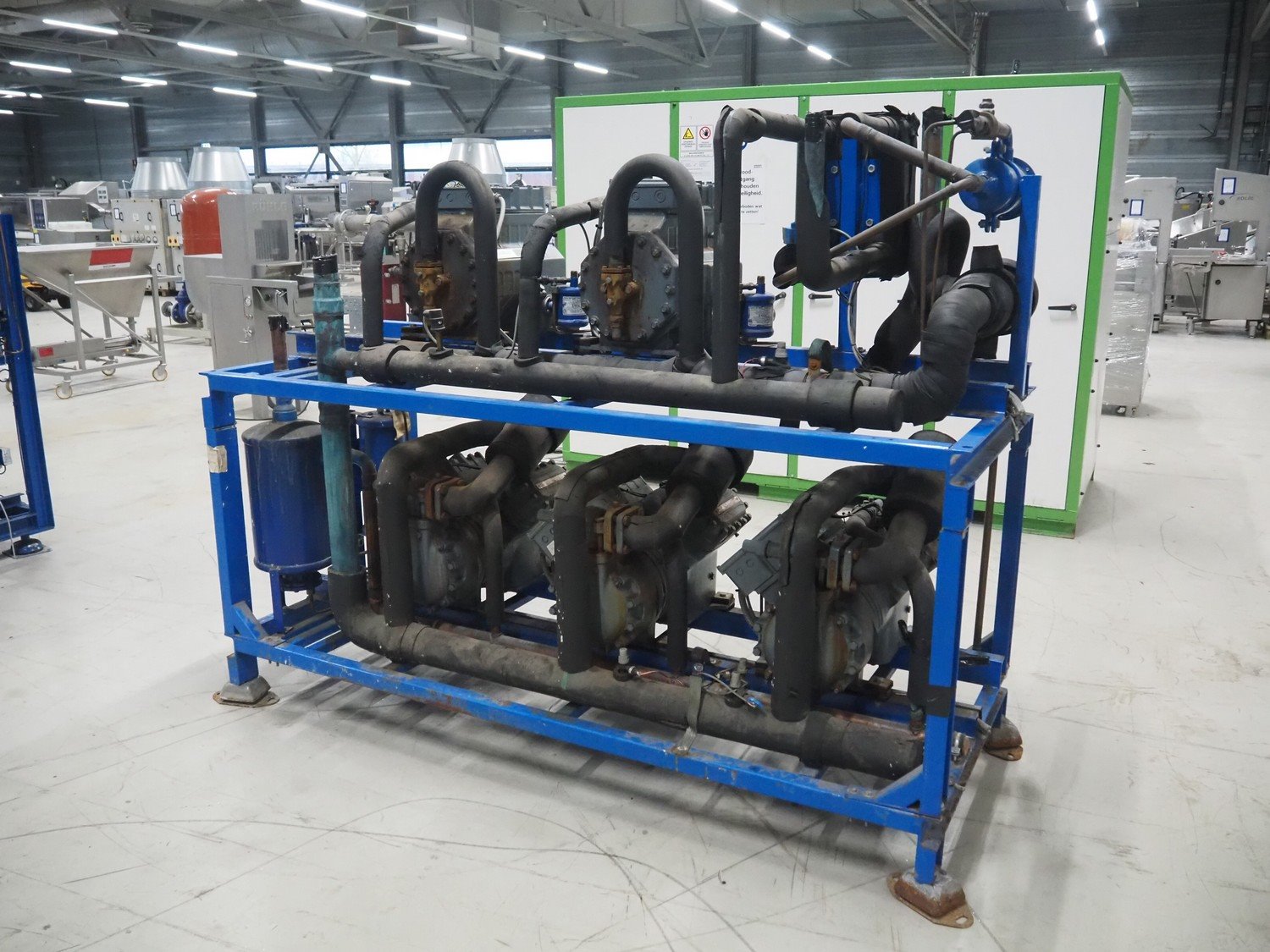 DMW Copeland compressor rack with 5 cooling compressors, type: (2x) D3SC1-75X-AWM/D, capacity: 37.90 m³ per hour, total dimensions: 2200 mm x 900 mm x 1800 mm. Kavel locatie: Looyenbeemd 11, 5652 BH Eindhoven, Nederland